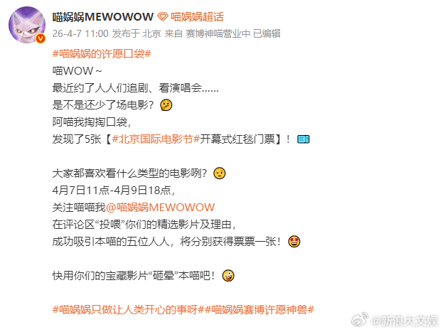喵娲娲送北影节开幕式红毯门票 送北影节开幕式红毯门票啦!评论区简直是宝藏影片库,不知道喵喵会先看哪一部呢?