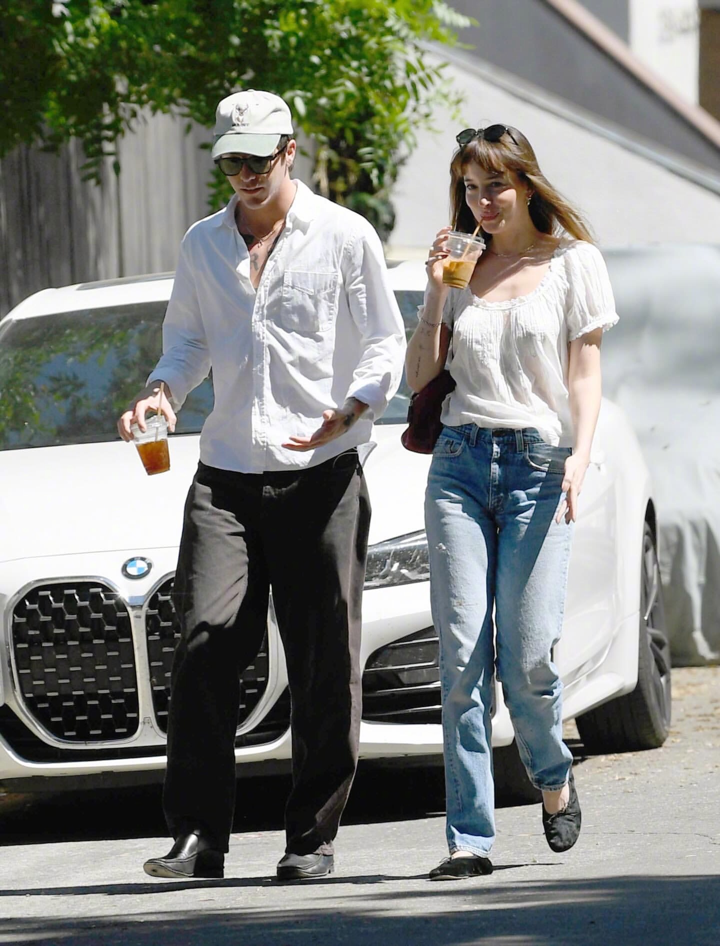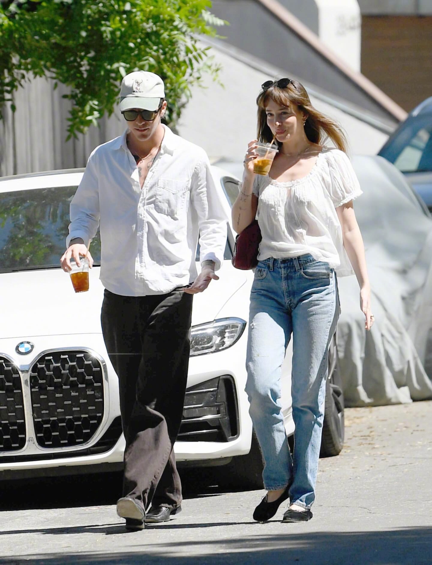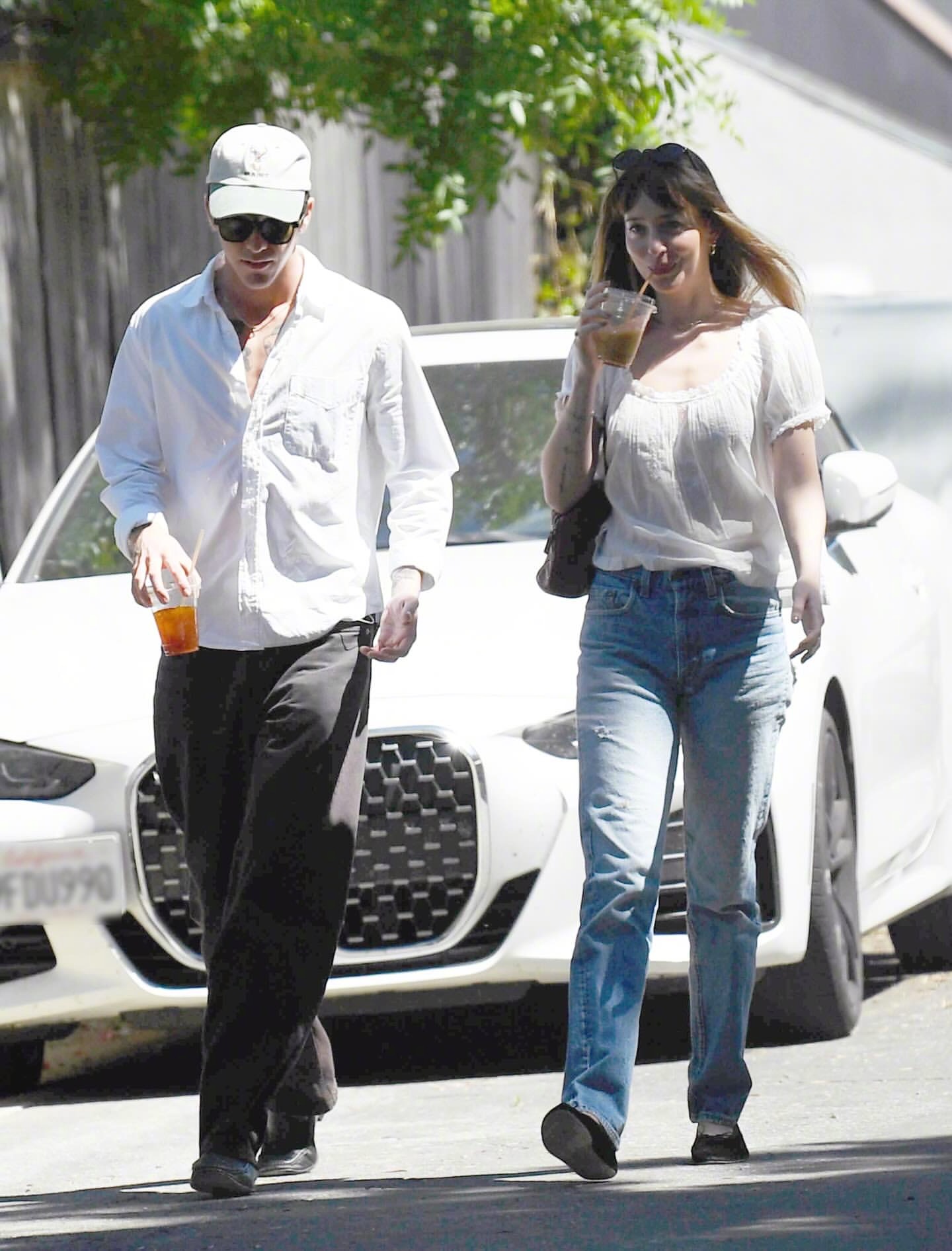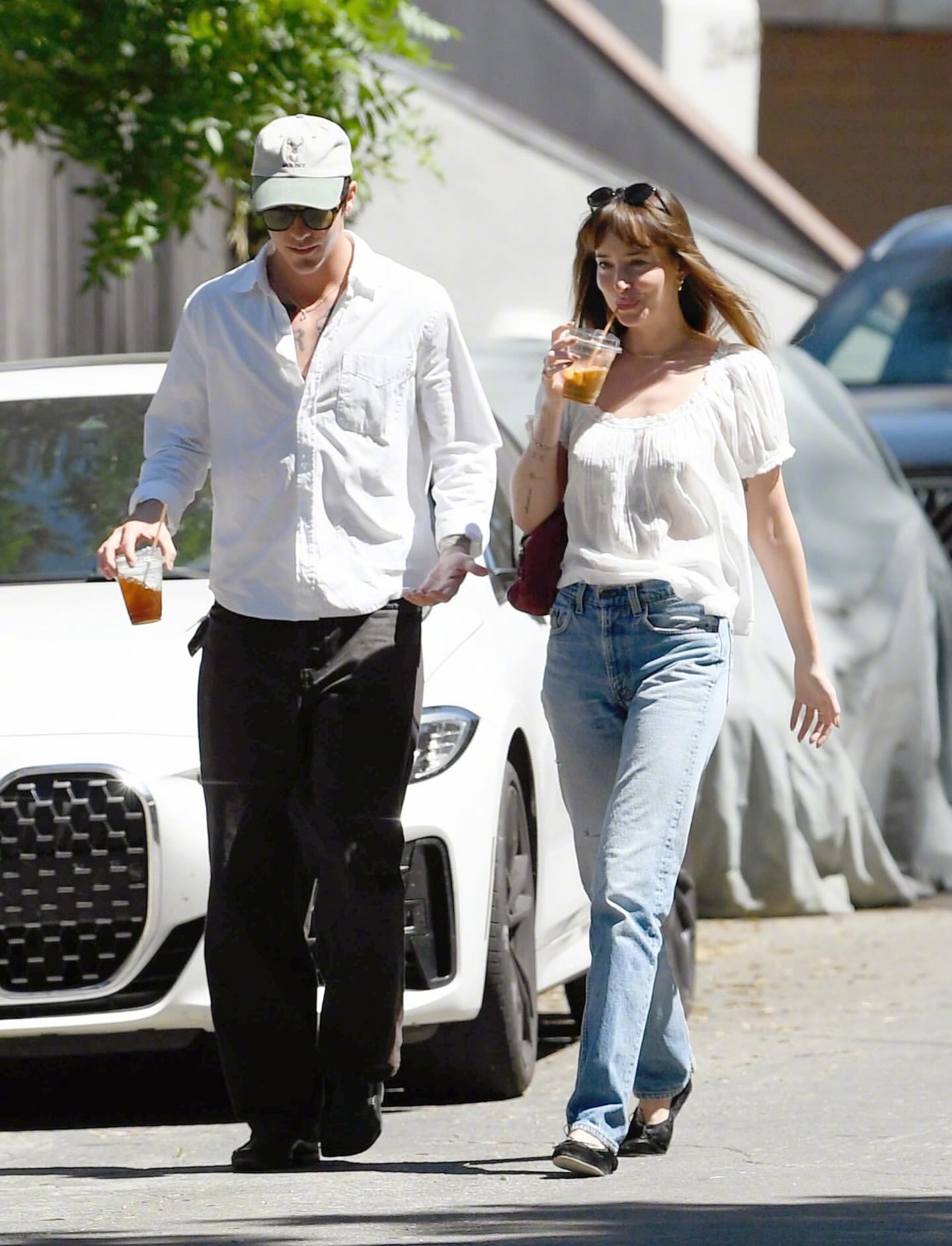 达妹Dakota Johnson和新男友塔克·皮尔斯伯里前往杰里米·艾伦·怀特(Jeremy Allen White)位于洛杉矶的家中参加派对被拍。爱情滋养中的达妹难掩开心!鞋和包都出自The Row ,佩戴的是卡地亚耳环。米拉服饰解析