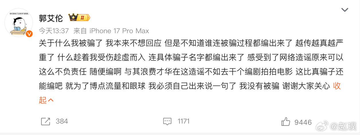 郭艾伦否认被骗昨天还看了好几个报道,说的有鼻子有眼的,细节非常清楚,居然是假的郭