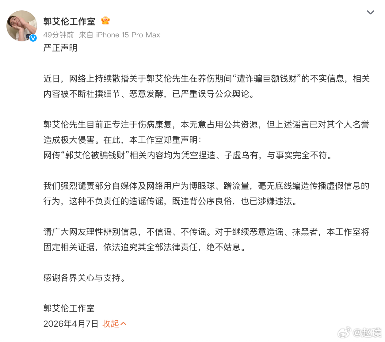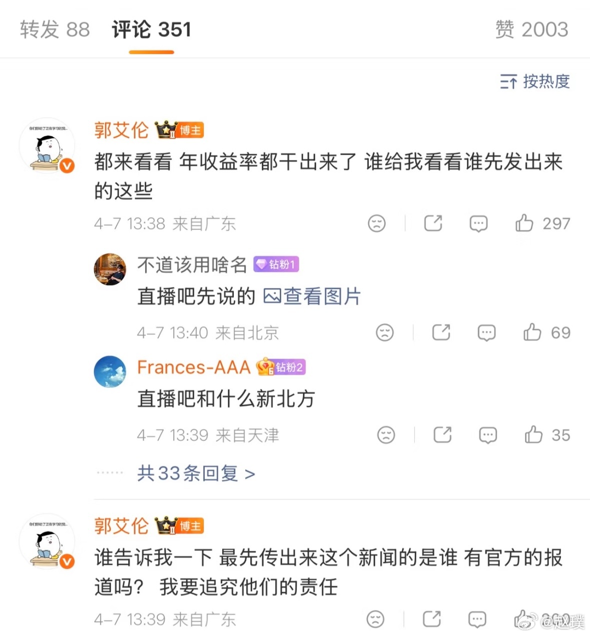 郭艾伦在评论区称要追究最先报道这个新闻的媒体的责任。