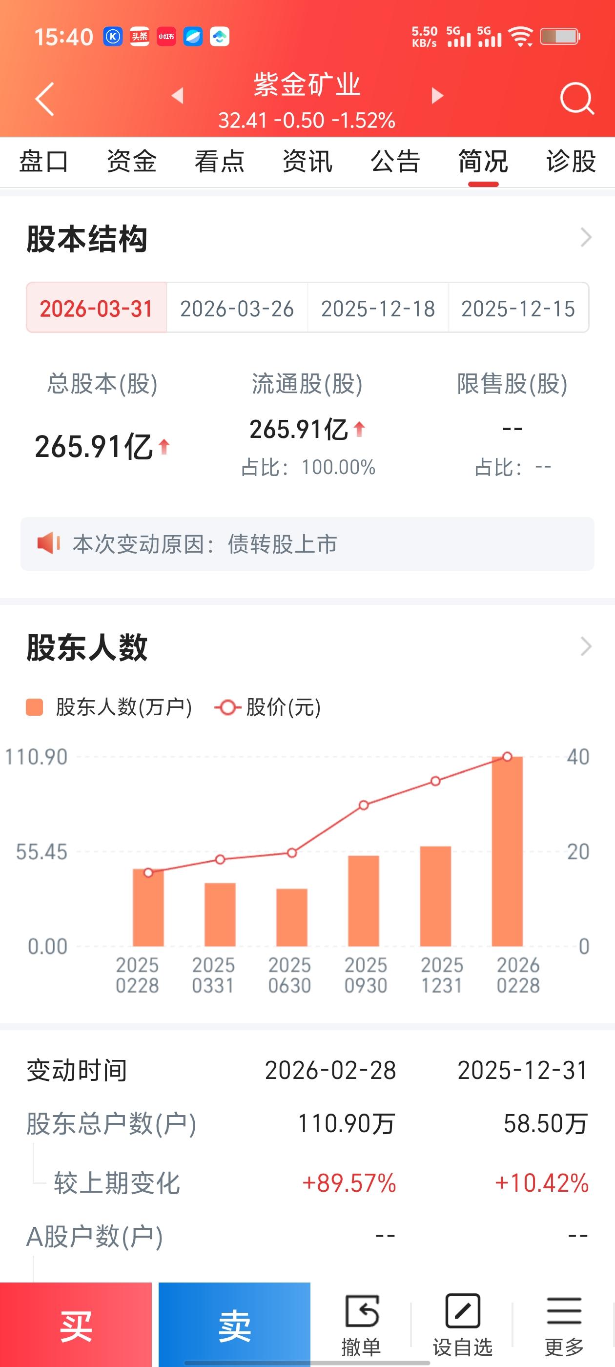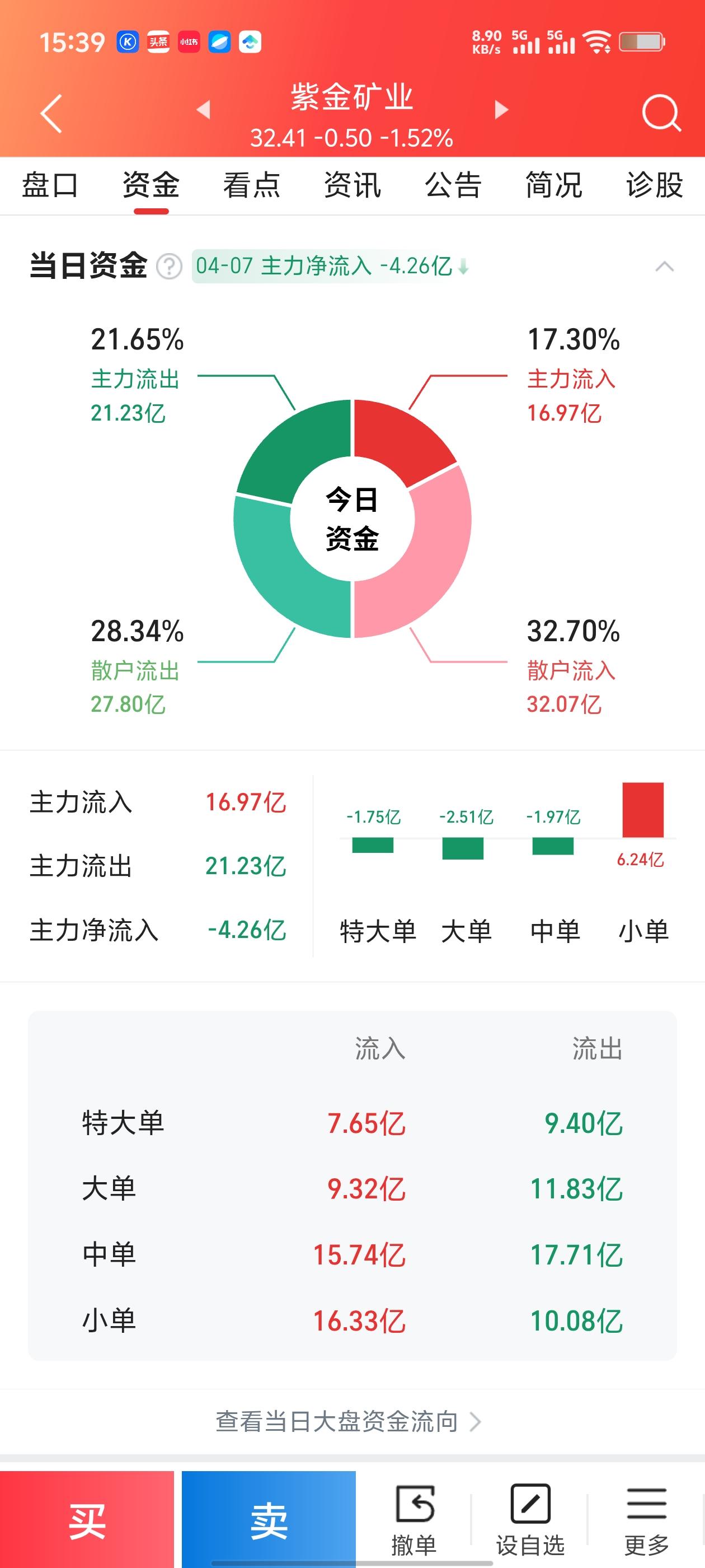 紫金矿业4月7日深度复盘:主力大资金撤离,散户接盘压力陡增! 4月7日,有色龙头紫金矿业(601899)走出了一波高开低走、放量下跌的行情,最终收于32.41元,跌幅达1.52%。结合分时走势、资金流向和股东结构三张关键图表,我们给普通散户透透底,讲清楚今天这盘面背后到底藏着什么猫腻,接下来又该怎么避坑。 一、盘面看:高开低走,多头防线失守 从分时图上看,紫金矿业早盘开盘价32.80元,最高价摸到33.10元,看似开局不错。但遗憾的是,全天未能翻红,股价一路在均价线(黄线)下方震荡运行,尾盘更是有一波快速下杀。 全天换手率0.73%,虽然不算高,但结合流出4.26亿主力资金的体量来看,筹码稳定性正在松动。这种“高开低走”的阴线,对散户心态的打击很大,意味着短期多头力量彻底 exhausted(耗尽)。 二、资金面的真相:主力跑了,散户在接! 这是今天最危险的信号。打开资金流向图,你会发现一幕非常典型的“主力出货、散户接盘”场景。 1. 主力净流出4.26亿:主力流入16.97亿,但流出高达21.23亿。大资金在这个位置选择了果断兑现。 2. 特大单、大单是主要出逃力量:特大单流出9.40亿,流入仅7.65亿;大单流出11.83亿,流入9.32亿。这说明什么?说明真正的机构、游资在高位跑路,他们不看好后市,选择落袋为安。 3. 散户流入占比极高:散户流入32.07亿,流出21.25亿。主力跑掉的筹码,绝大部分被散户吃掉了。 给散户的忠告:在股市里,永远不要忽略“主力流出、散户流入”这个组合。主力是聪明钱,他们在32元上方跑路,而散户在这个位置跟风买入,大概率是在接飞刀。 三、股东数据:筹码极度分散,隐患巨大 再看简况里的股东人数,数据更是触目惊心。 1. 股东人数暴增89.57%:截至2026年2月28日,股东人数达到110.90万户。短短几个月内,人数翻倍还多。 2. 筹码意味着什么? 股东人数越多,筹码越分散,主力就越难统一拉升股价。一家公司有110万个股东,意味着每个人手里筹码太少,合力不足,股价容易陷入阴跌或震荡。 四、给散户的实操避坑指南 面对这样一份“主力出逃、筹码分散”的盘面,不同持仓状态的散户,应对策略完全不同。 1. 持有紫金矿业的散户 - 不要心存侥幸:今天主力资金流出明显,而且H股(35.320元)跌幅达2.97%,对A股有拖累效应。 - 做好风控:建议严格设置止损线,比如32.00元。一旦股价有效跌破这里,不要犹豫,果断减仓或清仓。千万不要因为“跌得少”就死扛,趋势坏了就要跑。 - 切勿补仓:在没有看到主力资金回流之前,绝对不要补仓摊薄成本,那会让你越陷越深。 2. 想买入抄底的散户 - 现在不是底! 不要被32元的价格看似不高诱惑。主力还在流出,底部特征不明显。 - 等待右侧机会:至少要等股价重新站稳33元,且主力资金由净流出转为净流入三天以上,再考虑小仓位试错。现在抄底,就是火中取栗。 3. 长期关注的散户 - 基本面没问题,但要等:紫金作为矿业龙头,基本面确实扎实。但“好公司”不等于“随时能买”,它的股价受金属价格和资金情绪影响大。现在的调整,是消化前期获利盘,适合分批低吸,而不是一把梭哈。 总结 今天的紫金矿业,就是一场**“主力收割散户”的戏码。主力在高位派发筹码,散户在情绪驱动下接盘,加上股东人数过多的基本面支撑乏力,短期股价承压概率极大**。 散户朋友们,记住一句话:看资金流向,比看K线更重要。 主力都跑了,咱们小散更要跑得快!