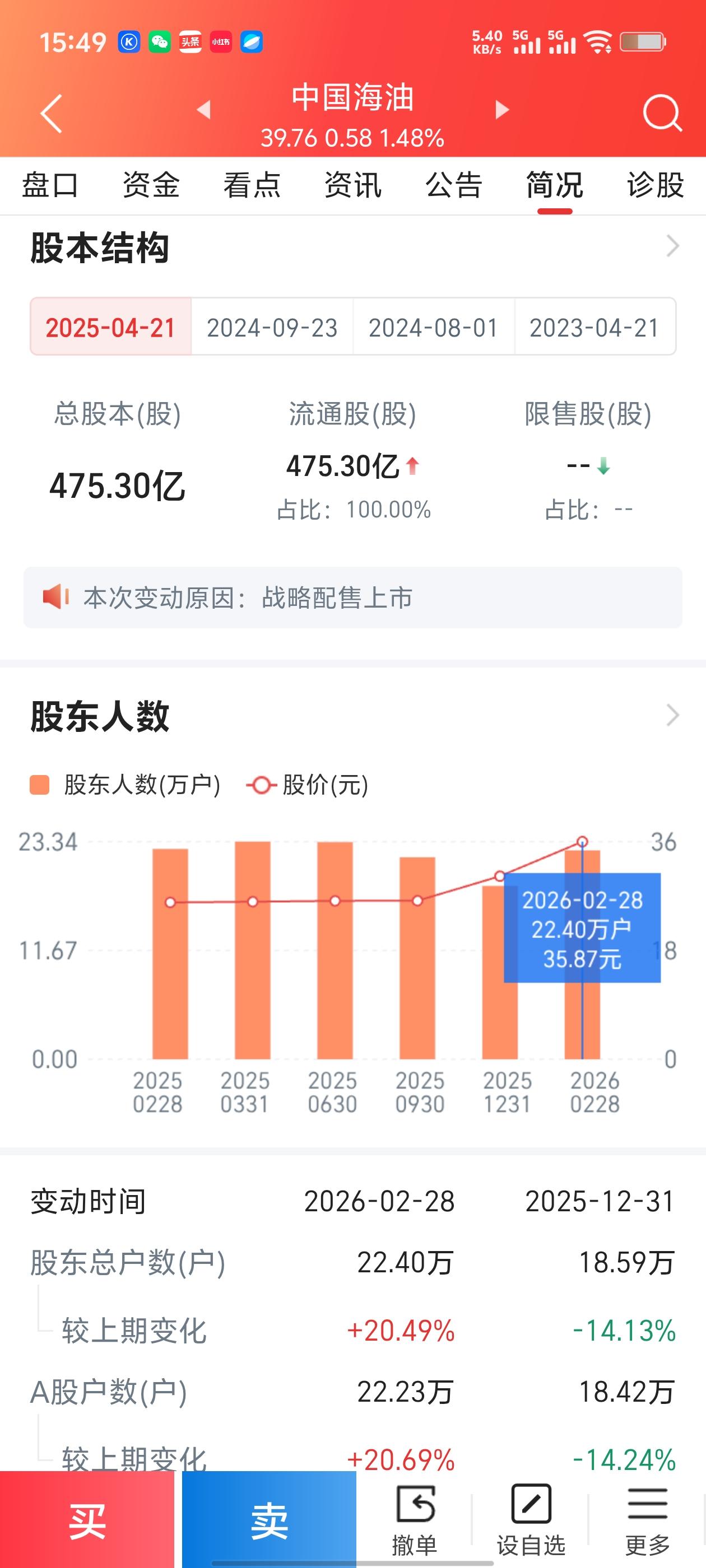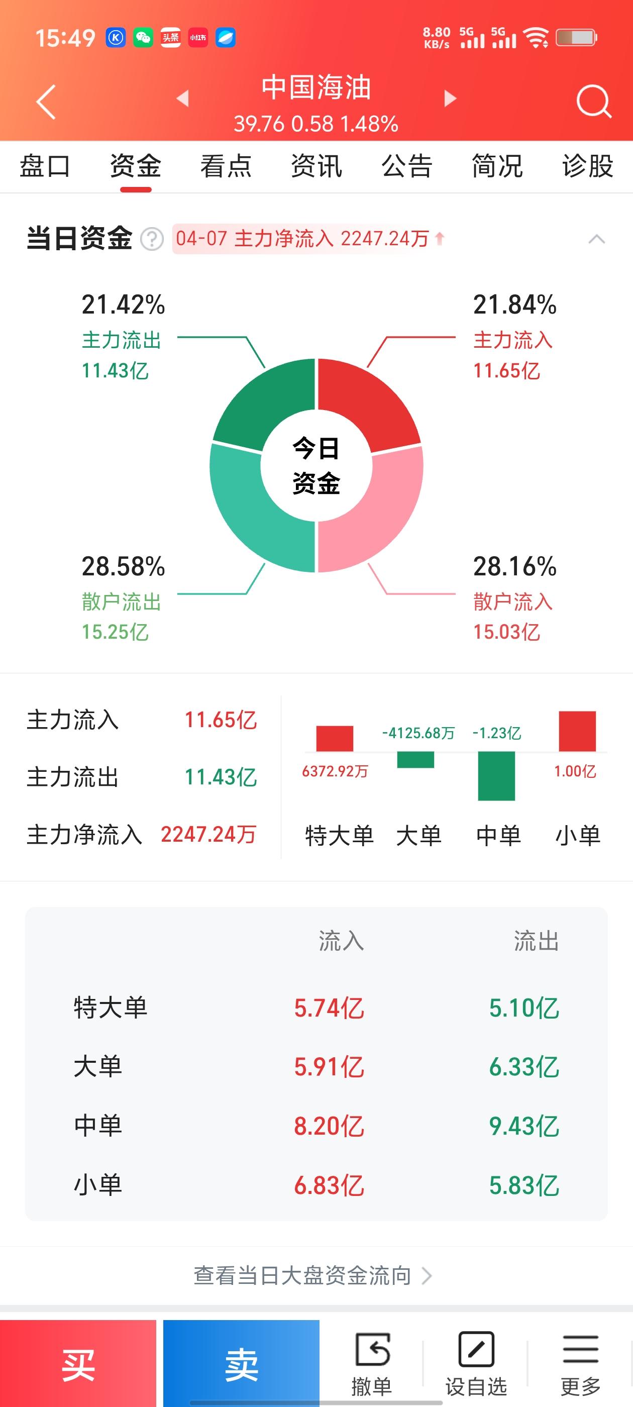 中国海油4月7日深度复盘:油气龙头逆势走强,主力资金微调,散户该如何应对? 4月7日,在整体市场震荡的背景下,石油石化板块表现亮眼,中国海油(600938)更是走出了一波高开高走、逆势收涨的强势行情。收盘价定格在39.76元,涨幅达1.48%。结合分时走势、资金流向和股东结构三张图表,我为散户朋友们拆解一下这家“油气巨无霸”背后的资金逻辑,以及接下来该怎么操作。 一、盘面看:原油概念助攻,全天强势锁筹 从分时图来看,中国海油今天的表现堪称“稳健”。 - 开盘冲高:早盘开盘价39.19元,最高触及40.18元,早盘多头力量就占据了主动。 - 强势运行:分时线(蓝色)全程大部分时间运行在均价线(黄色)上方,尾盘虽然略有回落,但依然保持红盘收盘。 - 换手率与量能:全天换手率2.26%,在这样一个万亿市值的大盘股身上,这个换手率表现出了不错的筹码锁定性。量比1.056,说明成交活跃度维持在正常水平,没有出现明显的放量滞涨。 二、资金面:主力小幅净流入,“聪明钱”态度积极 这是今天最值得关注的数据。虽然股价上涨不算惊天动地,但主力资金的态度是主动做多的。 1. 主力净流入2247万:主力流入11.65亿,流出11.43亿,净买入约2247万元。对于近2000亿市值的巨盘来说,这是一个企稳试盘的信号。 2. 资金结构分析:- 特大单:流入5.74亿 vs 流出5.10亿,机构大资金是进场的主力。 - 散户流向:散户流入15.03亿,流出15.25亿,散户资金小幅流出。 3. 核心解读:这是一副**“主力进,散户出”**的健康格局。主力在39-40元区间悄悄吸筹,而获利的散户选择兑现,这为后续的拉升减轻了抛压。相比之前紫金矿业、比亚迪的“主力出逃”,中国海油的资金面要健康得多。 三、股东数据:筹码集中度极高,机构控盘稳健 再看简况里的股东数据,这也是中国海油能走出独立行情的根本原因。 1. 股东人数极少(22.40万户):截至2026年2月底,股东总数仅为22.40万。 2. 对比分析:对比一下紫金矿业(110万户)和比亚迪(73万户),大家就明白差距了。股东人数越少,筹码越集中,主力资金拉升股价的阻力就越小。 3. 变化趋势:相比2025年底的18.59万户,本期增长了20.49%,但整体基数依然很低。说明虽然有新散户进场,但主力筹码依然稳固,属于“进二退一”的健康洗盘状态。 四、给散户的实操指南:三种角色的应对策略 面对这样一只“石油龙头+主力净流入+筹码集中”的票,不同持仓状态的散户,应对策略完全不同。 1. 持有中国海油的散户:拿稳,不要乱动 - 趋势良好:股价逆势上涨,主力资金净流入,股东人数少,合力很强。 - 操作思路:只要股价不跌破39元的支撑位,就坚定持有。甚至可以设置38.5元作为防守线,一旦跌破再考虑减仓。目前的趋势是向上的,不要因为一点点波动就交出筹码。 2. 想入场抄底的散户:低吸为主,切勿追高 - 不是买点:今天收盘价39.76元,距离今日高点40.18元有一定距离,且主力资金净流入规模不大(2000多万),明天大概率会有冲高回落或震荡。 - 低吸策略:不要在明天开盘直线拉升时追涨。最佳策略是回踩均线或39.2元-39.5元支撑区间时,小仓位低吸。 - 仓位建议:这种大盘股适合中长线布局,不要满仓梭哈,建议仓位控制在3-5成。 3. 长期关注的散户:关注油价与分红 - 基本面逻辑:中国海油是典型的资源型蓝筹,受益于国际油价上涨。只要油价不出现大幅回调,其基本面就有支撑。 - 红利策略:对于追求稳定现金流的散户,它是不错的收息股。目前市盈率仅15.48,估值处于合理区间,适合长期拿住吃分红。 总结 4月7日的中国海油,给散户们展示了一幅“稳中有进”的美好画面。相比同板块的紫金矿业(主力出逃)和比亚迪(资金流出),它是为数不多资金面健康的标的。 给散户的一句话:在震荡市中,“人少(筹码集中)”就是优势,“主力进”就是信号。中国海油目前趋势向上,适合安心持有,不必被短期的小波动吓到。