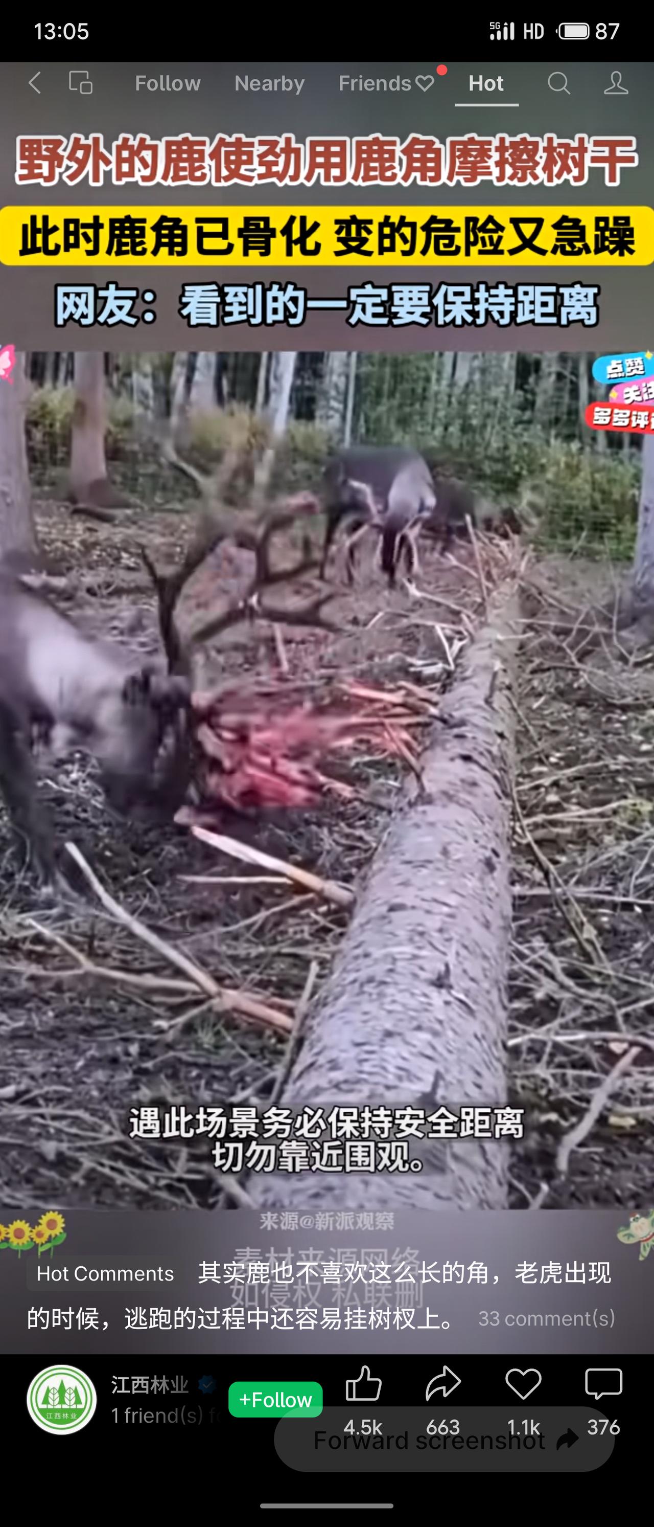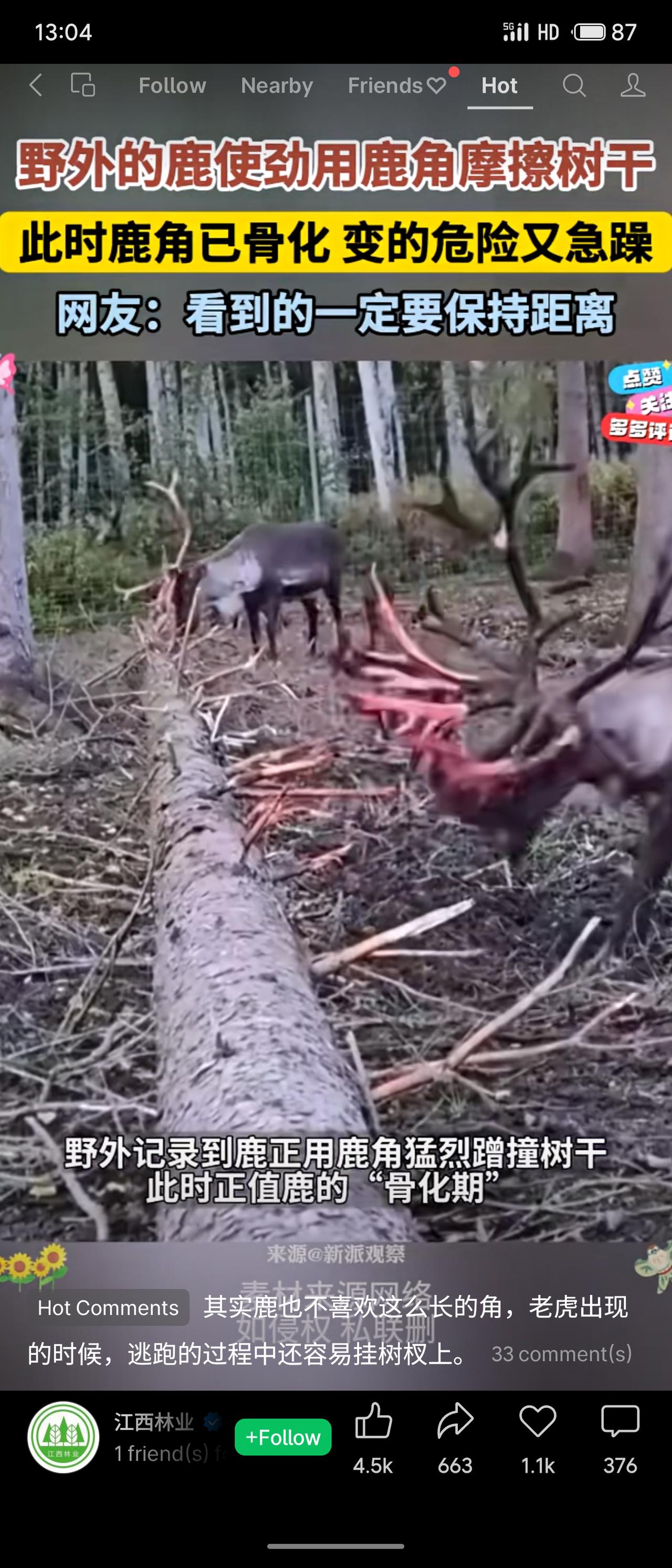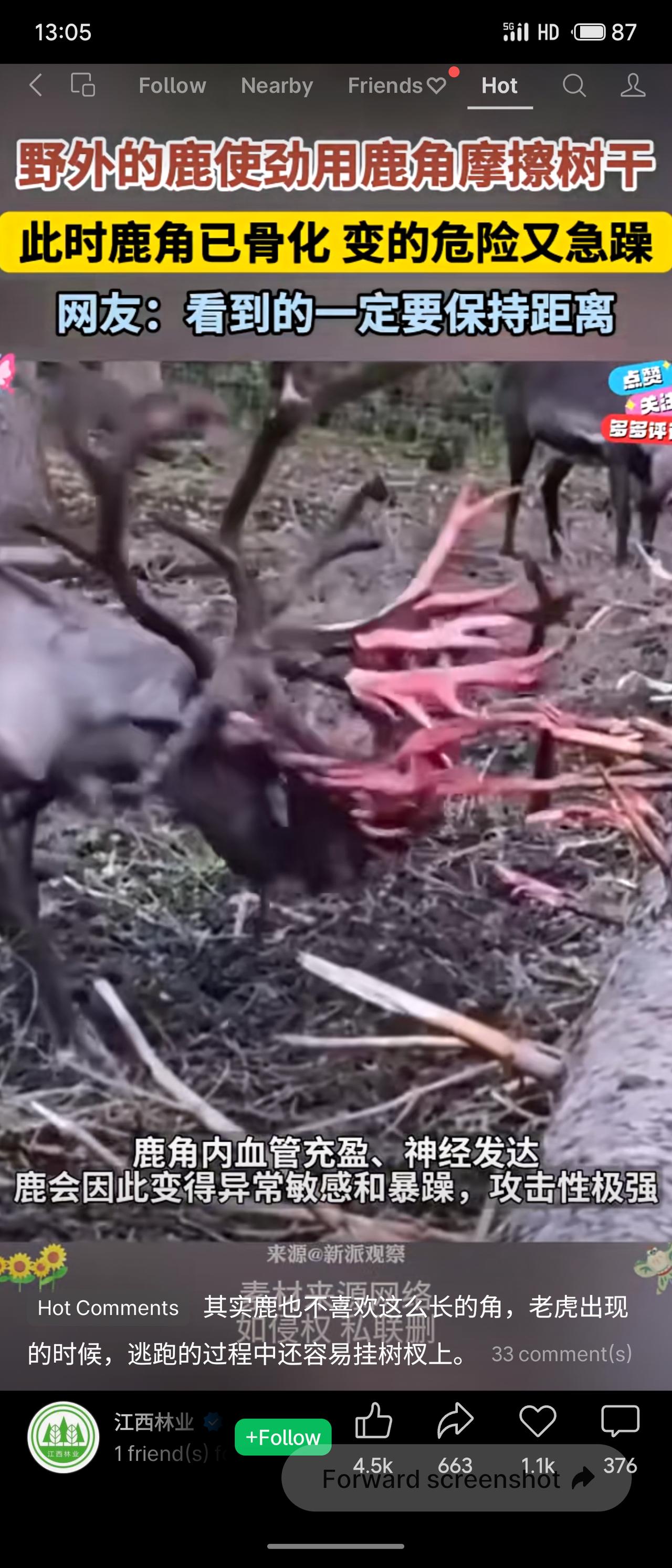 野外鹿进入鹿角骨化期,会用力摩擦树干,此时血管充盈、神经敏感,变得异常危险急躁。网友提醒务必保持距离,切勿靠近围观。有热评指出,鹿也不喜欢长角,逃跑时容易挂到树枝。
