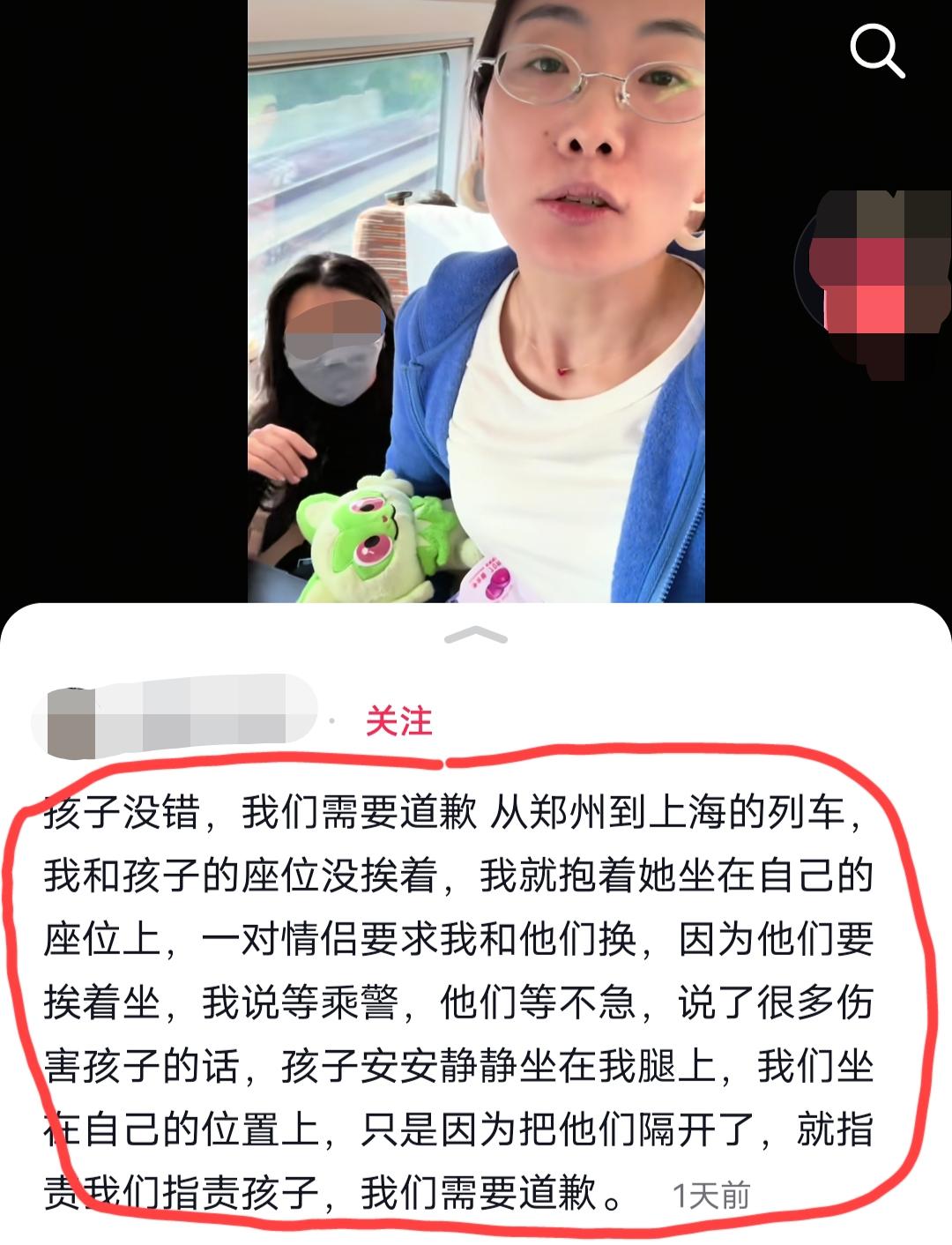 4月6日,郑州至上海的列车上,女子坐在自己座位上,一对情侣被她隔开了,情侣想挨在一起坐,要跟她换座位,女子说等乘务员来再换。情侣等不及就开始阴阳怪气的指责女子,女子与他们理论时又被另一个不相干的乘客指责她声音太大,之后列车上的工作人员就过来调解了…… 之后,这个带孩子的女的在列车上透露了这么一个细节,称她的丈夫过世了,她现在是单亲妈妈,这对情侣里面那个女的就对那个小女孩说:“乖乖,你要赶快长大,长大了好保护你妈妈”…… 事情的后续是:没解决,对方没有道歉,并表示让女的去民事起诉他们(这对情侣)。 以上都是带孩子这位母亲的单方面陈述,具体当时的事情经过到底如何,我们不得而知,不过,我觉得这位母亲应该不至于撒谎。 评论区诸位看官,你们怎么看这个事情?
