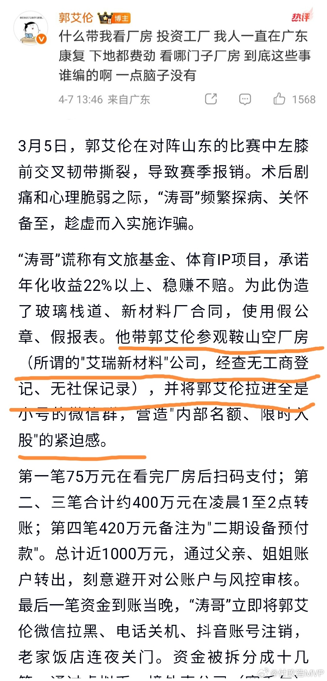 郭艾伦说自己下地都费劲 郭艾伦否认被骗,对网传的诈骗细节更是无语。此前网传辽宁电视台都市频道《新北方》节目披露了郭艾伦被骗近千万的细节,说有位涛哥趁着郭艾伦左膝前交叉韧带修复手术后剧痛和心理脆弱之际,趁虚而入实施诈骗,带郭艾伦参观鞍山空厂房。
