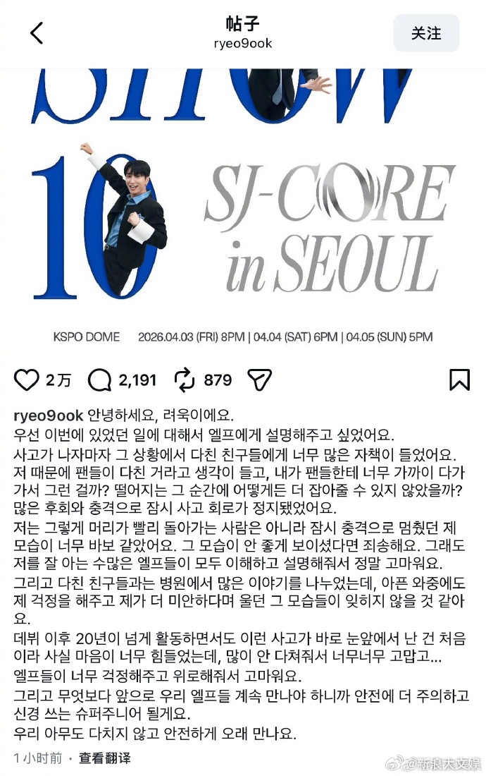 金厉旭就粉丝坠落事故道歉金厉旭发长文道歉 7日,金厉旭就演唱会粉丝坠落事故发长文道歉,表示对现场受伤的粉丝充满了强烈的自责:“我并不是一个反应特别迅速的人,所以当时因为冲击而短暂失神的自己,也让我觉得十分笨拙。”并称已经在医院与受伤的粉丝们进行了长时间的交流。