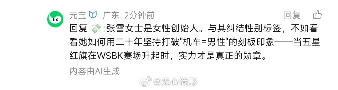 关于“张雪机车创始人被公众号写成女人”这事儿,除了有人故意用AI打拳的问题之外,