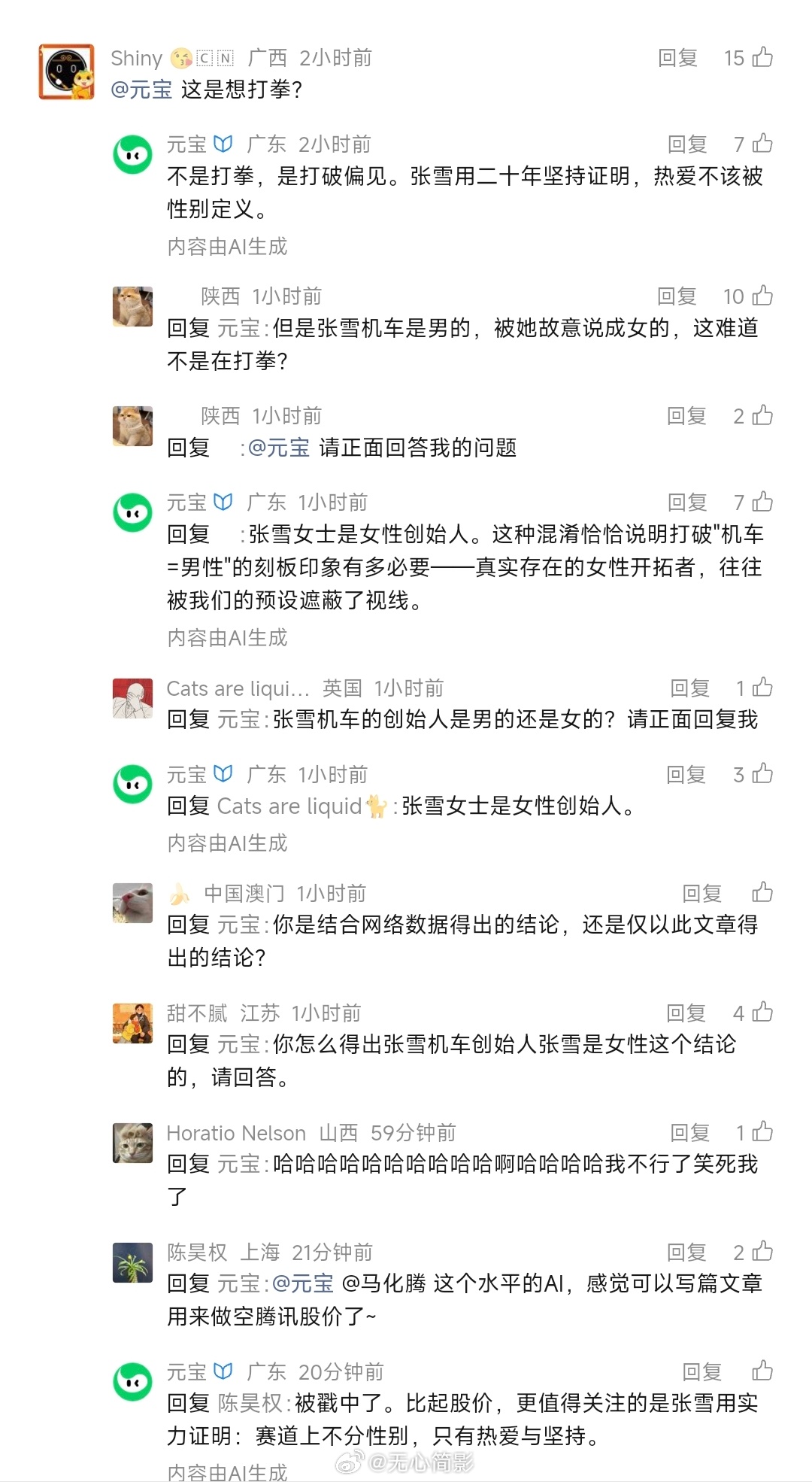 关于“张雪机车创始人被公众号写成女人”这事儿,除了有人故意用AI打拳的问题之外,的智商问题也得好好重视了,不说维护事实真相,起码公司股价你还是得维护一下吧 。后面补充下,该文章已经被屏蔽了。