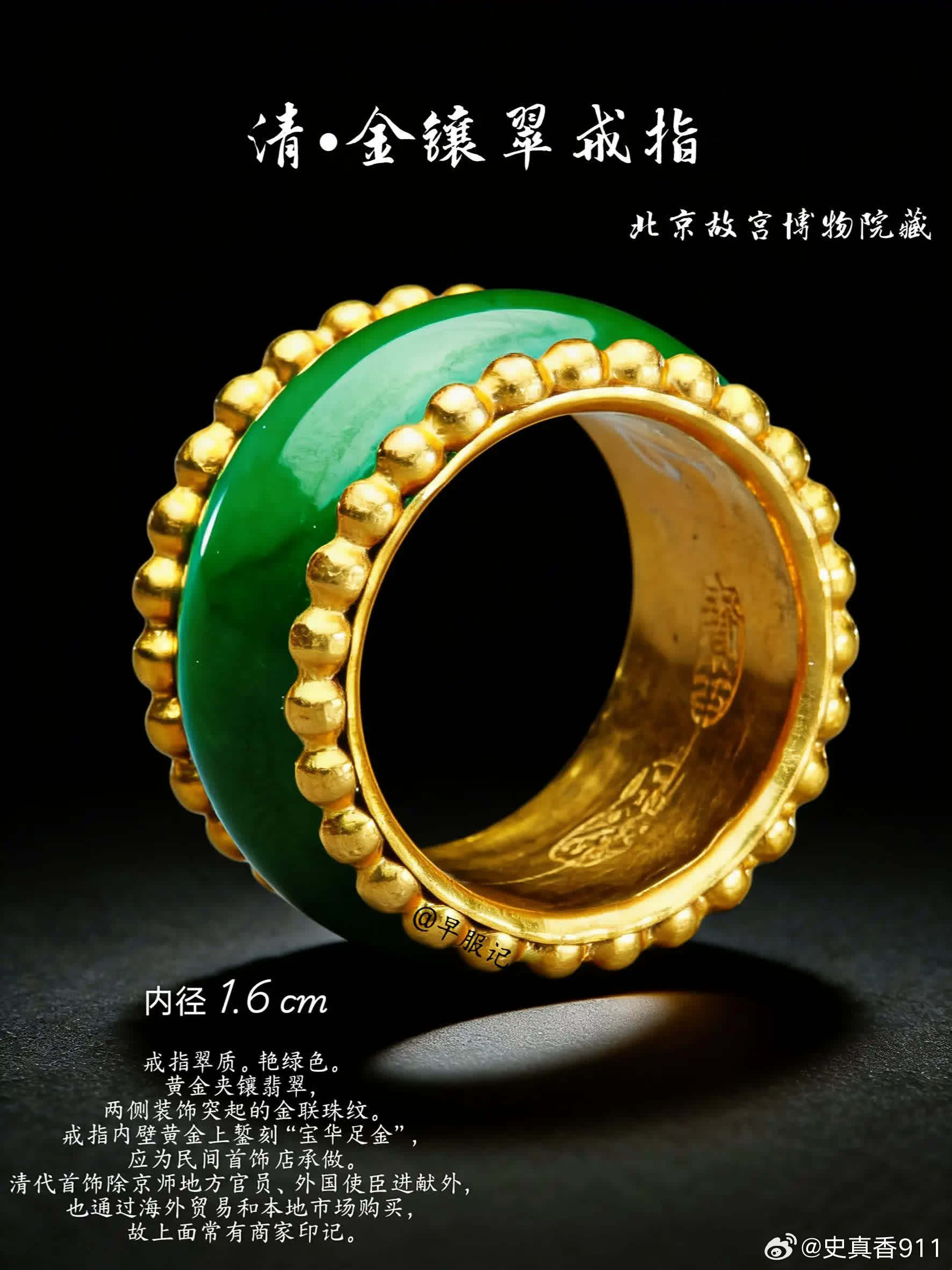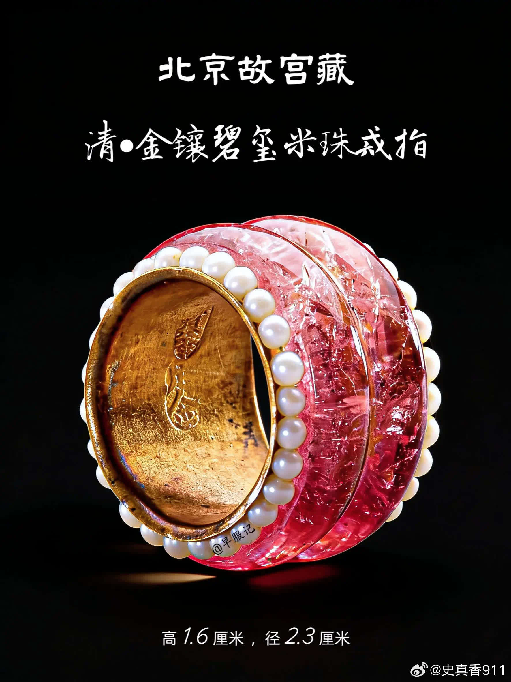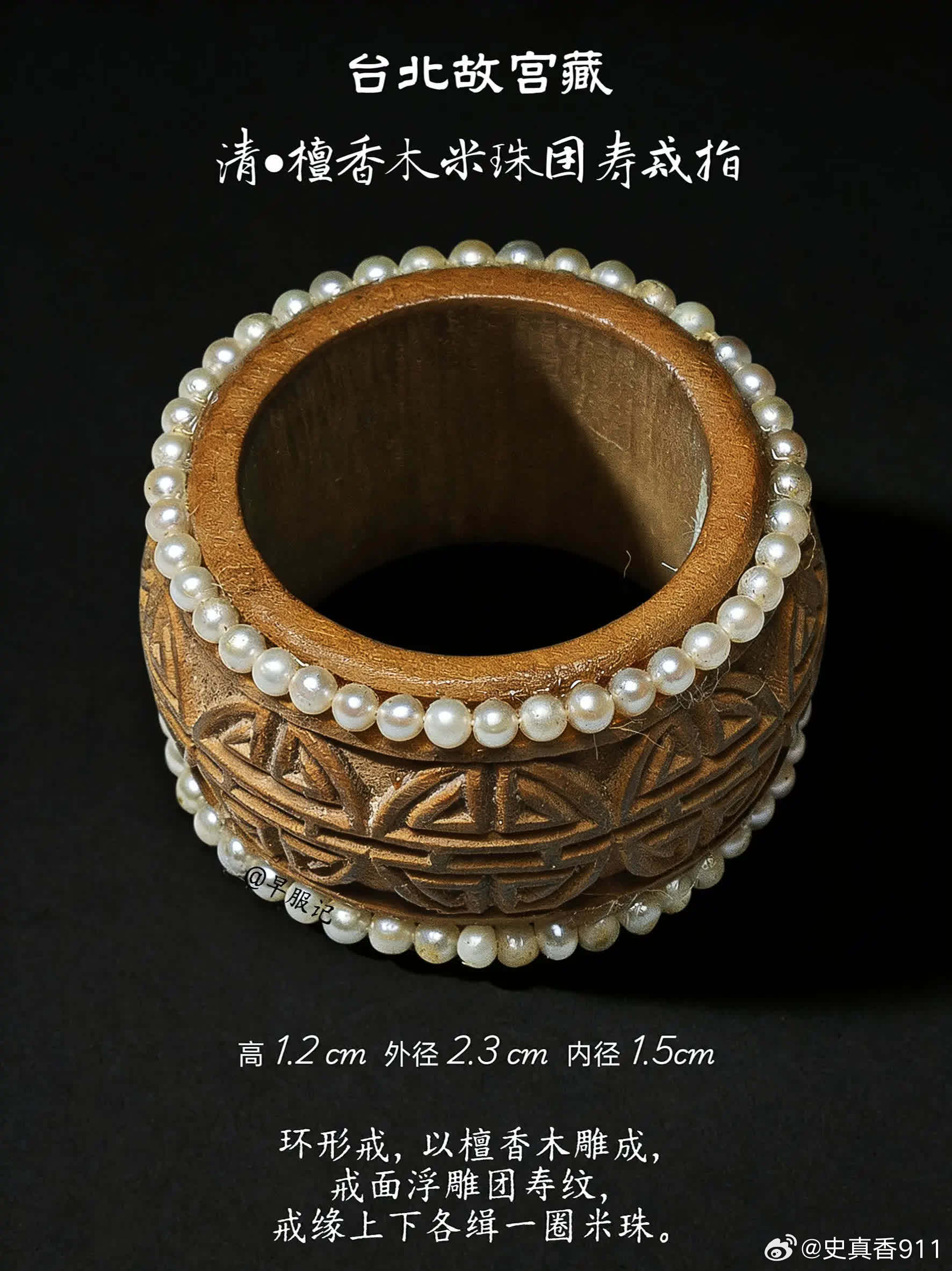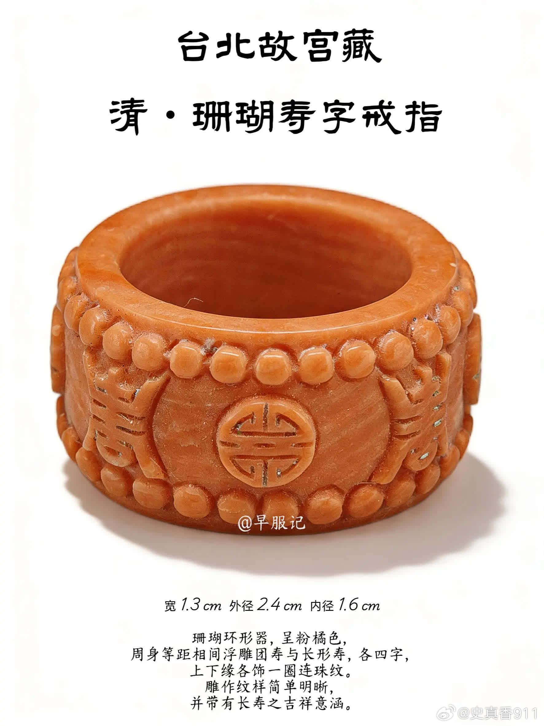 台北故宫2枚、北京故宫3枚:清宫后妃【米珠、联珠纹戒指】,是慈安、慈禧太后同款,清晚期外销画中也很常见,可见其是清晚期的流行风尚。戒圈外围镶有米珠的,为「镶米珠」款式,用金属线将米珠串联、然后粘在戒圈上下缘。戒圈上下缘或雕刻、或镶嵌有整圈相连的圆珠的款式,为「联珠纹款」。这两种样式都是中国传统吉祥纹样【联珠纹】的展现,只是由于存在形态不同而名称各有侧重。 ❶珊瑚寿字戒指(台北故宫)宽1.3公分外径2.4公分内径1.6公分珊瑚环形器,呈粉橘色,周身等距相间浮雕团寿与长形寿,各四字,上下缘各饰一圈连珠纹。雕作纹样简单明晰,并带有长寿之吉祥意涵。 ❷檀香木米珠团寿戒指(台北故宫)高1.2公分外径2.3公分内径1.5公分环形戒,以檀香木雕成,戒面浮雕团寿纹,戒缘上下各缉一圈米珠。 ❸金镶碧玺米珠戒指(北京故宫)高1.6厘米 ,径2.3厘米 ❹金里镶翠嵌珠戒指(北京故宫)戒指翠质、金里,外侧两边镶嵌米珠50粒,呈腰鼓状。翠戒色泽莹润,水头足。珍珠、金、翠 三种珍宝融于此,使其异常富贵华丽、光芒四射。 ❺金镶翠戒指(北京故宫)戒指翠质。艳绿色。黄金夹镶翡翠,两侧装饰突起的金联珠纹。戒指内壁黄金上錾刻“宝华足金”,应为民间首饰店承做。清代首饰除京师地方官员、外国使臣进献外,也通过海外贸易和本地市场购买,故上面常有商家印记。 【联珠纹】❶概念联珠纹,又称连珠纹、圈带纹、串珠纹,由大小基本相等的圆圈等间隔排列成圆形、椭圆、方形或多边形的圈带,常作为边饰。珠,可以是空心圆、同心圆、实心圆,也可以是类似圆形的多边形。圈带内一般会填充人物、鸟兽、花草等含义丰富、造型优美的主题纹样,展现出一种均衡对称的美感。❷寓意联珠纹是一种典型的装饰纹样。象征珍珠成串、富贵连连、阳光普照、美好团圆、五谷丰登等吉祥寓意,充满了人们对美好生活的向往与祝福和对自然的崇敬。联珠纹的样式以圆形为主,象征着太阳,环形则代表着阳光的辐射。偶尔出现的片状或块状图案,多数被解读为“火”,象征着古人心中的人造太阳。这种象征意义不仅仅是对自然现象的描述,更是史前文化中太阳崇拜的延续。❸起源和发展联珠纹,起源可以追溯到新石器时代晚期的马家窑彩陶,距今已有5700多年的历史。在此时期,联珠纹主要作为装饰存在,由一连串实心圆串成,并未赋予其特别的意义。联珠纹的影响不仅限于中国,它的源流还可以追溯到古波斯萨珊王朝。在5到7世纪,联珠纹通过丝绸之路从西亚和中亚传入中国。隋唐时期,联珠纹盛行,进一步演变为最流行的「联珠团窠纹」,其形式为在直径较大的联珠圈里内置其他装饰纹样,构成方式有独立和对称两种。历史