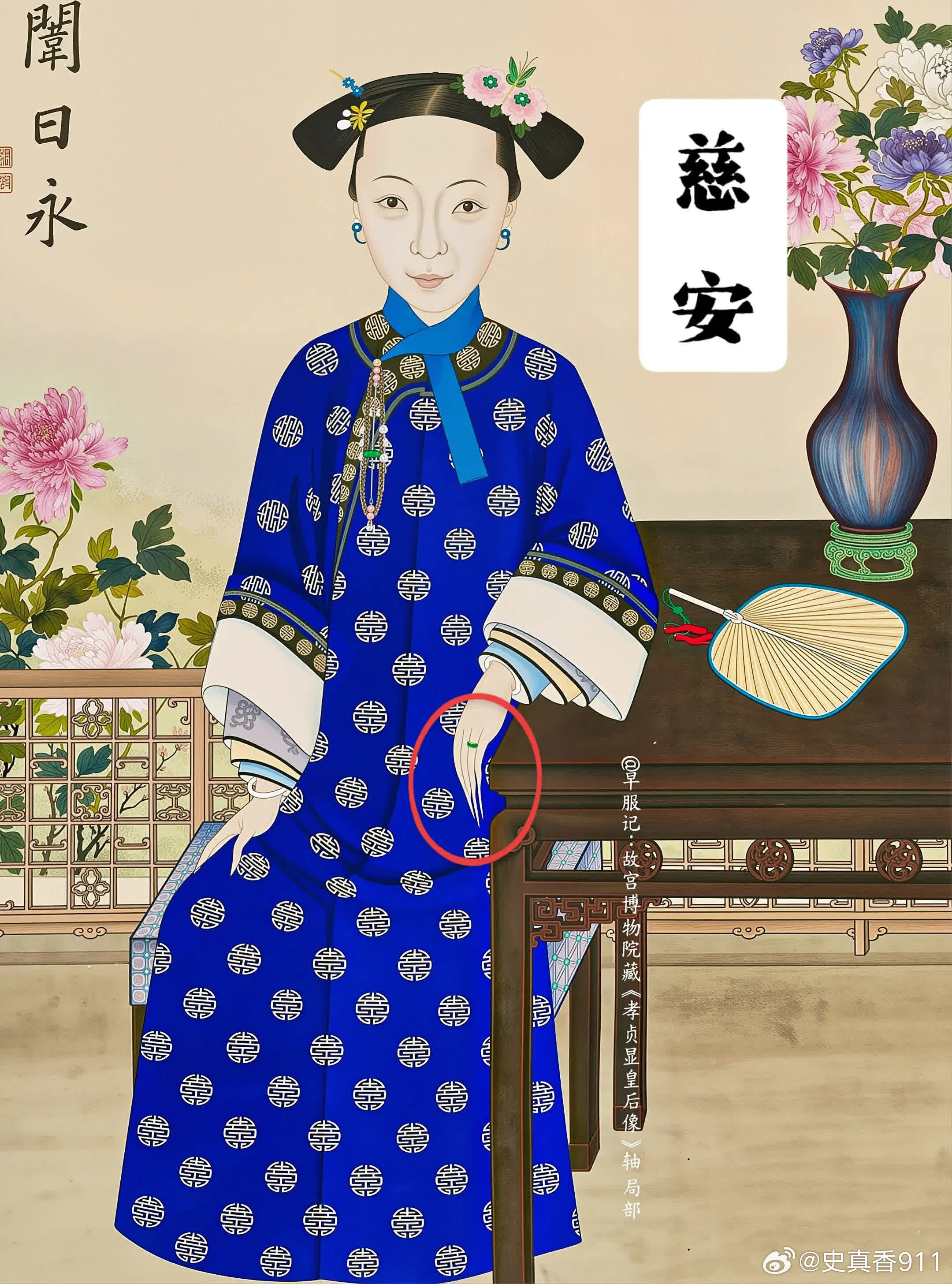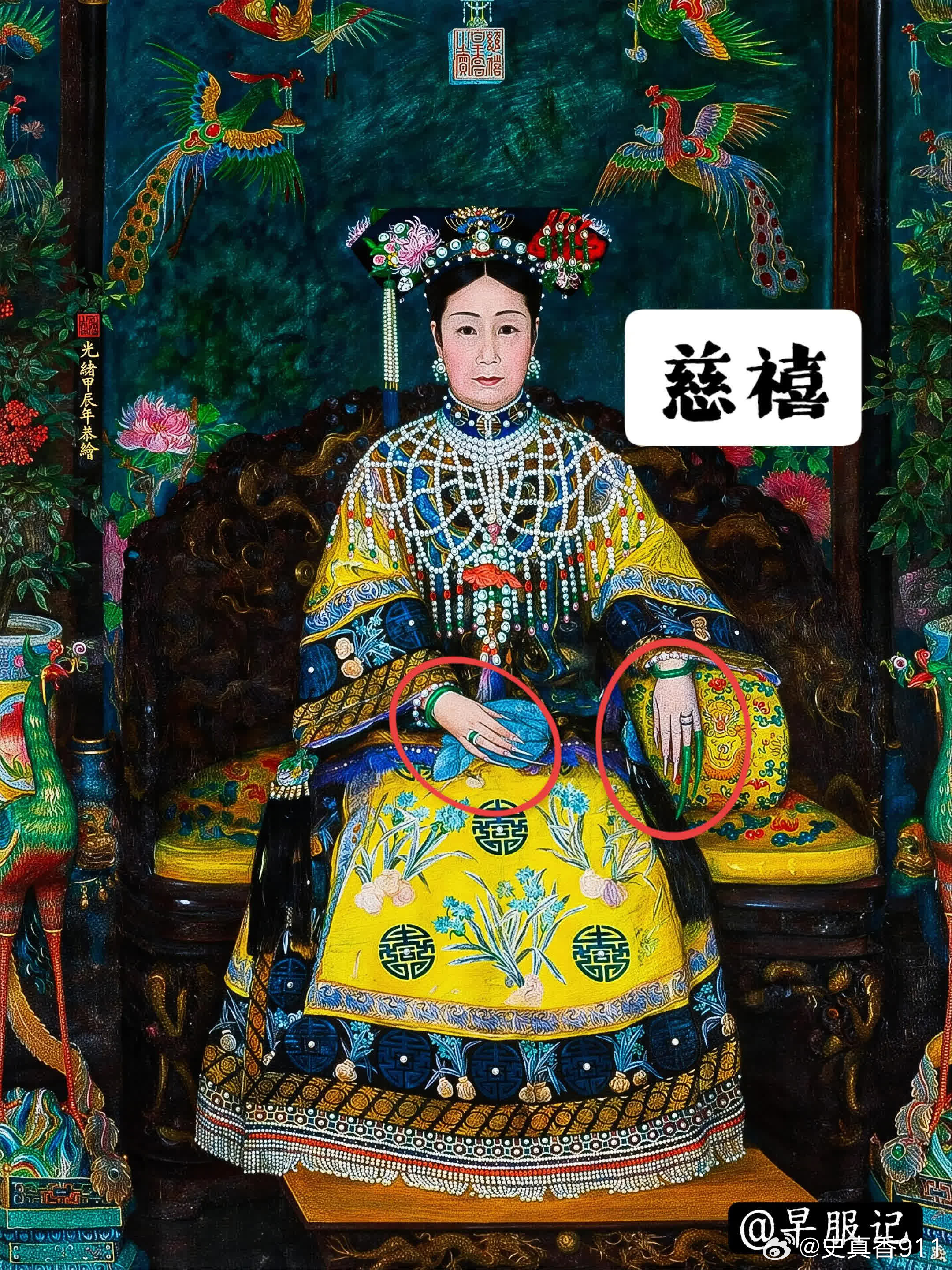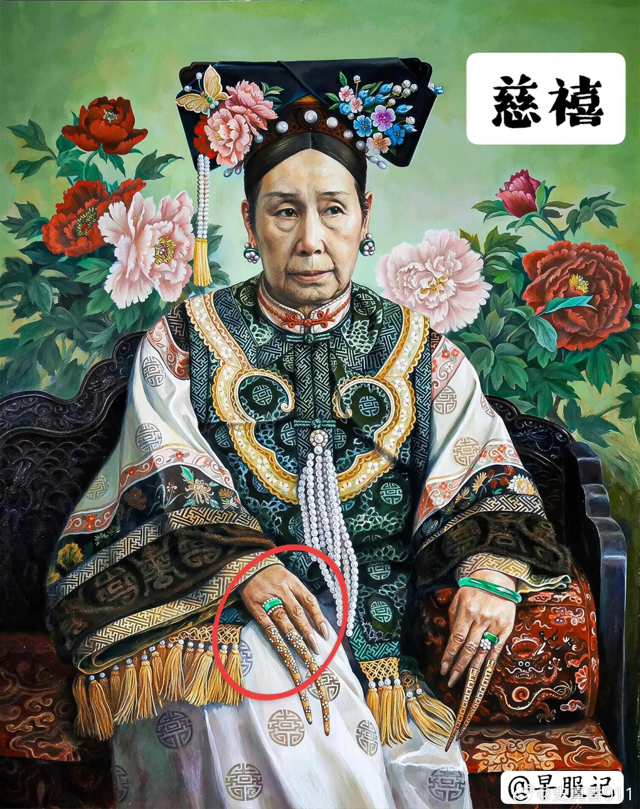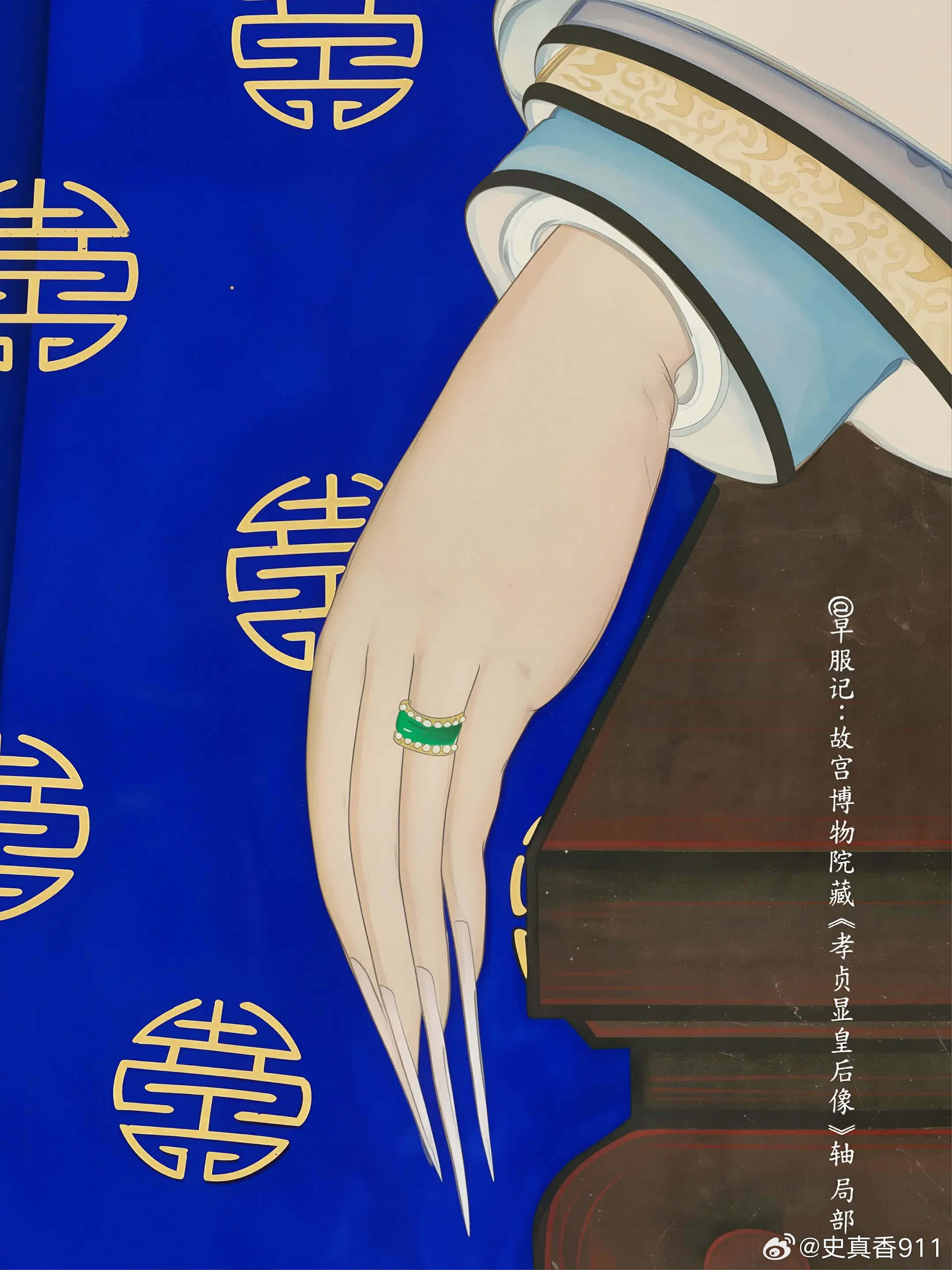台北故宫2枚、北京故宫3枚:清宫后妃【米珠、联珠纹戒指】,是慈安、慈禧太后同款,清晚期外销画中也很常见,可见其是清晚期的流行风尚。戒圈外围镶有米珠的,为「镶米珠」款式,用金属线将米珠串联、然后粘在戒圈上下缘。戒圈上下缘或雕刻、或镶嵌有整圈相连的圆珠的款式,为「联珠纹款」。这两种样式都是中国传统吉祥纹样【联珠纹】的展现,只是由于存在形态不同而名称各有侧重。 ❶珊瑚寿字戒指(台北故宫)宽1.3公分外径2.4公分内径1.6公分珊瑚环形器,呈粉橘色,周身等距相间浮雕团寿与长形寿,各四字,上下缘各饰一圈连珠纹。雕作纹样简单明晰,并带有长寿之吉祥意涵。 ❷檀香木米珠团寿戒指(台北故宫)高1.2公分外径2.3公分内径1.5公分环形戒,以檀香木雕成,戒面浮雕团寿纹,戒缘上下各缉一圈米珠。 ❸金镶碧玺米珠戒指(北京故宫)高1.6厘米 ,径2.3厘米 ❹金里镶翠嵌珠戒指(北京故宫)戒指翠质、金里,外侧两边镶嵌米珠50粒,呈腰鼓状。翠戒色泽莹润,水头足。珍珠、金、翠 三种珍宝融于此,使其异常富贵华丽、光芒四射。 ❺金镶翠戒指(北京故宫)戒指翠质。艳绿色。黄金夹镶翡翠,两侧装饰突起的金联珠纹。戒指内壁黄金上錾刻“宝华足金”,应为民间首饰店承做。清代首饰除京师地方官员、外国使臣进献外,也通过海外贸易和本地市场购买,故上面常有商家印记。 【联珠纹】❶概念联珠纹,又称连珠纹、圈带纹、串珠纹,由大小基本相等的圆圈等间隔排列成圆形、椭圆、方形或多边形的圈带,常作为边饰。珠,可以是空心圆、同心圆、实心圆,也可以是类似圆形的多边形。圈带内一般会填充人物、鸟兽、花草等含义丰富、造型优美的主题纹样,展现出一种均衡对称的美感。❷寓意联珠纹是一种典型的装饰纹样。象征珍珠成串、富贵连连、阳光普照、美好团圆、五谷丰登等吉祥寓意,充满了人们对美好生活的向往与祝福和对自然的崇敬。联珠纹的样式以圆形为主,象征着太阳,环形则代表着阳光的辐射。偶尔出现的片状或块状图案,多数被解读为“火”,象征着古人心中的人造太阳。这种象征意义不仅仅是对自然现象的描述,更是史前文化中太阳崇拜的延续。❸起源和发展联珠纹,起源可以追溯到新石器时代晚期的马家窑彩陶,距今已有5700多年的历史。在此时期,联珠纹主要作为装饰存在,由一连串实心圆串成,并未赋予其特别的意义。联珠纹的影响不仅限于中国,它的源流还可以追溯到古波斯萨珊王朝。在5到7世纪,联珠纹通过丝绸之路从西亚和中亚传入中国。隋唐时期,联珠纹盛行,进一步演变为最流行的「联珠团窠纹」,其形式为在直径较大的联珠圈里内置其他装饰纹样,构成方式有独立和对称两种。历史
