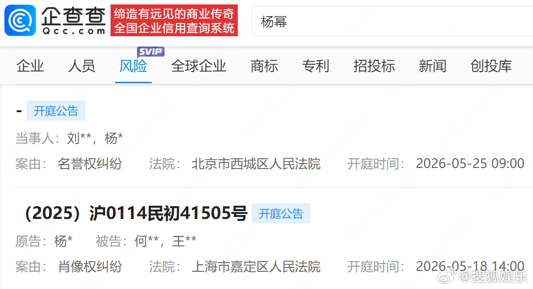 【杨幂告黑维权索赔5万】杨幂新增多起维权案 企查查APP显示,近日,法院依法向刘某公告送达起诉状副本、应诉通知书、开庭传票等材料,涉原告杨幂与其名誉权纠纷一案。原告请求法院判令被告以手写道歉信和视频道歉的形式公开致歉,并赔偿精神损害赔偿金5万元,维权产生的电子取证费、律师费等2万余元由被告承担。案件定于2026年5月25日在北京市西城区人民法院开庭审理。值得注意的是,杨幂与何某王某肖像权纠纷案也将于5月开庭审理。