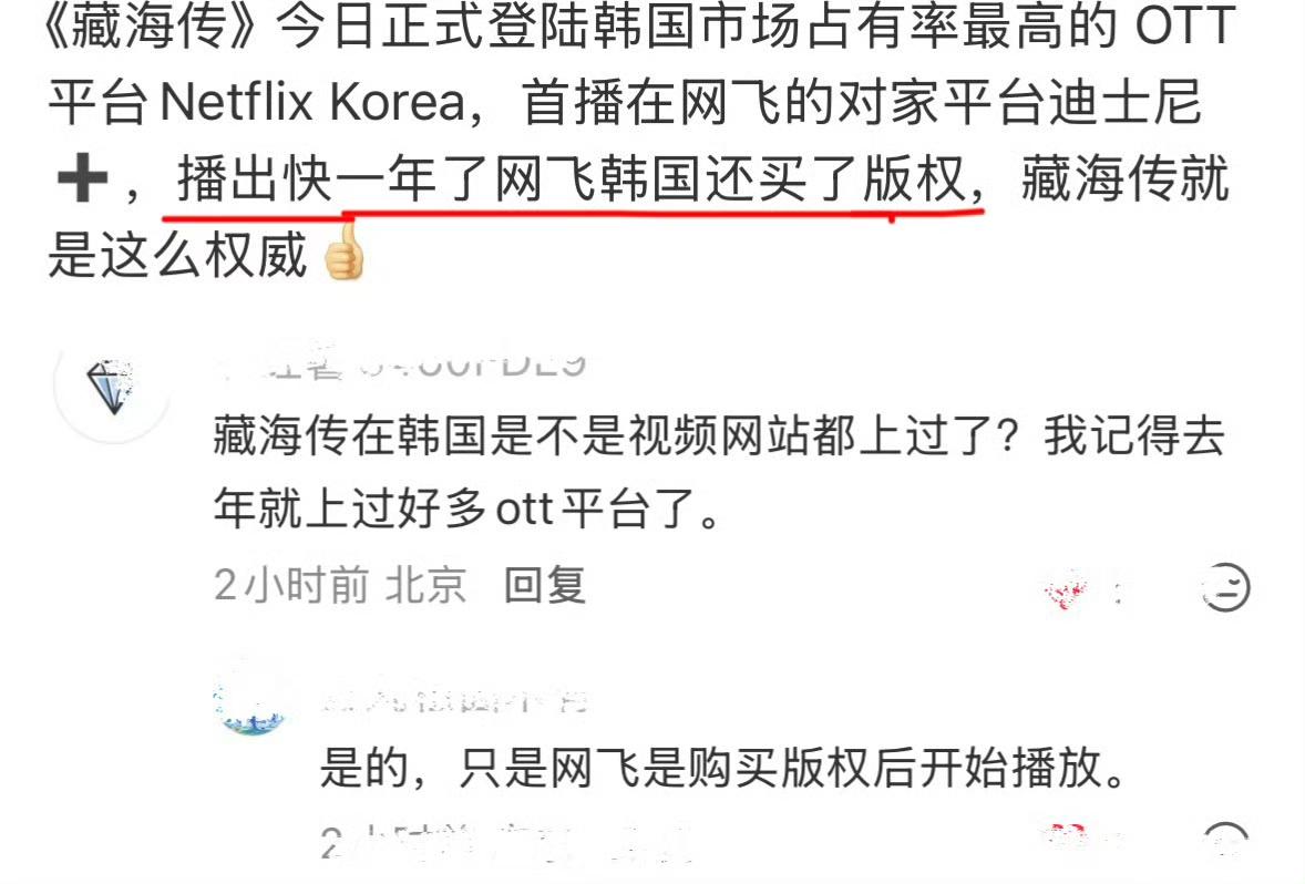 藏海传播出了一年了,在韩国的电视台上星也播过了,迪士尼买了版权,在全世界190多地播出,现在又被网飞韩国买了版权,太牛了[赞][赞][赞]