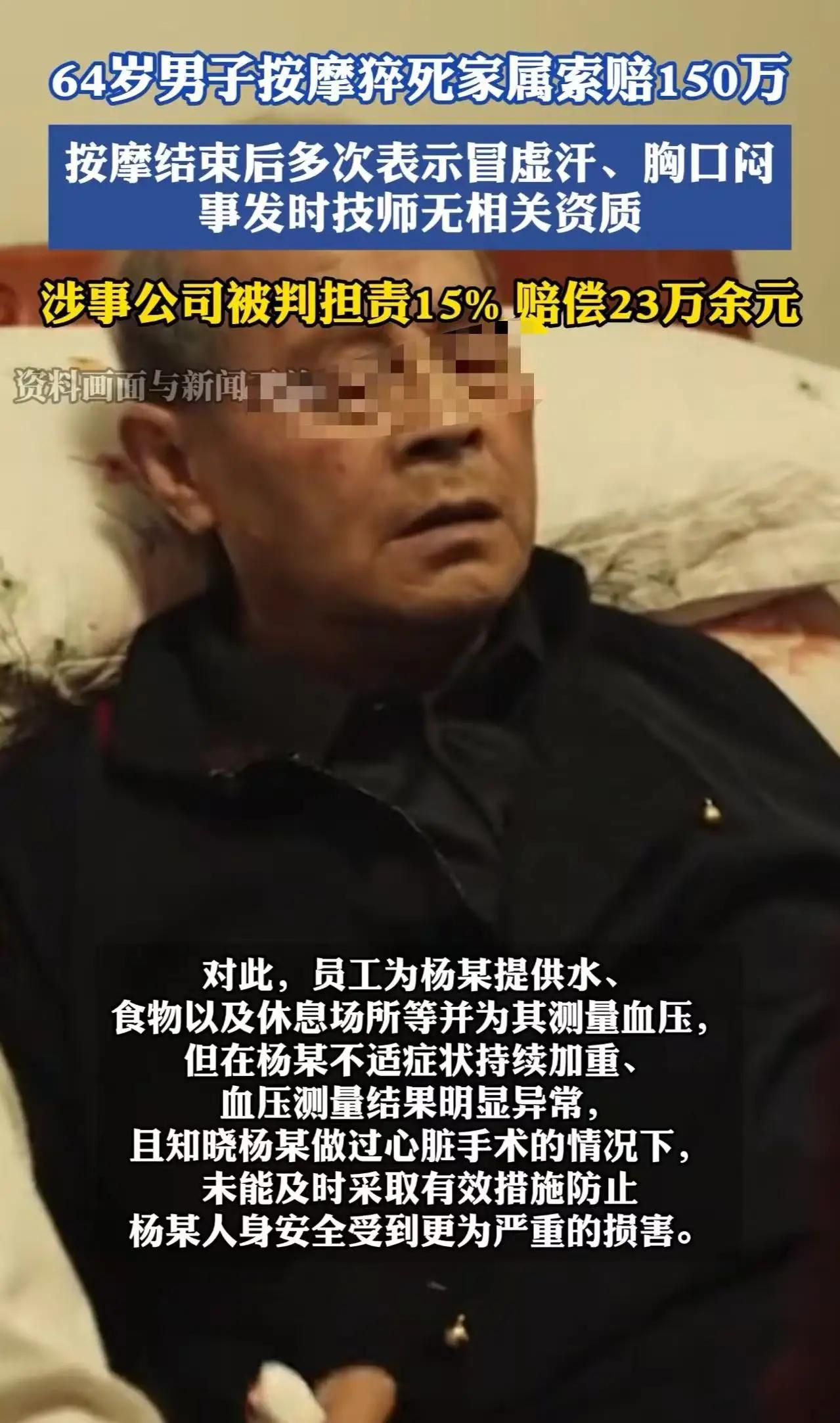 还是大爷玩得花!北京64岁大爷点双技师按摩猝死,家属索赔156万,法院判了:按摩店冤不冤? 北京64岁杨大爷,有严重心脏病、两次搭桥手术史,却偏爱按摩放松。 2024年8月1日下午,他走进常去的健康管理店,一口气点两名女技师,连做背、中焦、腿、腹四项按摩,全程近两小时。 按摩中途,大爷就喊忽冷忽热、身体不适,技师只调空调,没停服务、没问病史,按流程做完。结束后大爷去厕所,回来就拉肚子、冒虚汗、胸口闷、血压骤降,店长劝他去医院,他一口拒绝:“躺会儿就好”。 没多久,大爷突然抽搐、喘不上气,店长才打120、做心肺复苏,但为时已晚,最终心源性猝死。 家属悲痛,一纸诉状将按摩店告上法庭,索赔156万,理由是:店家未尽安全保障义务、操作不当、延误救治。 按摩店喊冤:他自己有重病、拒绝就医,怎么能让我们赔? 双方各执一词,舆论瞬间炸锅。 网友吵翻:谁的锅? 挺家属:双技师高强度按摩、技师无资质、不适时没及时停手、没第一时间送医,店家明显失职。 挺店家:大爷明知自己高危,还硬要多项目、拒绝就医,是自己对生命不负责。 中立派:各打五十大板,大爷主责,店家次责。 法院一锤定音:责任怎么分? 法院审理后认定: 大爷主责(85%):完全民事行为能力人,明知有严重心脏病,仍选择高强度按摩;出现不适后拒绝就医、不联系家属,错失黄金抢救时间,是死亡主要原因。 按摩店次责(15%):存在两处明显过错① 为大爷服务的一名技师事发时无从业资质;② 发现大爷血压极低、胸闷,未及时联系家属、未强制送医,未尽到安全保障义务。 最终判决:按摩店赔偿家属23万余元,二审维持原判。 这件事,给所有人敲警钟 1. 老人别“逞强”:有心脏病、高血压、脑梗等基础病,按摩、理疗、桑拿都有风险,别贪多、别硬扛,不适立刻就医,别拿生命赌“舒服”。 2. 商家别“侥幸”:必须核实顾客健康状况、技师持证上岗、配备急救设备、明确风险提示,顾客不适时优先送医、联系家属,别等出事再后悔。 3. 边界与责任:消费是放松,不是玩命;经营是赚钱,更要守安全。健康面前,没有“玩得花”,只有“守得住”。 一次贪图享受,酿成天人永隔;百万索赔,换不回一条生命。愿悲剧不再重演,愿每个人都对自己、对他人的生命多一份敬畏。