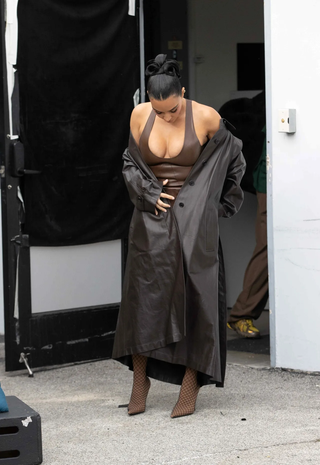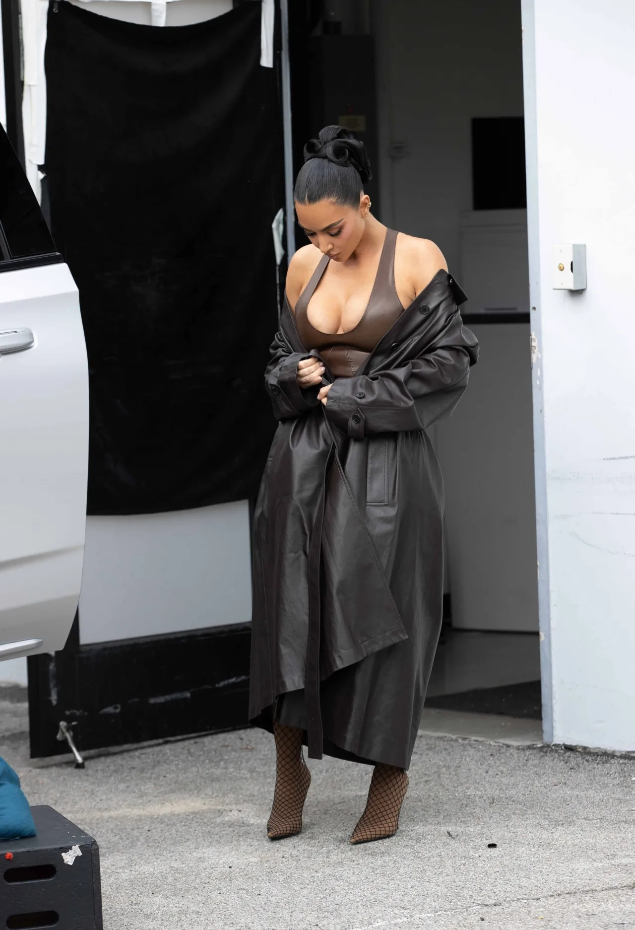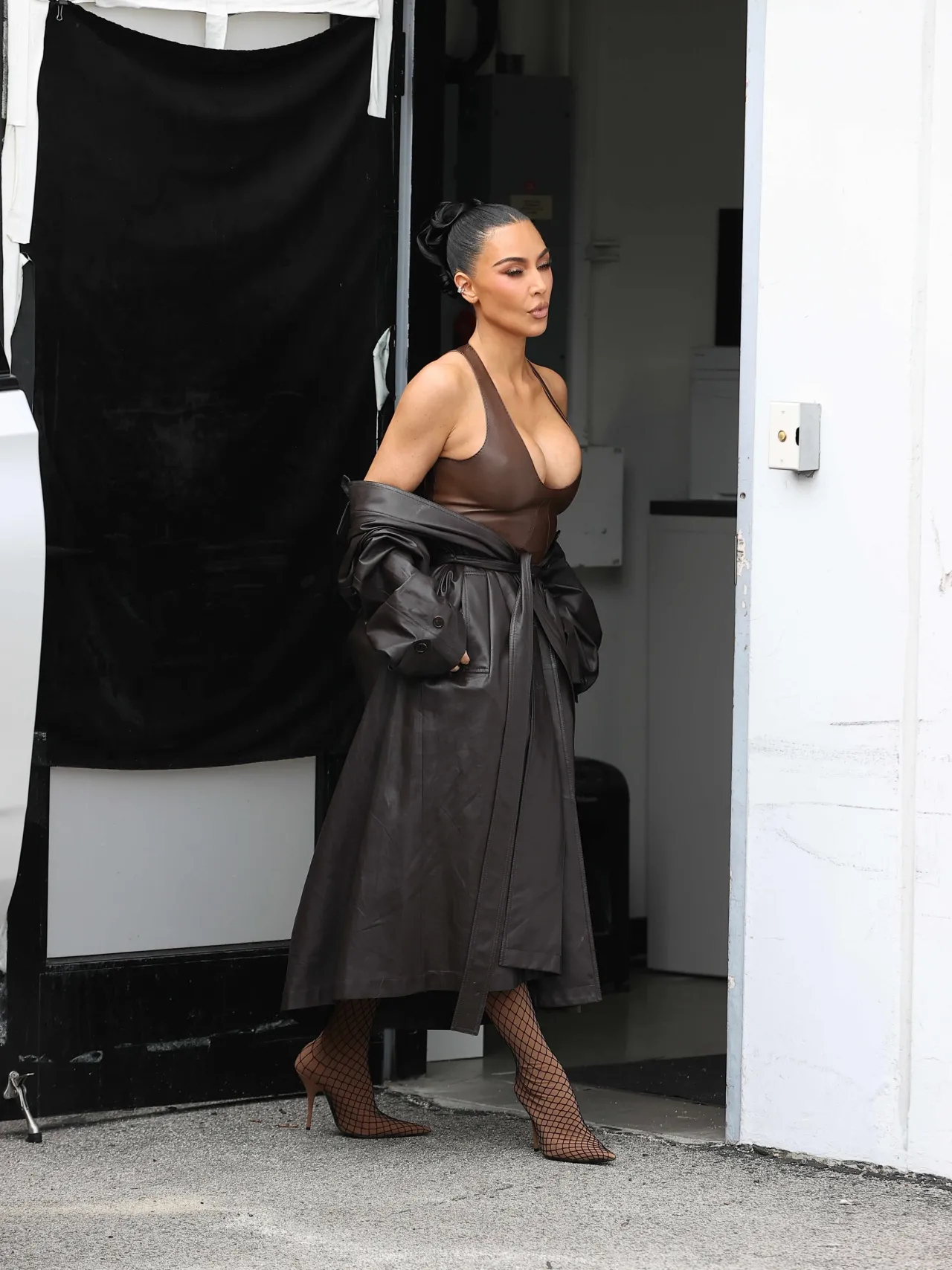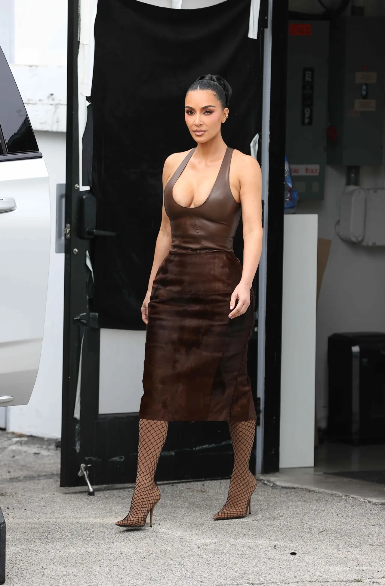 金·卡戴珊在洛杉矶外出拍摄照片,身着棕色露背上衣、同色系短裙和鱼网尖头靴。金姐就