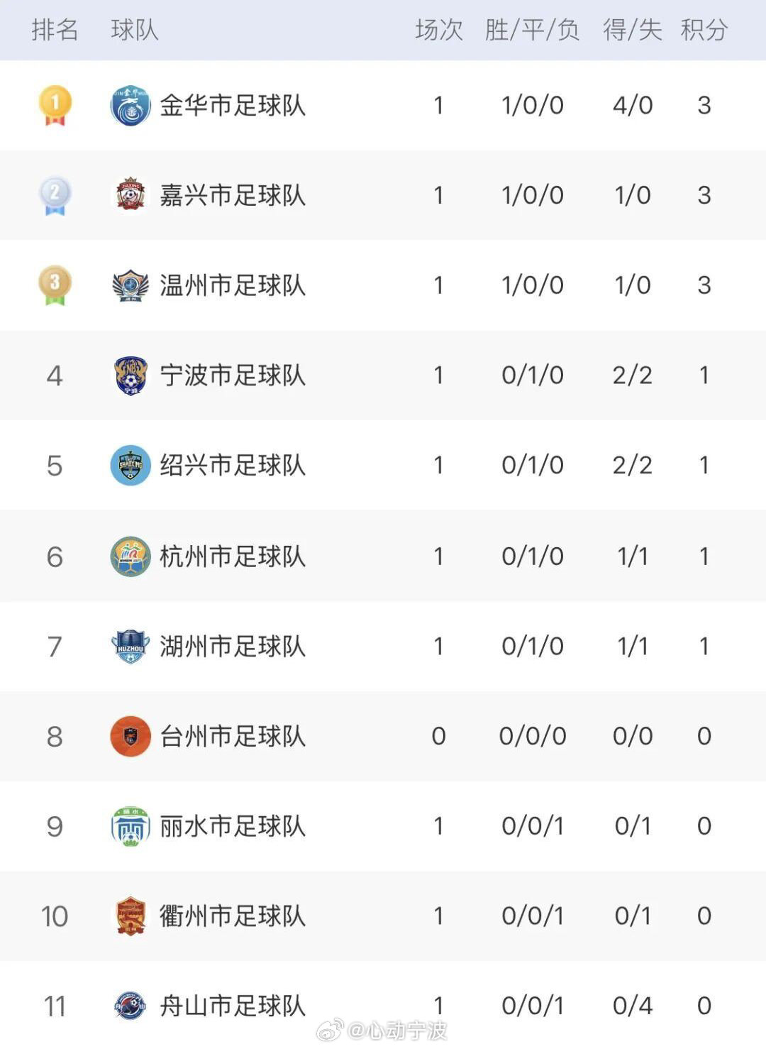 吴越杯首轮宁波两人登射手榜 浙江省城市足球联赛(吴越杯)首轮5场比赛收官,嘉兴、湖州、绍兴、金华、丽水完成主场首秀。宁波客场2:2战平绍兴,王琦、高鹏各入一球。揭幕战嘉兴1:0绝杀衢州;湖州1:1战平杭州,杭州吴昊一打入赛事历史首球;金华4:0大胜舟山;温州1:0客胜丽水。首轮12人登射手榜,金华4人、宁波2人、绍兴2人。宁波队主帅赵昌宏称将调整状态,4月12日宁波将在奉化体育中心主场迎战湖州。(甬派)宁波草根球王逐梦吴越杯暖心中国