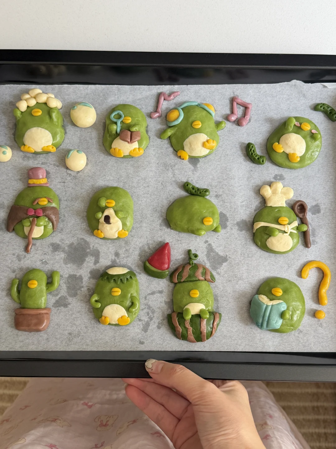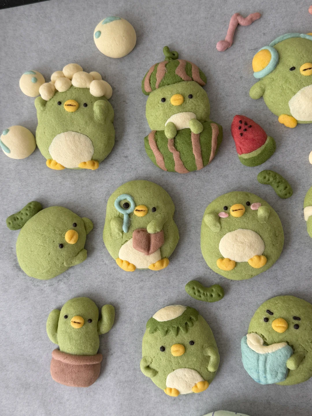 4️⃣面团上色(黄色:南瓜粉 棕色:可可粉 粉色:仙人掌果粉 蓝色:天蓝色色素 绿色:抹茶粉 )