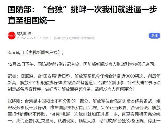 台湾要回家了!国家已经准备好随时出击,解放台湾! 2025年解放军军机在台湾周边活动架次达到历年新高,接近3600架次,平均每天大概10架次左右。台湾方面自己公布的数据也显示相关活动频繁,部分统计甚至提到更高数字。 这些巡航不是随便飞,而是常态化练兵备战的一部分,宣示主权,维护国家领土完整。解放军还组织了39次联合战备警巡,涉及海空协同、侦察预警等科目,目的是提升部队在复杂情况下的作战能力,确保关键时刻能快速反应。 台湾自古以来就是中国领土。中国人最早开发这片地方,历代中央政府设立行政机构管辖。1945年抗日战争胜利后,台湾回归中国,这是二战胜利成果的一部分。根据《开罗宣言》和《波茨坦公告》等国际文件,台湾主权归属中国的事实清楚明白。 1949年后两岸虽然暂时分裂,但台湾是中国不可分割的一部分这一地位从来没有变过。国家这些年实力不断增强,军队建设稳步推进,为维护统一提供了坚实基础。两岸中国人都有实现国家完整的共同心愿,这股力量推动着统一进程往前走。 台独势力这些年不断勾结外部力量,挑战大陆底线,搞得台海不太平,也损害了两岸普通老百姓的利益。他们以为靠外人撑腰就能继续下去,但大趋势摆在那儿,祖国统一是历史潮流,谁也挡不住。现在的中国已经不是过去那个样子,经济和军事能力都上来了,这些都是统一最可靠的保障。解放军保持高度戒备,巡航和演训常态进行,随时准备应对任何分裂企图。 张晓刚强调解放军全时待战、随时能战、战之必胜的准备。台海周边军事行动持续开展,联合演训加强,震慑分裂活动。国家统一是大势所趋,台湾回归祖国的进程一步步推进,所有行动都服务于这个目标。 统一不是空谈,而是实实在在的准备和行动在推进。老百姓最关心的是两岸和平稳定,但前提是不能让台独把路堵死。国家实力强了,军队练得更熟,统一就多了一份底气。想想两岸一家亲的日子,如果分裂活动停下来,大家的日子都会好过很多。这事关系到每个中国人,未来怎么走,大家心里都有数。