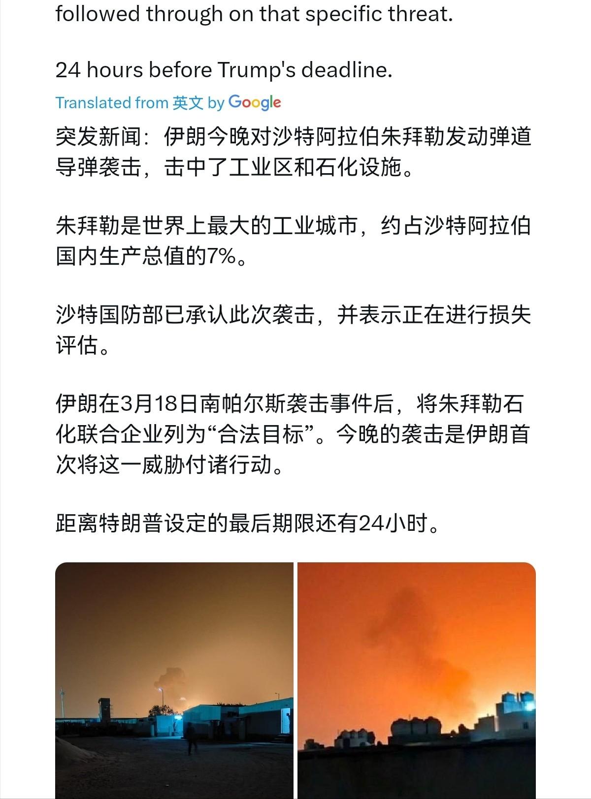 没谈成!伊朗也不客气了!伊朗对准沙特的最大工业城市就是一顿炸! 4月7日,根据外媒报道,伊朗对沙特阿拉伯朱拜勒进行了弹道导弹袭击,而导弹击中了工业区和石化设施。相关信息显示,朱拜勒是沙特最大的工业城市,约占沙特阿拉伯GDP的7%。沙特国防部承认了这次袭击,并表示正在进行损害评估。 很显然,美伊双方没有谈拢,而美国和以色列刚对伊朗的南帕尔斯,阿萨卢耶等能源项目进行轰炸,伊朗很快就采取回应动作了。 其实美伊谈判的破裂,早已埋下伏笔。美国总统特朗普在4月6日一天内两次公开表态,给伊朗设定了美东时间4月7日20时的“最后期限”,还威胁称,若伊朗不妥协,将在4小时内摧毁伊朗境内所有桥梁和发电厂。 面对这份强硬的最后通牒,伊朗没有丝毫退让。伊朗武装部队发言人直接怒斥特朗普的言论充满“妄想”,强调伊朗拒绝任何胁迫性谈判,还明确排除临时停火的可能,要求必须永久结束冲突、解除对伊制裁,这也成为美伊谈判彻底谈崩的关键原因。 伊朗的反击来得迅速且精准,没有丝毫犹豫。此次被袭击的朱拜勒工业区,不仅是沙特最大的工业城市,更是全球重要的石化生产基地,年产量约6000万吨石化产品,占全球总产量的6%至8%。 新华网4月7日援引伊朗法尔斯通讯社报道,朱拜勒工业区内聚集着多家大型石化企业,其中包括沙特基础工业公司,以及美国陶氏化学、法国道达尔能源参与投资的重点项目,伊朗的导弹打击,无疑精准击中了沙特的经济命脉。 沙特国防部在声明中提到,当天成功拦截并摧毁了7枚向东部发射的弹道导弹,但仍有部分导弹碎片落在能源设施附近,目前正在全面评估损失。不过从朱拜勒的产业地位来看,即便只是部分设施受损,也会引发连锁反应。 据相关分析,朱拜勒工业区内的萨达拉化学项目(沙特阿美与陶氏化学合资)此前已因冲突临时停产,此次袭击无疑会加剧产能停摆的困境。这家斥资200亿美元建成的综合体,是沙特唯一的MDI/TDI供应源,占据中东90%以上的市场份额,其停产将直接导致相关石化产品出口收入锐减。 此次袭击并非孤立事件,而是美以伊战事升级的延续。截至4月7日,美以伊战事已持续近40天,战火早已从军事目标蔓延到民用基础设施。 4月6日当天,以色列不仅轰炸了伊朗的石化设施,还对伊朗首都德黑兰发动大规模空袭,袭击了三座机场和谢里夫理工大学,伊朗伊斯兰革命卫队“圣城旅”指挥官阿斯加尔·巴盖里也在袭击中身亡。 伊朗在此前的反击中,已对以色列本土、美国两栖攻击舰“的黎波里”号,以及阿联酋、科威特的相关目标发动打击,而此次将目标对准沙特,背后有着深层的战略考量。 要知道,沙特与美国长期保持盟友关系,虽在2023年在中国斡旋下与伊朗恢复外交关系,但始终没有完全脱离美国的军事体系。伊朗选择袭击沙特的核心工业城市,既是对美以轰炸伊朗能源设施的报复,也是向沙特释放信号——若继续依附美国、配合美以对伊行动,必将付出代价。 面对当前的紧张局势,国际社会的反应各不相同。联合国秘书长发言人对特朗普威胁摧毁伊朗民用设施的言论表示震惊,强调任何针对民用基础设施的攻击都违反国际法。而美国、英国、法国等西方国家则罕见沉默,并未像以往那样公开指责伊朗,背后或许是对中东局势失控的担忧。 目前,朱拜勒工业区的具体损失仍未公布,但此次袭击已直接影响全球能源市场预期。霍尔木兹海峡局势本就高度紧张,作为全球重要石化基地的朱拜勒遇袭,进一步加剧了市场对石油、石化产品供应短缺的担忧,布伦特油价已出现明显波动。 美伊谈判破裂、伊朗反击沙特、美以持续空袭,中东局势已进入高度紧张的临界点。后续,若美以继续加码对伊打击,伊朗大概率会发起更猛烈的报复,而沙特的应对态度,也将直接影响地区局势的走向。 伊朗此次反击始终保持克制,并未主动扩大冲突范围,其核心诉求仍是迫使美以停止军事打击、解除制裁。但在特朗普的强硬施压和以色列的持续挑衅下,这场围绕中东能源和地缘利益的博弈,恐怕还会持续升级。