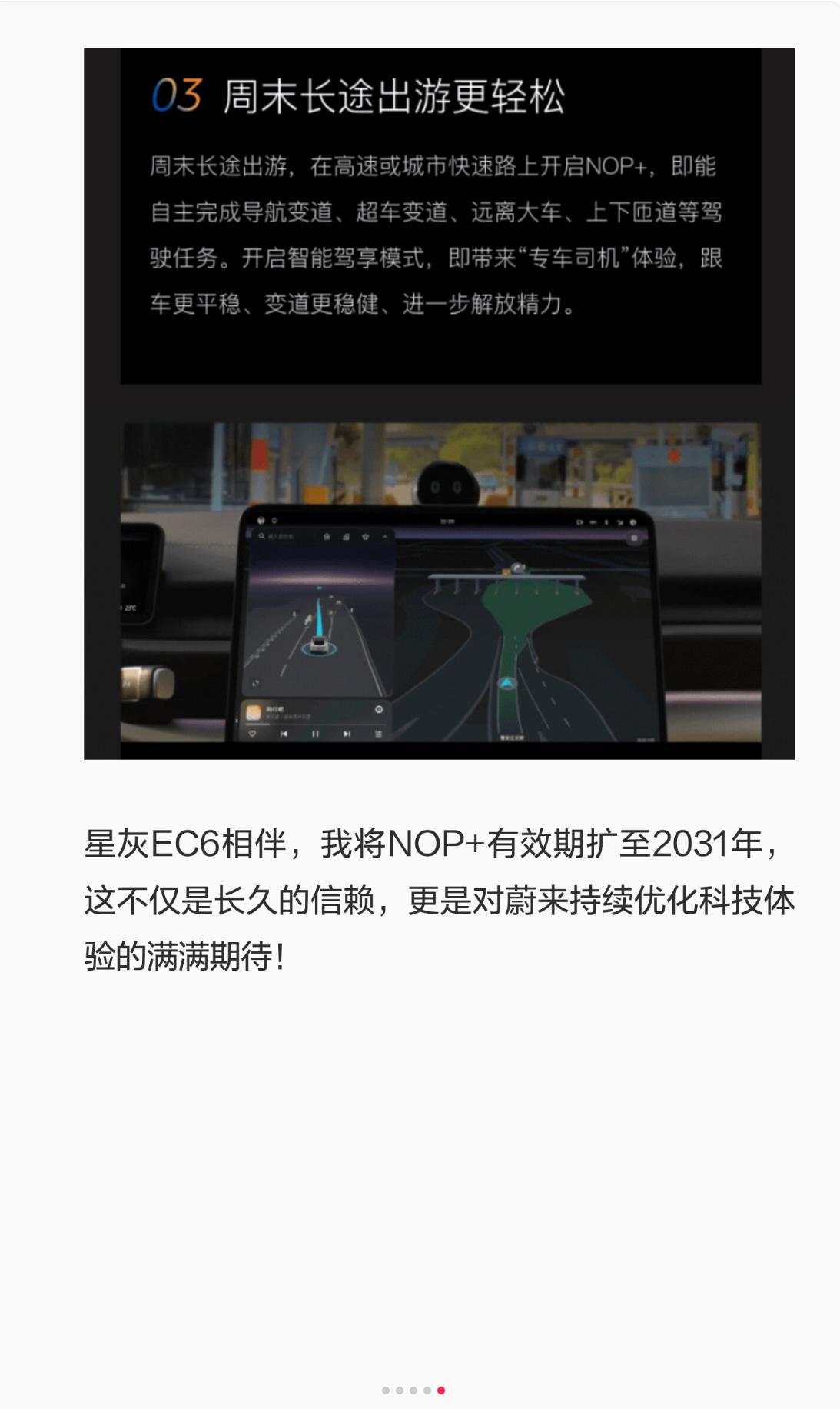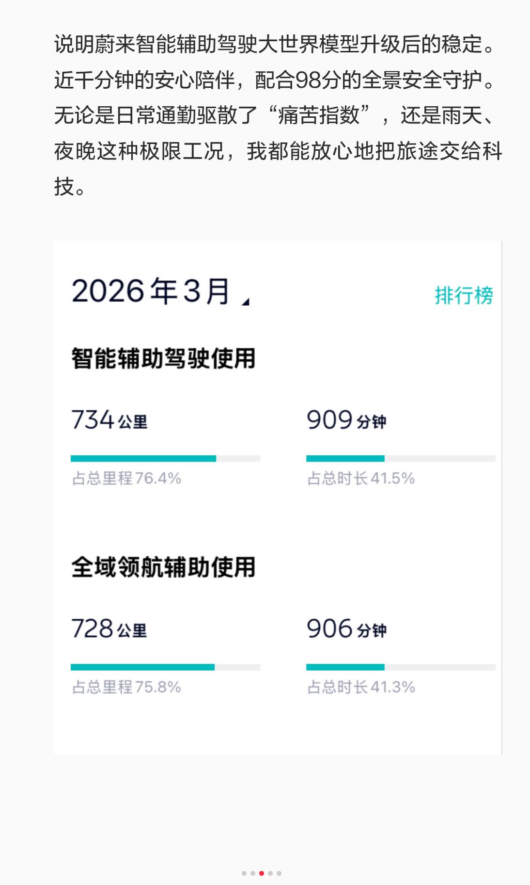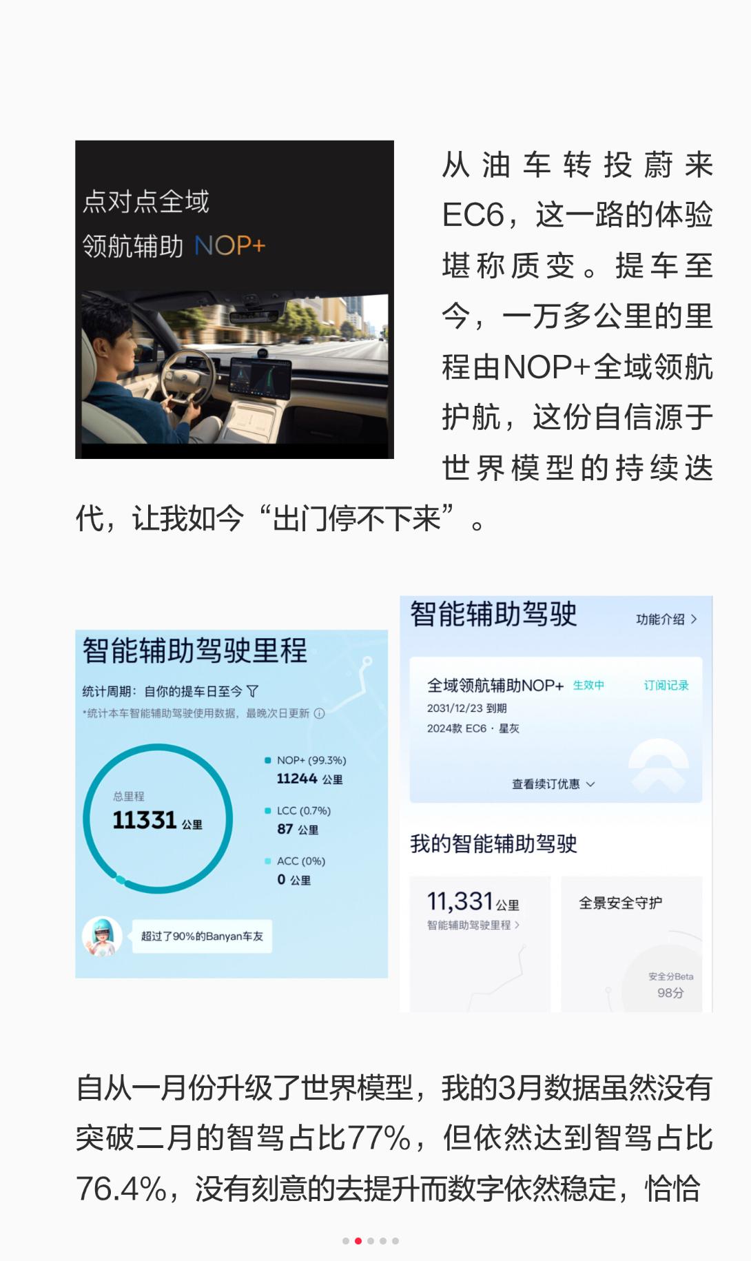 智驾重度用户激增,蔚来智驾升级有多成功 从油车转投蔚来EC6,这一路的体验堪称质变。提车至今,一万多公里的里程由NOP+全域领航护航,这份自信源于世界模型的持续迭代,让我如今“出门停不下来”。 自从一月份升级世界模型以来,3月数据虽然没有突破二月的智驾占比,但依然达到智驾占比76.4%,没有去刻意的提升而数字依然稳定,恰恰说明蔚来智能辅助驾驶大世界模型升级后的稳定。近千分钟的安心陪伴,配合98分的全景安全守护。无论是日常通勤驱散了“痛苦指数”,还是雨天、夜晚这种极限工况,我都能放心地把旅途交给科技。 目前我的智驾分稳定在98分,人机共驾默契渐深。更惊喜的是行业数据——版本更新后,智驾占比超50%的用户数环比激增115.4%;蔚来智驾总里程单月首次突破2亿公里,环比增长81.8%。 星灰EC6相伴,我将NOP+有效期扩至2031年,这不仅是长久的信赖,更是对蔚来持续优化科技体验的满满期待!蔚来 蔚来EC6 蔚来智驾