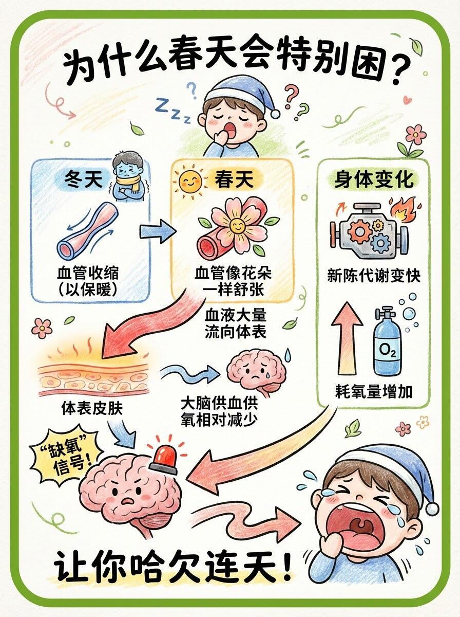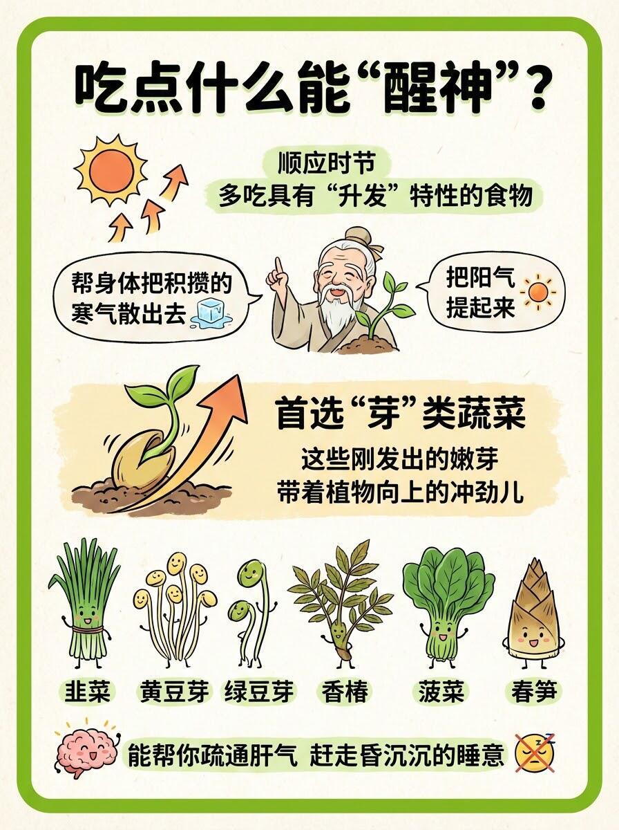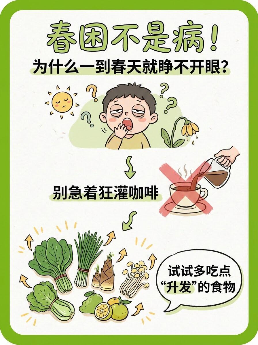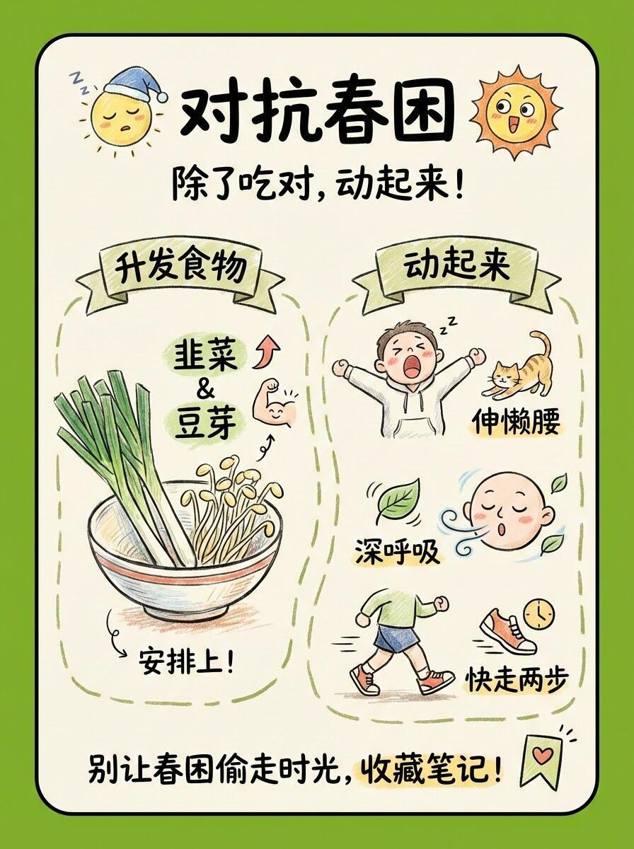 为什么春天容易困?多吃“升发”食物🌱 最近是不是总觉得睡不醒?明明睡够了8小时,白天还是哈欠连天?别担心,这其实是身体在“换季”!💡 为什么会春困?简单来说,就是天气暖和了,血管舒张,大脑供血相对减少,加上代谢加快耗氧量大,大脑“缺氧”啦。🥗 吃对食物,把“瞌睡虫”吃走!春天要多吃“升发”的食物,顺应阳气生发。✅ 推荐清单:韭菜、豆芽、香椿、春笋、菠菜。这些带着“向上冲劲”的蔬菜,能帮你提神醒脑,疏通肝气。🚫 避坑指南:不要因为困就蒙头大睡,睡太多反而越困!午睡20分钟+清淡饮食+伸个懒腰,才是正解。💪 趁着春光好,赶紧动起来,把身体唤醒吧!