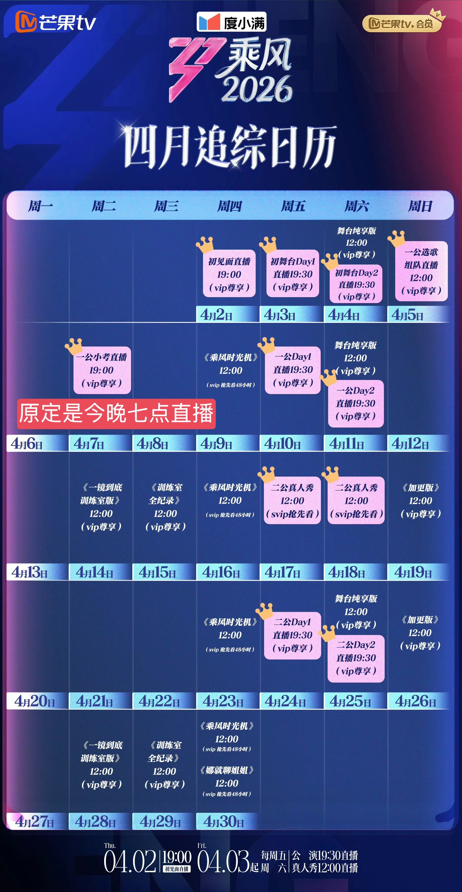 浪姐一公小考取消直播 乘风2026追综日历更新,原定今晚七点直播一公小考的取消了