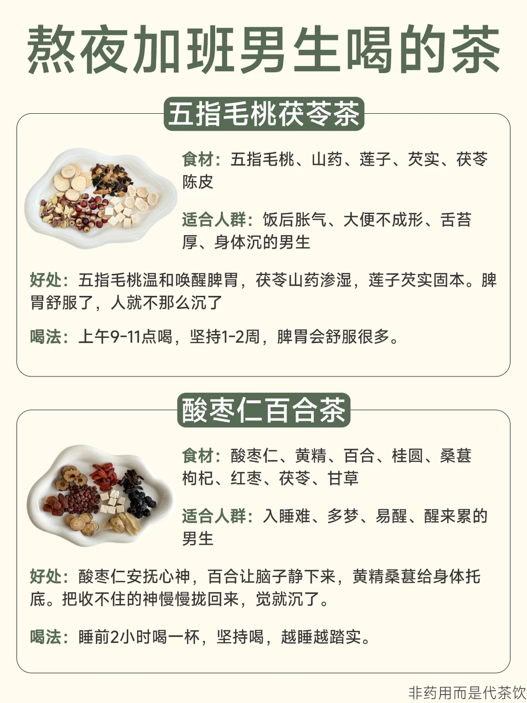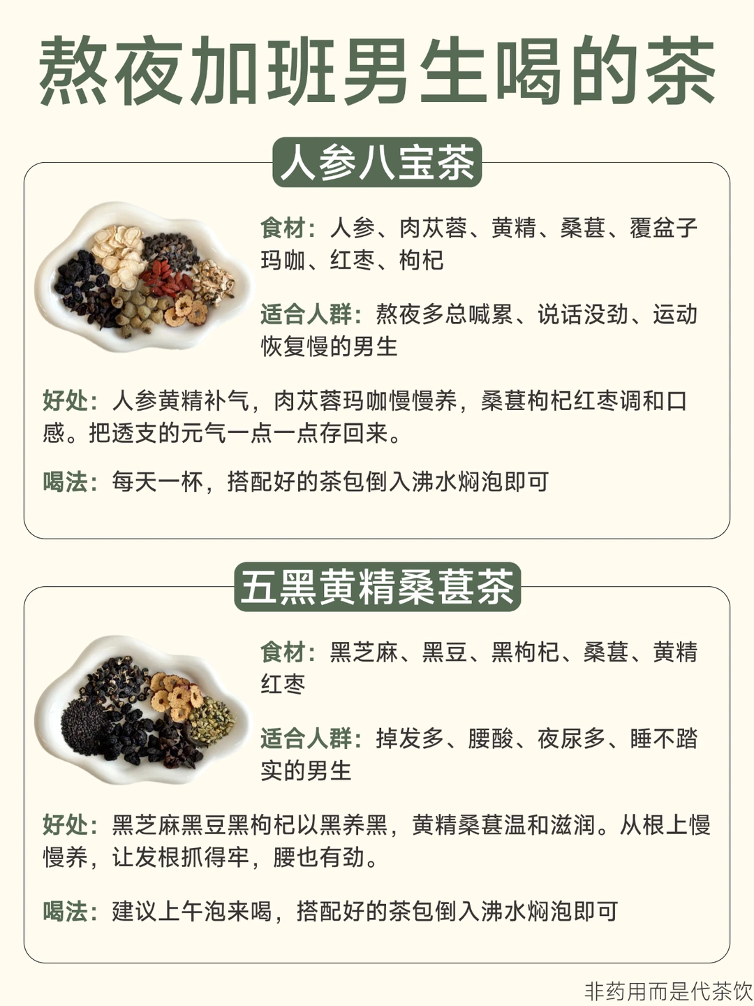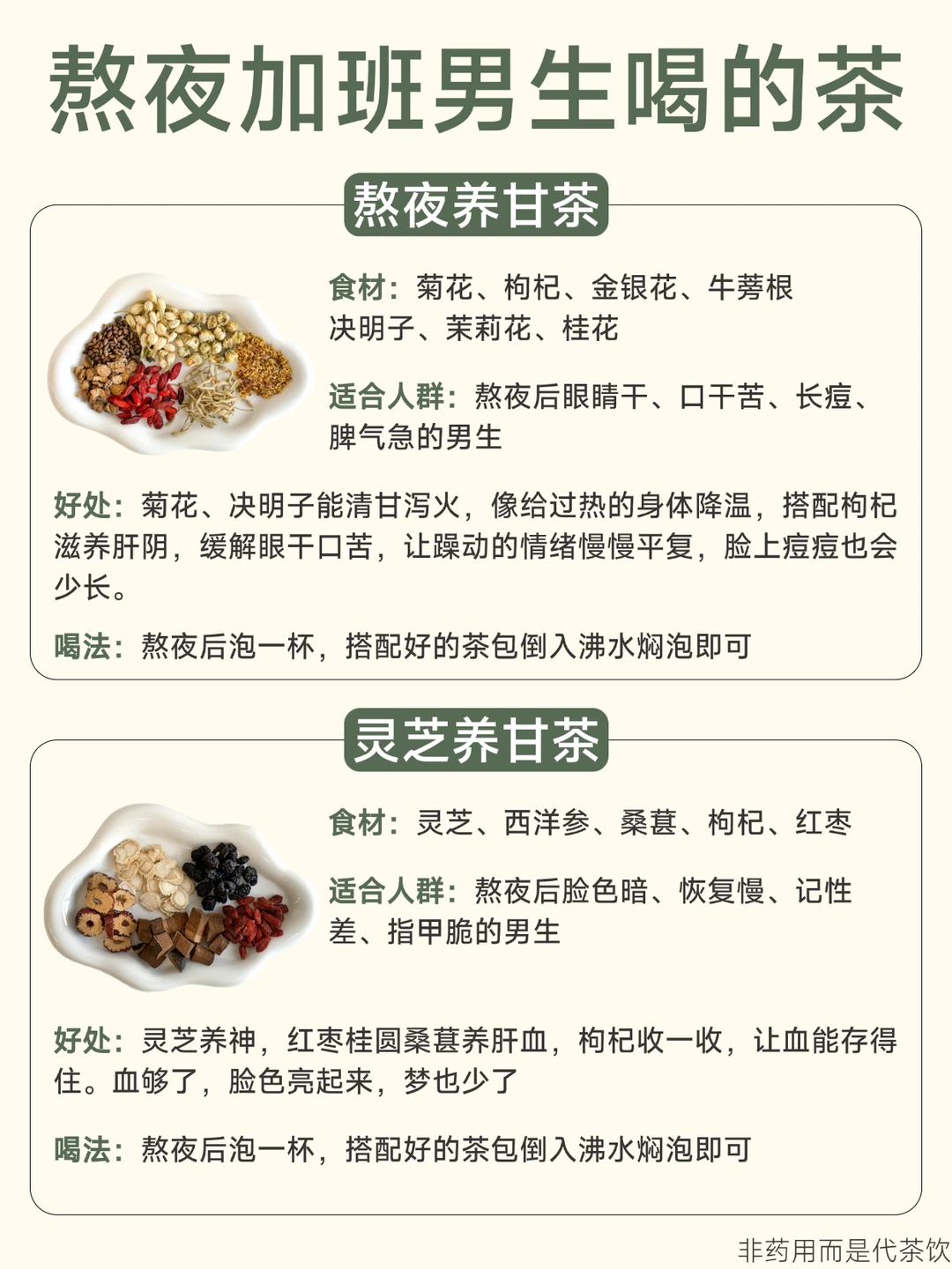 现代男生工作强度大,经常熬夜加班 熬到1、2点甚至通宵赶工 久而久之,身体就像持续高负荷运转的机器, 开始出现各种“故障”: 👉眼睛干涩发痒、脸色蜡黄爆痘, 👉早上爬起来头昏脑涨,上班心慌气短 👉晚上躺下又翻来覆去睡不着, 👉总觉得腰酸背痛,整个人提不起劲。 别以为这只是单纯的“累” 长期熬夜其实是在透支身体的气血和脏腑功能 光靠补觉很难缓过来,得用精准的养生茶给身体“定向回血”。 分享6款滋补茶,针对熬夜后不同的身体损耗 喝对了比睡懒觉管用得多! - 非药用而是代茶饮