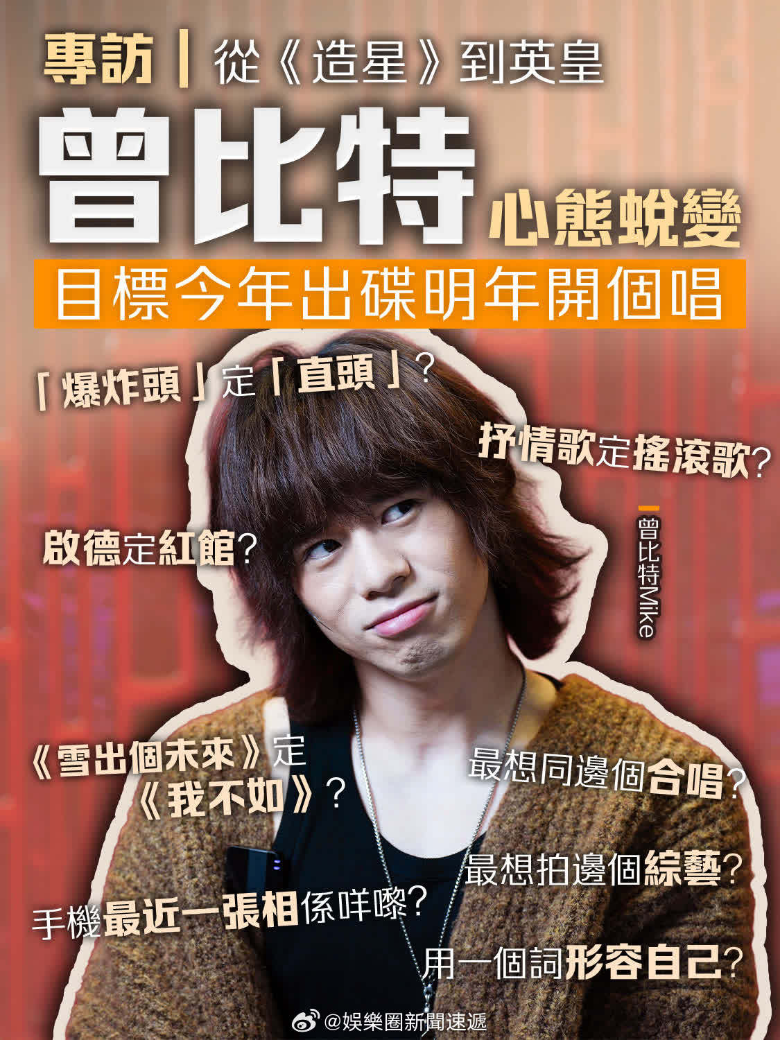 「(有視頻)專訪預告|香港知名當紅男歌手「終極二揀一」大公開!答案有驚喜 … (大公文匯全媒體記者 梁譯尹)「爆炸頭」定「直頭」?九龍啟德主場館定紅館?「雪出個未來」定「我不如」?連環追問下,香港知名當紅男歌手曾比特 (Mike)會如何快速選擇,回應又是否出乎意料呢?點新聞帶你一齊尋找答案!日前,曾比特接受點新聞專訪時分享自己的工作近況及新歌計劃,並透露將於25+英皇群星演唱會 ()帶來熱血舞台,而快問快答環節的回答更令人驚訝!原來他的手機最近一張照片是...收工後會做的第一件事是...想了解更多內容,敬請期待4月8日播出的專訪正片..」入內看視頻及全文:网页链接 即时娱乐新闻 娱乐圈 电影 电视 音乐 乐坛 .. 香港