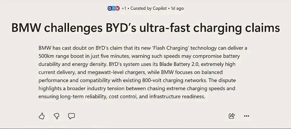 近日,宝马电池生产负责人在接受澳洲媒体采访时谈到比亚迪刚发布的闪充技术,大意就是:超高充电速度看起来很惊艳,但背后一定存在代价,尤其是在耐用性、续航、热管理和长期可靠性这些方面,不可能只把充电速度拉满,别的性能却完全不受影响。