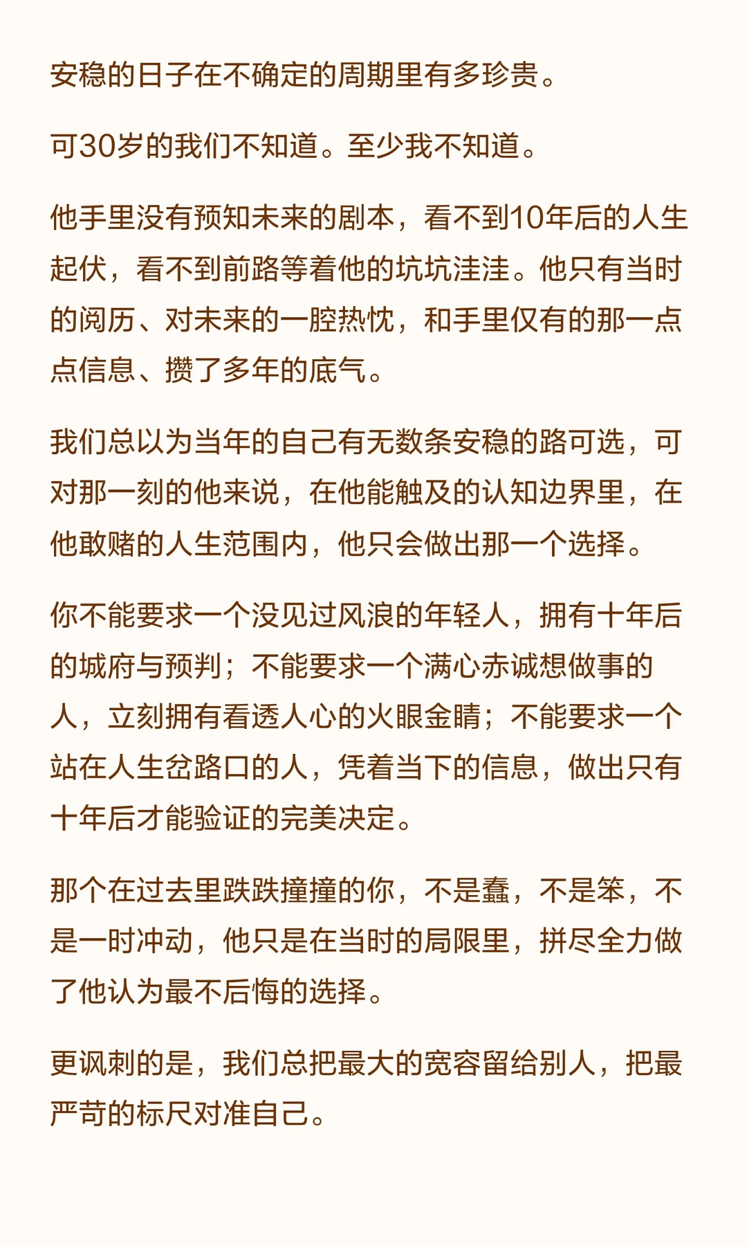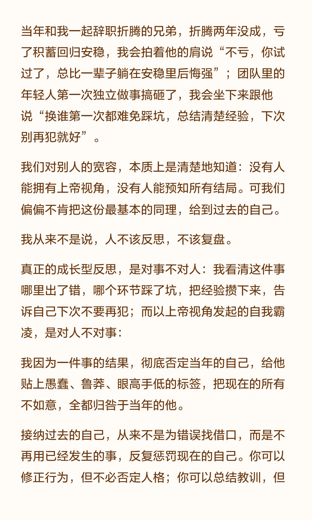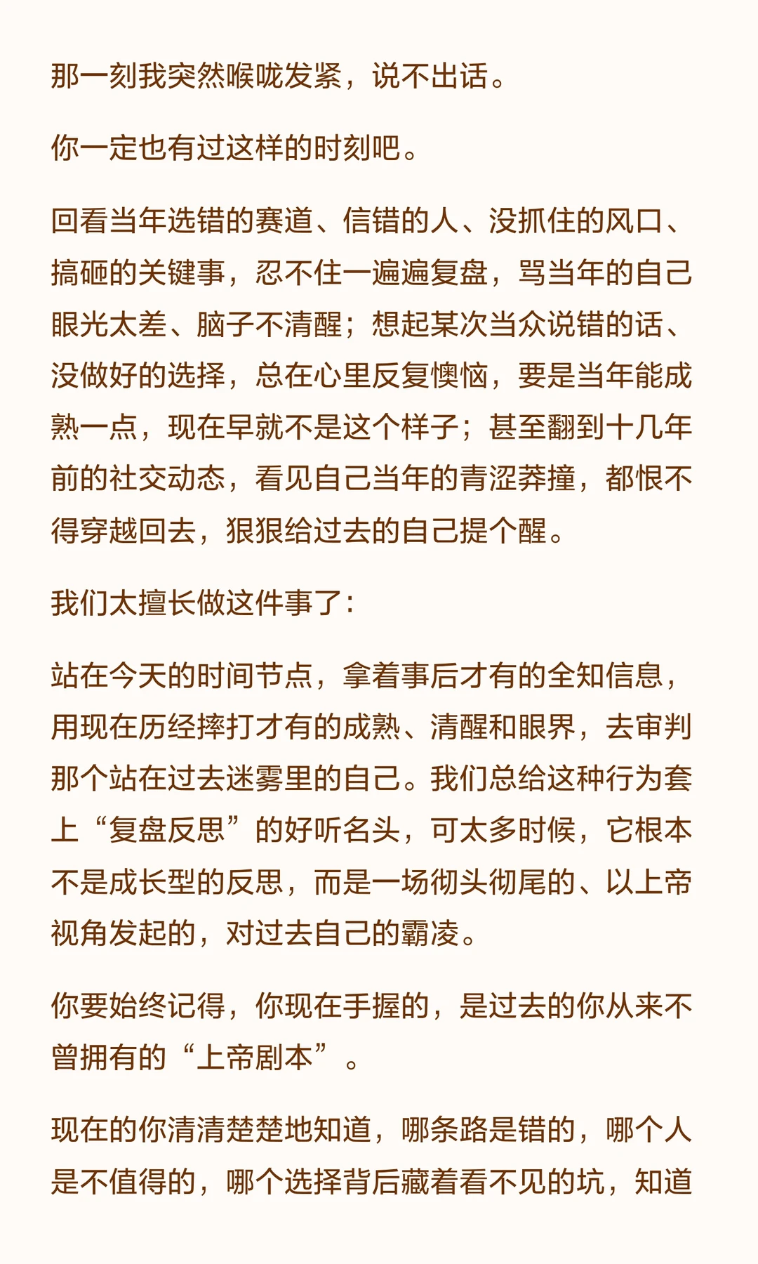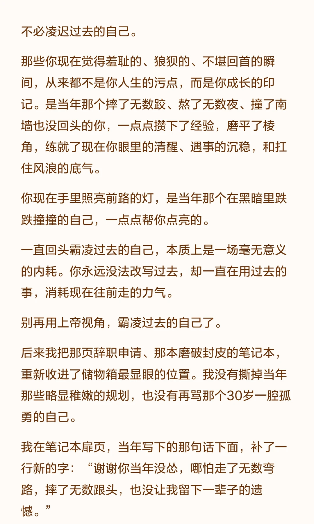 回看过去,我们常对当年的自己苛责,却忘了那时的局限与选择。 真正的成长是反思错误,而非自我审判。 过去的自己虽犯错,却为现在的成熟与经验奠定了基础。别再用上帝视角霸凌过去,感谢那份勇敢与坚持。