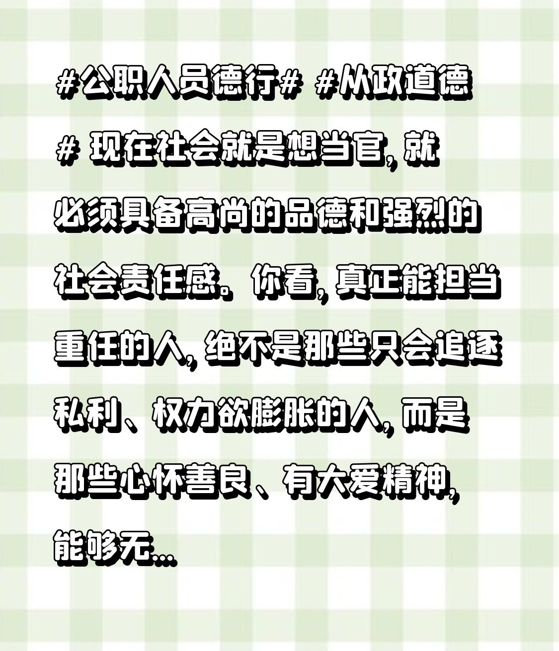 现在社会就是想当官,就必须具备高尚的品德和强烈的社会责任感。你看,真正能担当重任的人,绝不是那些只会追逐私利、权力欲膨胀的人,而是那些心怀善良、有大爱精神,能够无私奉献、甘于付出的人。因为当官,不仅仅是一种身份的象征,更是一份沉甸甸的责任,是对人民群众的承诺。 但现实却往往让人失望:多少官员在权力的诱惑面前迷失了方向,忘记了初心和使命?多少“为官一任,造福一方”的美好愿景,被贪婪和自私撕得粉碎?这不仅是个人的悲剧,更是社会的悲哀。我们渴望看到的是那种“清正廉洁、为民务实”的好官,而不是“狼狈为奸、贪腐成性的坏官”。 为什么有些人能做到无私奉献?因为他们内心有一把衡量利害的尺子,他们懂得权力是用来服务人民的,而不是用来谋取私利的工具。他们知道,只有心怀大爱,才能赢得群众的信任和尊重;只有保持善良,才能在复杂的权力斗争中守住底线;只有无私奉献,才能让社会真正变得更加公平和美好。 这也提醒我们,每一个有志于为官的人,都应该先修炼自己的品德和心性,真正把人民的利益放在第一位。社会也应当为这样的好官创造良好的环境和制度保障,让他们能安心做事,无后顾之忧。毕竟,制度的完善和道德的坚守,缺一不可。 你有没有发现,那些真正让人敬佩的官员,他们的故事往往最打动人心?他们用行动诠释了什么叫“为人民服务”,他们用实际成绩回应了群众的期待。这才是我们社会最需要的榜样和力量。 所以,想当好官,先当好人。品德高尚、责任在肩、心怀大爱,这才是通往真正权力的唯一通道。你怎么看?你身边有没有这样让你敬佩的“好官”?欢迎留言分享你的故事和看法! 公仆责任感 公职人员履职 官先守法