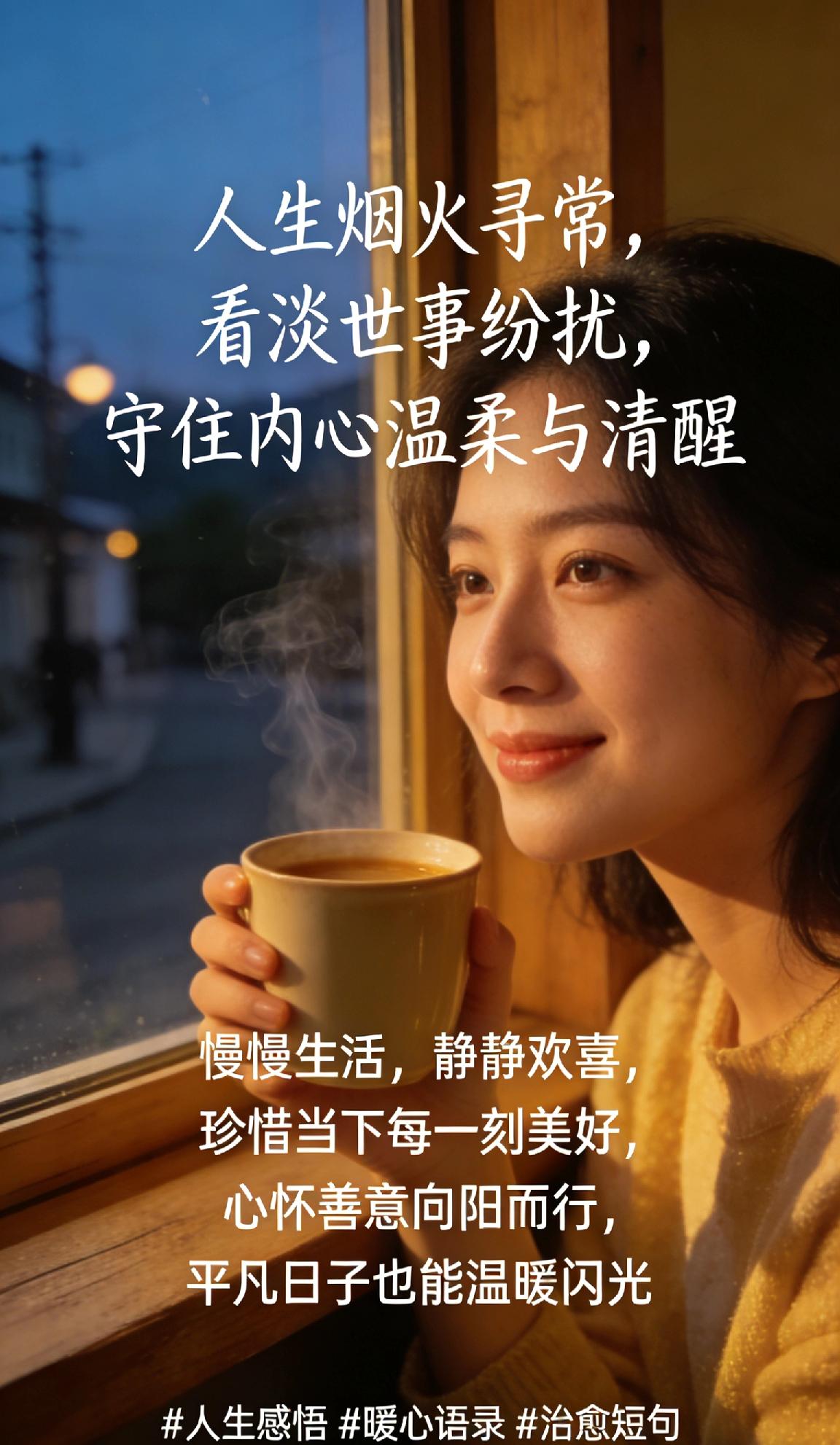 人生烟火寻常,看淡世事纷扰,守住内心温柔与清醒。慢慢生活,静静欢喜,珍惜当下每一