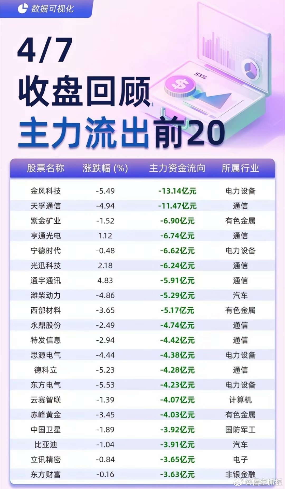 4月7日A股收盘,主力资金动向一目了然!流入榜中,中际旭创以7.31亿元净流入领跑,诺德股份、蔚蓝锂芯等电力设备赛道个股集体获资金追捧,北方稀土、中国船舶等板块龙头也获主力加仓。反观流出榜,金风科技、天孚通信分别以超13亿、11亿的净流出居前,通信、电力设备赛道部分个股遭遇资金抛售,宁德时代、比亚迪等权重标的也出现不同程度资金撤离。资金冷暖分化明显,后续市场风格如何演绎,值得持续关注。数据仅供参考,不构成投资建议!