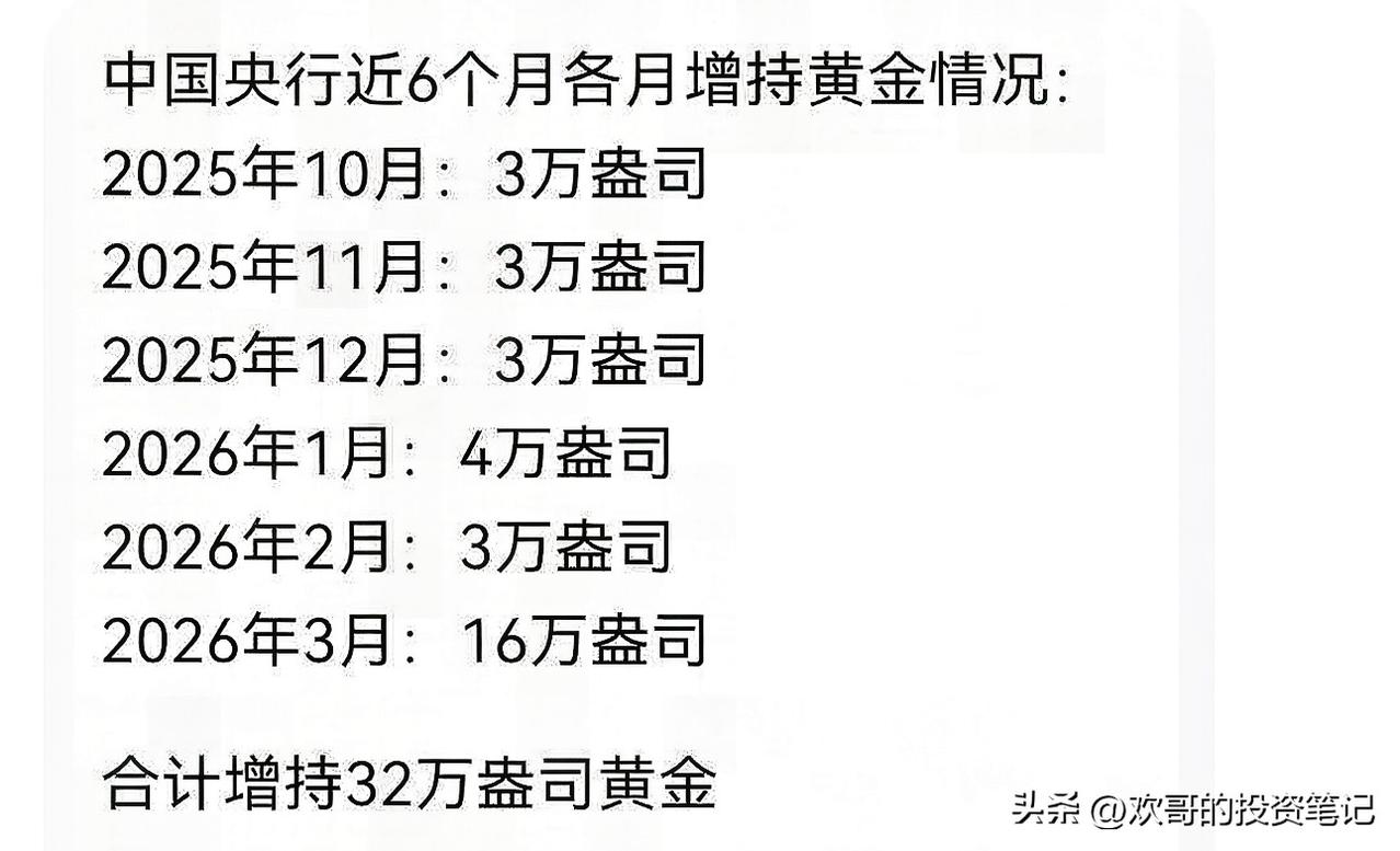 现在的紫金矿业,按2026年测算的业绩算,PE只有10到11倍。 估值低得令人发指。 市场好像彻底忽略了它未来的产量增长预期。 但产量增长能带来的业绩双位数增速,有个大前提——金属价格不能跌。 现在的核心矛盾,是市场还没完全打消对美联储加息的疑虑。 真要是落地加息,有色金属价格下行,合理估值就得全部重算。 这就是紫金股价一直踌躇不前的根源。 LME铜、COMEX铜,过去一个月累计跌了3.3%到3.9%。 2026年开年,它们从1月的历史高点大幅回调,现在仍处在高位震荡区间。 哪怕跌了这么久,同比去年还是大涨了36%左右。 全球铜矿供应紧张,是人力扭转不了的定局。 就像你日渐后移的发际线,非战之罪。 短期的回调,无非是需求预期来回摇摆,美元走势捣乱,部分库存去化慢了半拍。 仅此而已。 当前的铜价,处在高位回调后的相对低位震荡,对紫金矿业的基本面依然有足够支撑。 股价也如预期跌破了34块。 4月的铜市,整体还是库存下行、价格震荡的格局。 另一边,央行已经连续17个月增持黄金。 最新黄金储量涨到7438万盎司,前值是7422万盎司。 黄金储备价值3427亿美元,前值3876亿美元。 截至3月底,外汇储备3.3421万亿美元,前值3.4278万亿美元。 按1000元/克估算,央行3月单月增持的黄金,规模大概在50亿人民币。 很多人拿着磨人的紫金,满肚子怨气。 其实惩罚它最好的方式,就是保持情绪稳定。 稳住心态。 每支股票,都有一段难熬的低迷期。 你越是情绪稳,投资就越稳当。 我手里的紫金矿业,继续持仓,待涨。