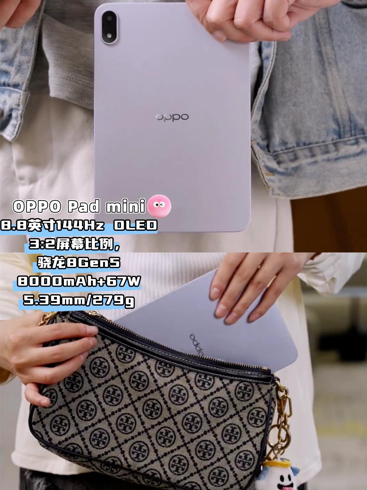 没想到iPad mini的对手OPPO小平板这么小巧 相信很多人喜欢iPad mini就是因为它足够轻薄小巧吧,而安卓这边很少把配置和轻薄做到很全面的,今天看到OPPO Pad mini曝光了,我知道它很轻薄但没想到能塞进这么多包! - 日常的手提包、运动小包、斜挎包甚至口袋也能装下去,哈哈,OPPO家栋今天估计亏很多钱了,这么多包,一人就一百了。 - 配置的话,OPPO Pad mini挺全能的,8.8英寸144Hz OLED屏幕,8000mAh+67W,骁龙8Gen5,5.39mm/279g,不到300g的重量,机身的配置却挺全面的,小平板就得这样吧,携带方便,随时随地掏出来看视频、打游戏,你们说呢? - 小平板 OPPO小平板 OPPOPadmini iPadmini 平板