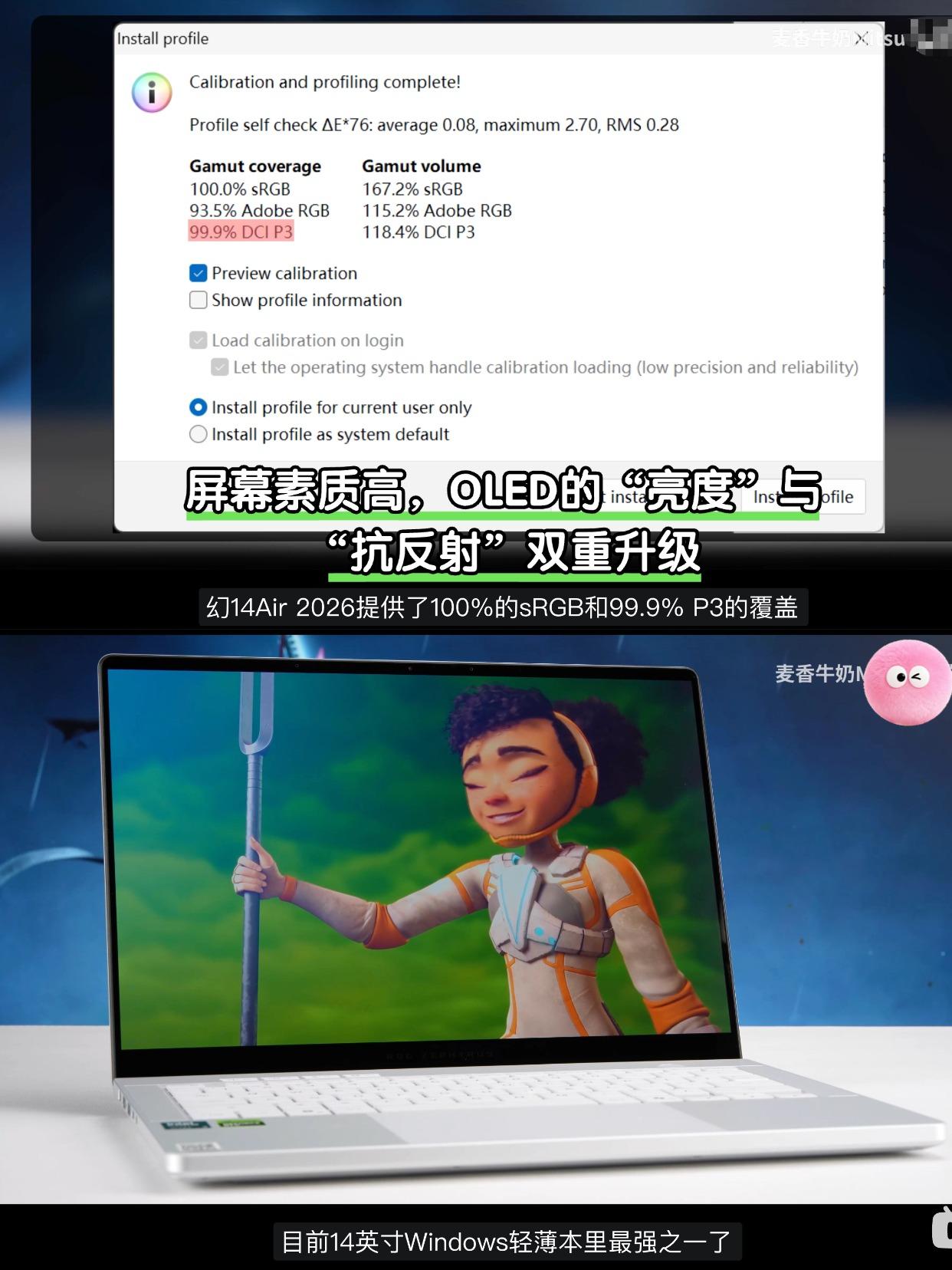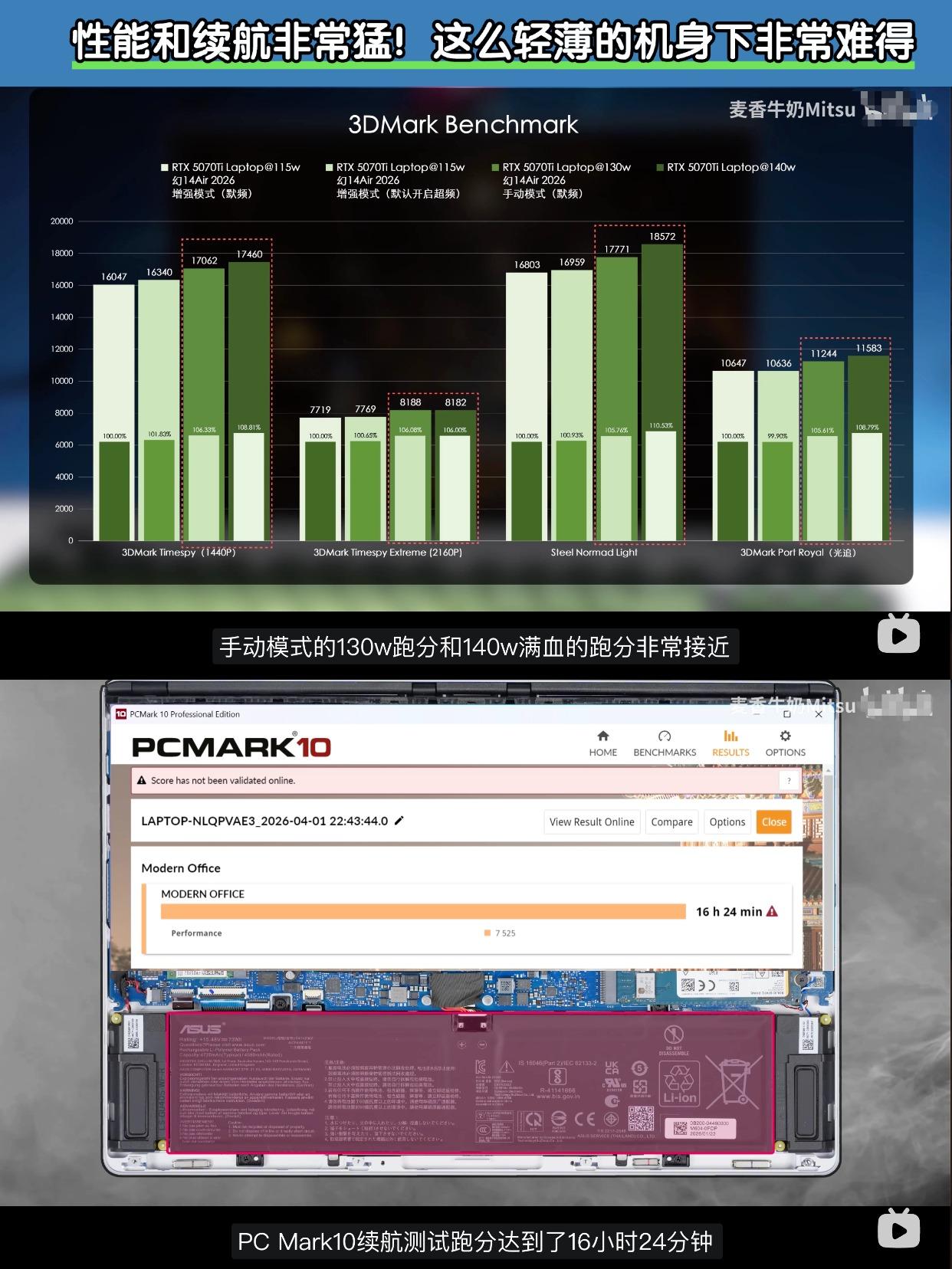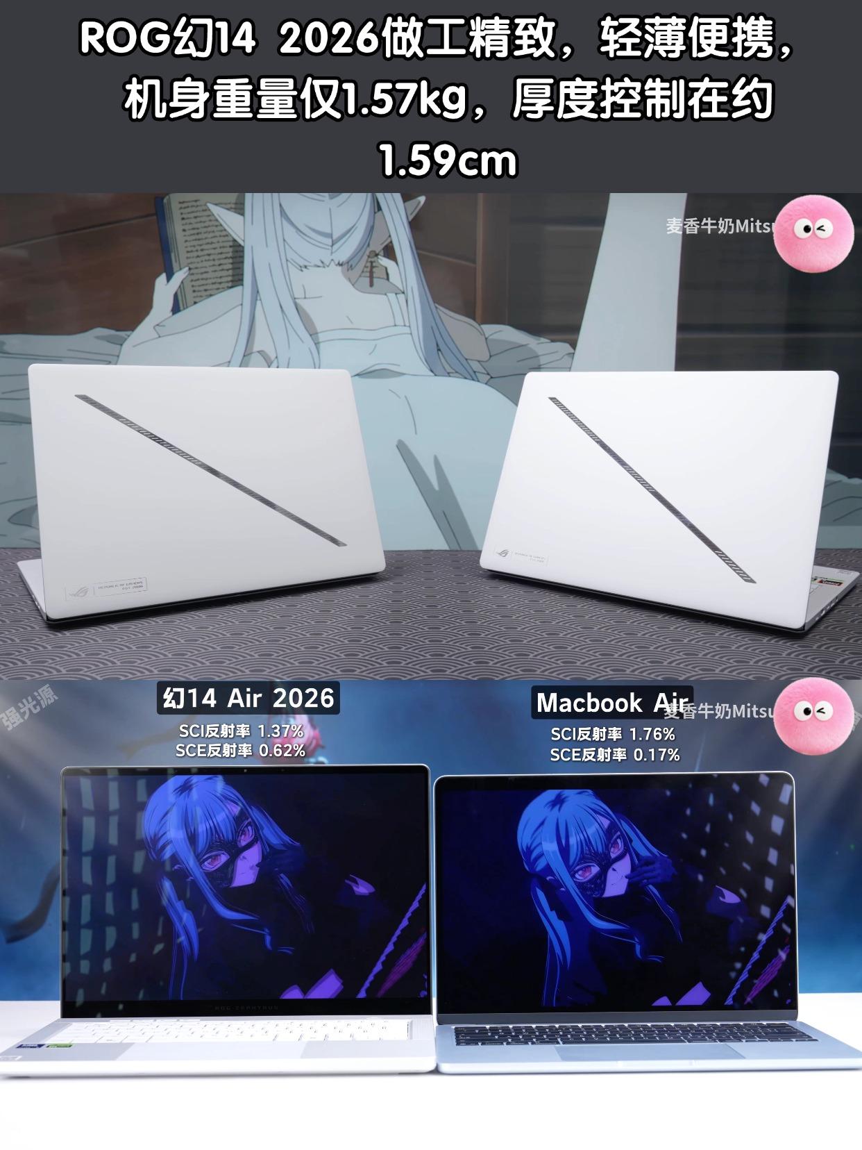 看完同框对比才懂,ROG幻14 Air有多极致 刚看了一个博主的上手视频,明明都是14英寸的笔记本,ROG幻14 Air 2026看起来就是小巧一圈,视觉差特别明显。 - ROG 幻14Air 2026屏幕黑边非常窄,机身设计非常紧凑,能把14英寸屏幕塞进了更小的模具里ROG确实有点东西,再加上1.57kg的重量和1.59cm的厚度,平时通勤、出差塞包里,几乎感觉不到负担。 - 别看它小,内在完全没缩水。据说这次冰川散热架构大升级,用上了液金导热和VC均热板,全新Panther Lake处理器Ultra 9 386H,高性能也能稳稳压住,长时间用也不烫手,双烤可以跑到接近150W,足以玩许多大型3A了,而且续航成绩非常意外,博主测试有16小时24分钟,超过很多核显轻薄本! - 同时2.8K 120Hz OLED星云屏也升级了,亮度更高还有抗反射涂层,对比苹果MacBook一点也不输,户外看也清晰,色彩和观感都顶级。 - 感觉这次新一代的ROG幻14 Air确实接近最理想的状态了。 - 笔记本电脑 电脑 ROG