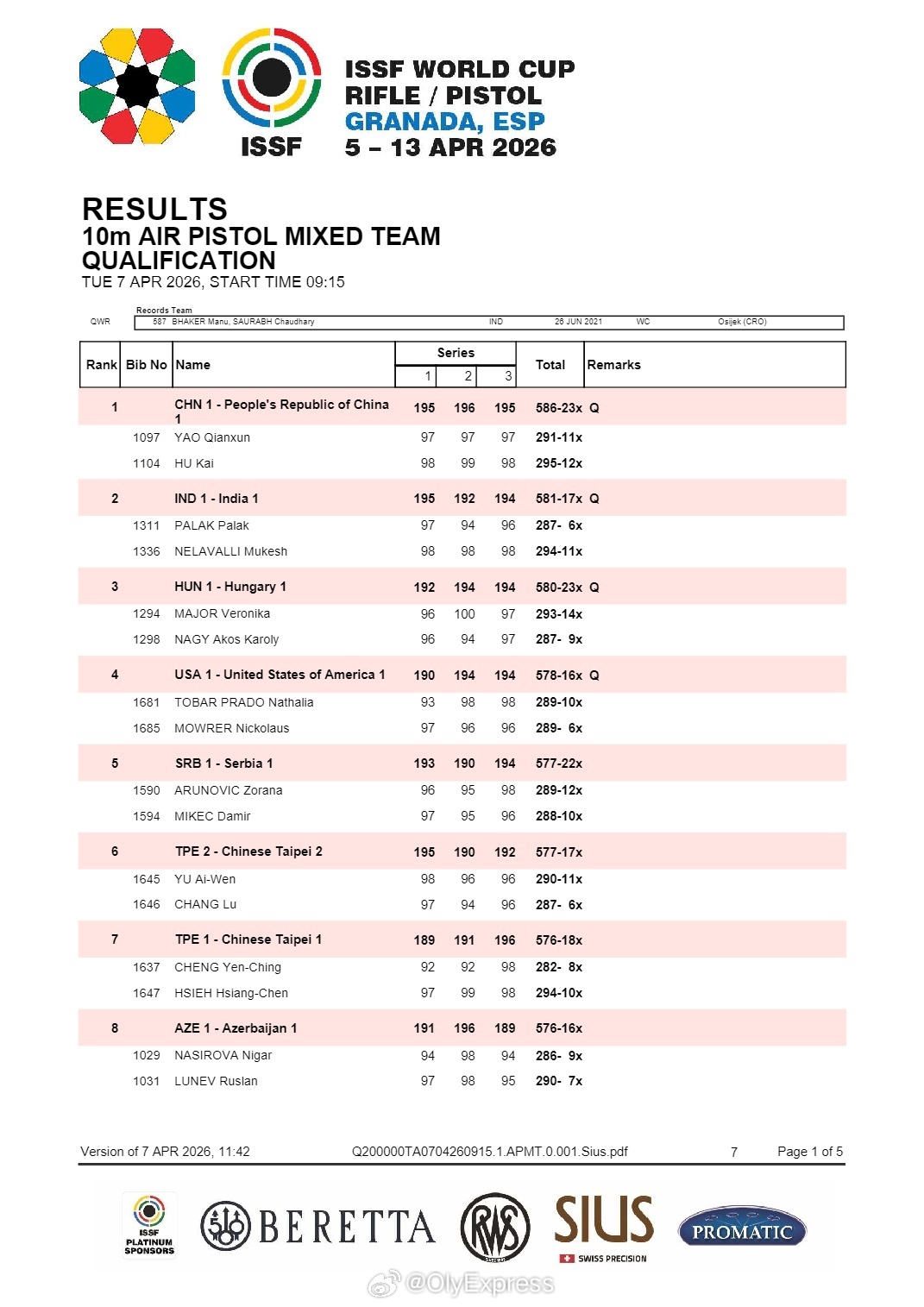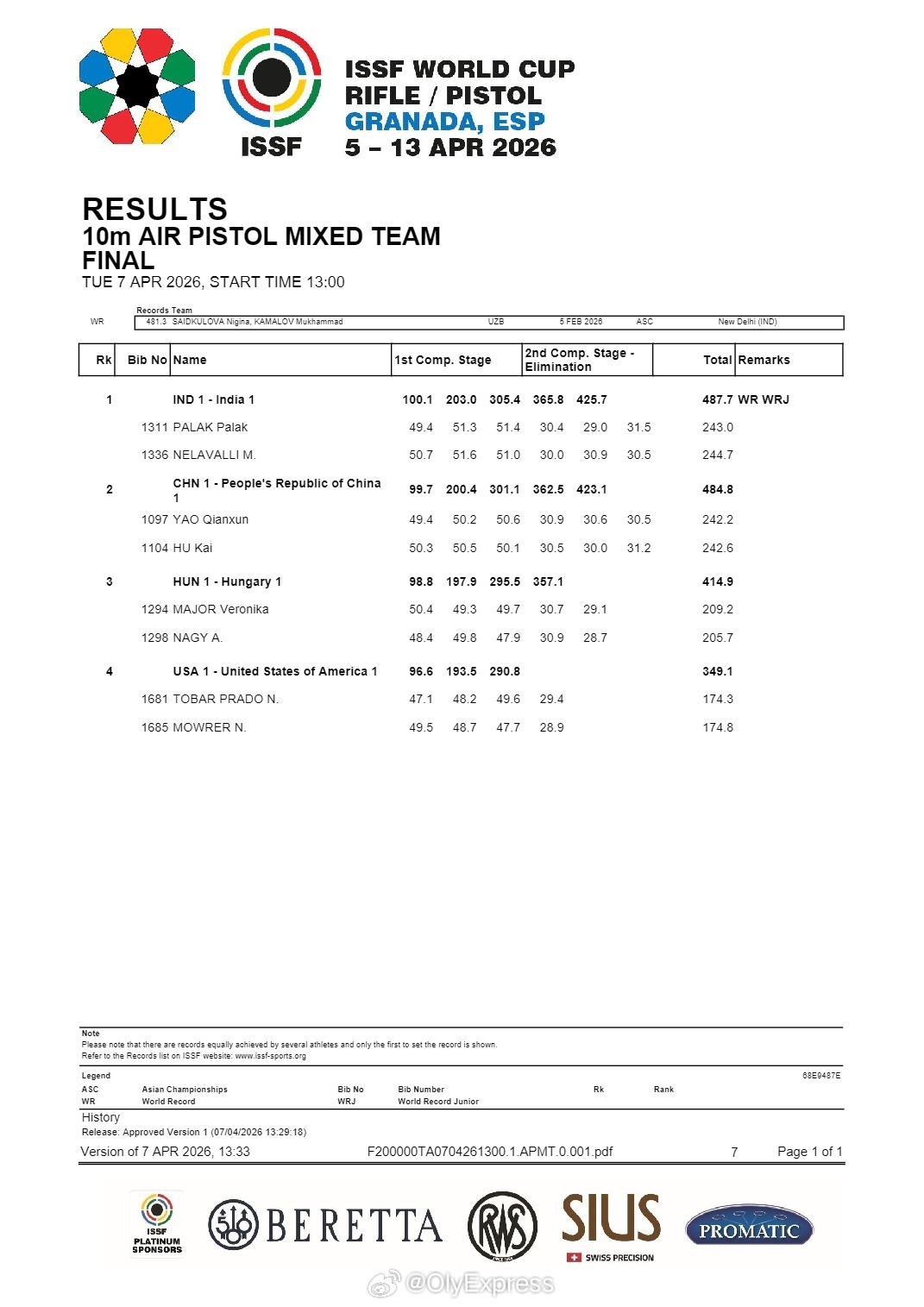 【射击世界杯气手枪混团印度破世界纪录夺冠 中国摘银】国际体坛战报速递 4月7日西班牙格拉纳达,射击世界杯(步手枪)西班牙站产生首金。在10米气手枪混合团体比赛中,印度组合帕拉克/内拉瓦利以2.9环的较大优势夺得冠军,资格赛排名第一的中国选手姚千寻/胡凯起伏较大,获得银牌。匈牙利梅哲/纳吉获得铜牌。帕拉克/内拉瓦利决赛487.7环还创造了新的世界纪录,将原纪录提高了6.4环!本次比赛采用了全新赛制,资格赛前四名进入决赛,以累积总环数决定胜负,而不是上一周期前两名争金牌、三四名争铜牌,以先到17分定输赢。另外一对中国组合沈奕瑶/谢瑜未能进入决赛,谢瑜似乎有一枪脱靶。