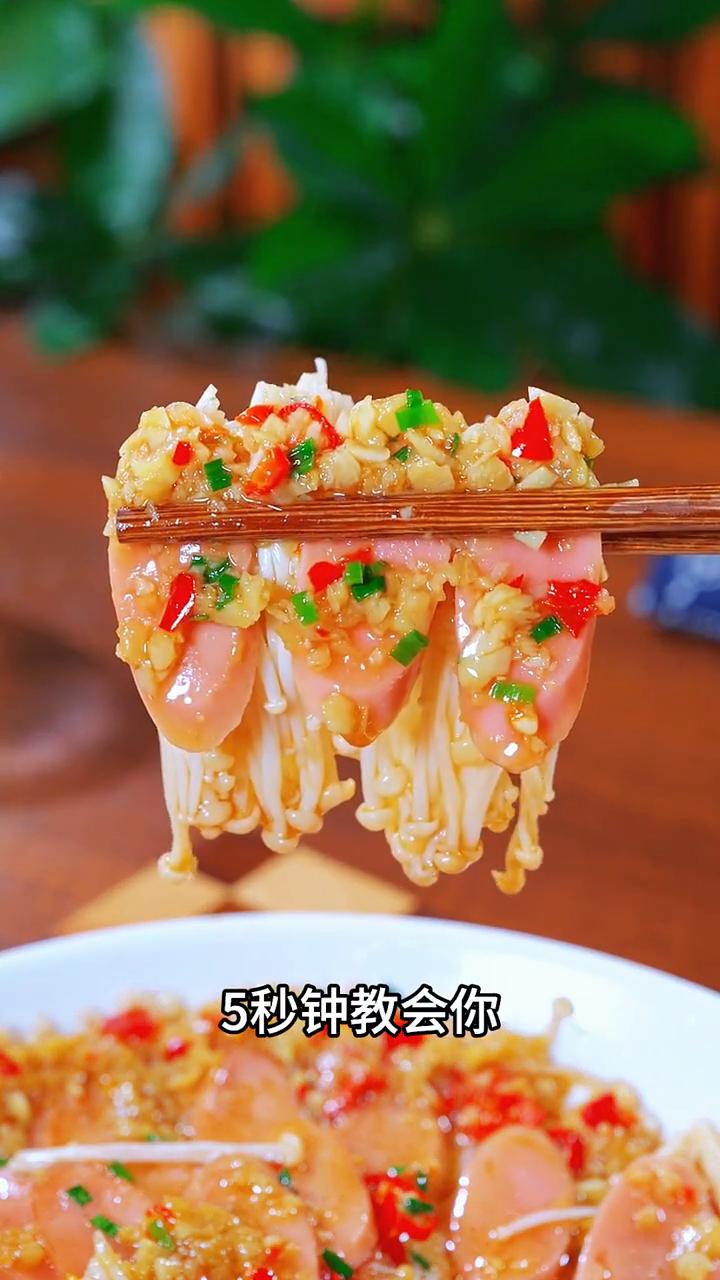 蒜蓉金针菇。 家人们注意看,这是网上最近很火的金针菇新吃法,大酒店一份要卖128,自己在家做成本还不到3块,蒜香入味,好看又好吃,关键做法非常简单,5秒钟教会你。 ·树上摘来的金针菇去掉根部,像我这样横着切几刀,再竖着切几刀,然后整齐的摆入盘中。 ·接着碗中打入两个笨鸡蛋,火腿肠也切成片,像我这样摆成一个花开富贵的造型。 ·好吃的关键就是这个大厨按酒店配比熬制好的蒜蓉酱,有辣的和不辣的,用它来做蒜蓉花甲、蒜蓉生蚝、蒜蓉茄子都特别好吃。 ·水开上汽,大火蒸6分钟。 ·出锅淋上一圈生抽,再撒上一把迷人的小葱花,浇热油激发出香味即可。 这样做出来的蒜蓉金针菇,蒜香入味,好看又好吃,一上桌全家人都抢着吃。 不知道这个蒜蓉酱哪里有卖的朋友,可以点我头像。