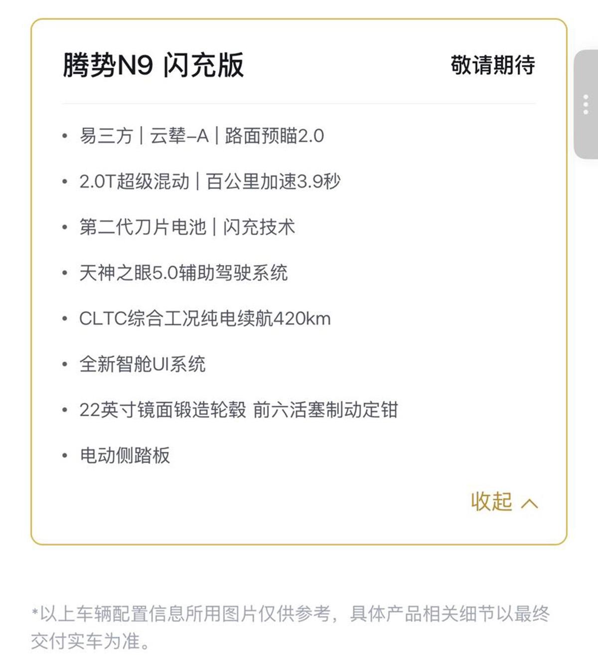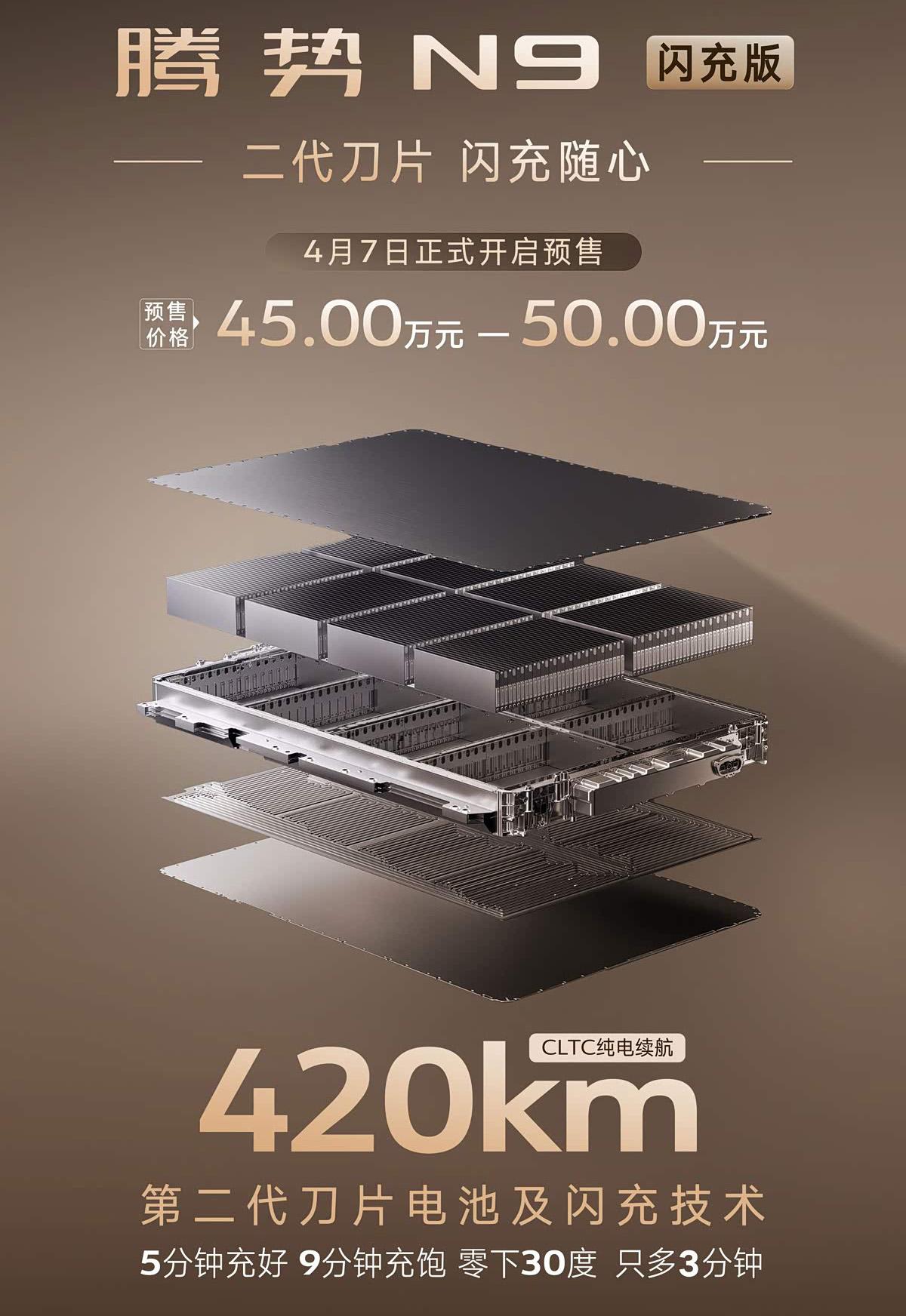 纯电续航干到了420公里的插电混动大6座SUV,腾势N9闪充版要来了。 今天腾势公布了腾势N9闪充版的预售信息,预售价区间45万-50万元。 闪充版的腾势N9将会标配第二代刀片电池及闪充技术,CLTC纯电续航里程干到了420公里,比现款的翻了一倍还多。 如果只是日常短途代步,基本可以当做纯电车来开了,即便跑长途,420公里车的纯电续航可能也用不了多少油,因为有了闪充加持,到服务区不用上卫生间的时间也能充满,啥焦虑都没了。 闪充版还会标配天神之眼5.0辅助驾驶系统,再加上易三方(标配)、云辇-A、路面预瞄2.0、新一代AI智能座舱(标配),整个安全、舒适、性能、便利、能耗经济性基本全都拉满了。