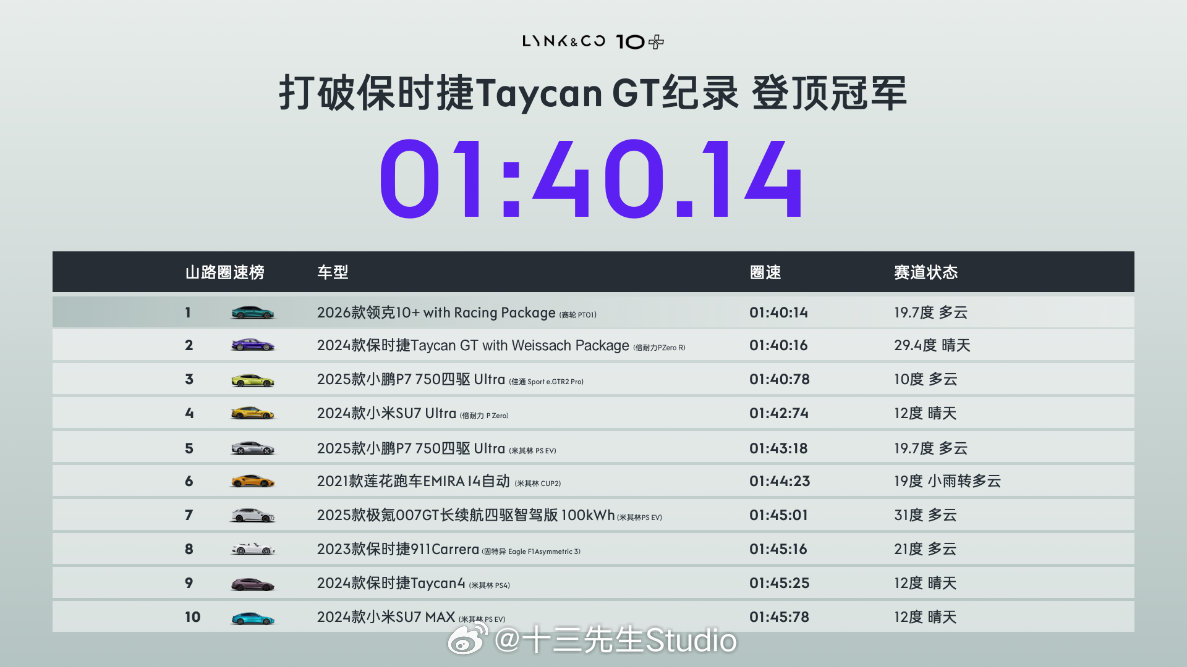 驾驶层面,提供在方性能套件,包含可调碳纤维大尾翼、21英寸锻造轮毂、BREMBO打孔刹车盘+赛用竞技刹车片配四活塞定钳,领克10+ 以1分40秒14的山路圈速成绩超越保时捷Taycan turbo GT,取得亚洲山脊赛道圈速第一。