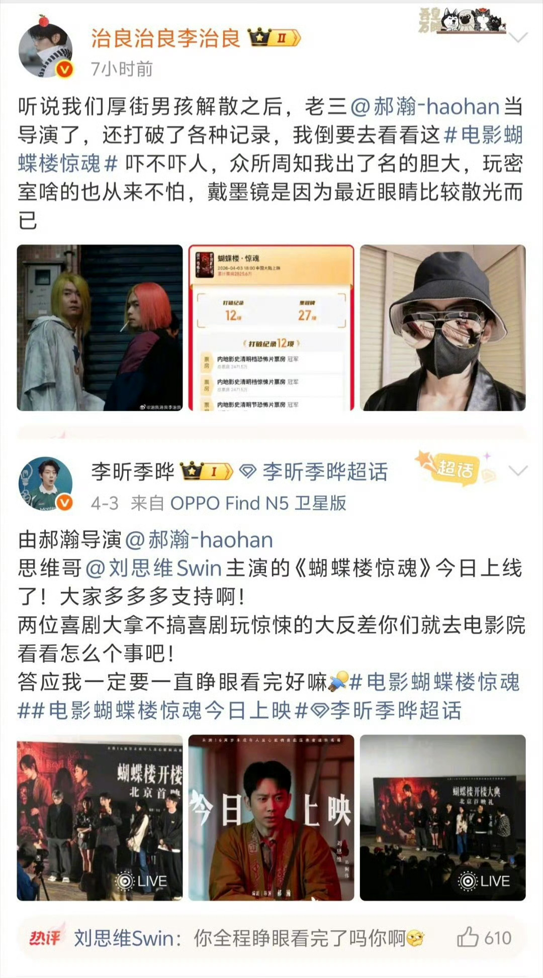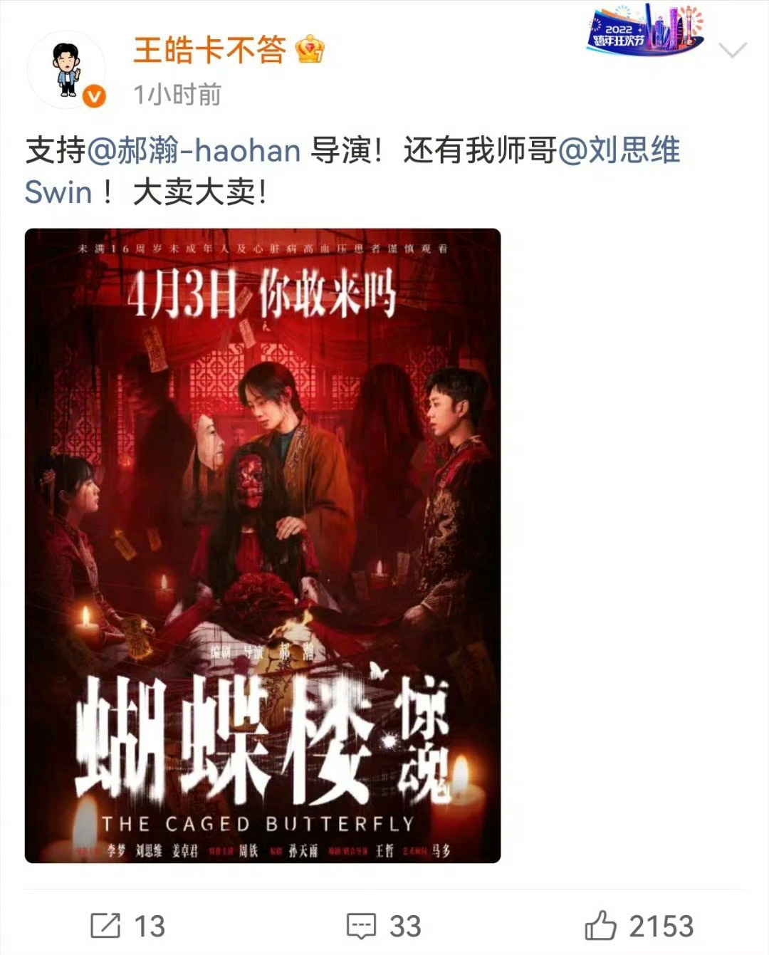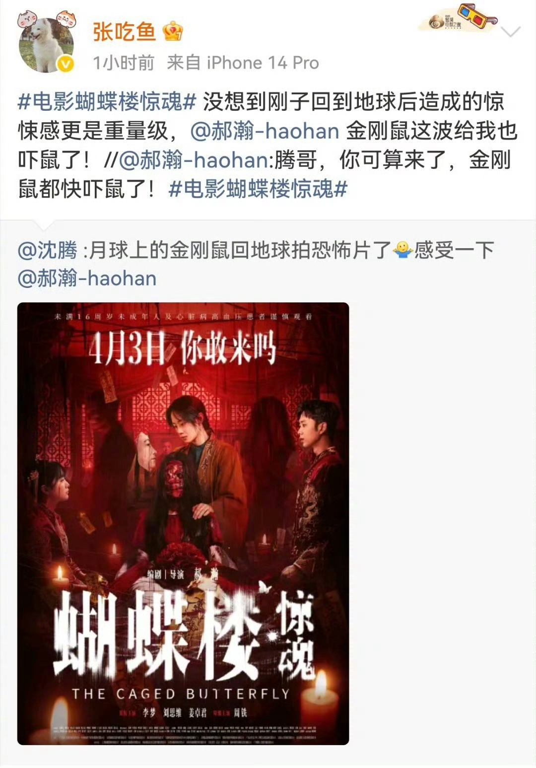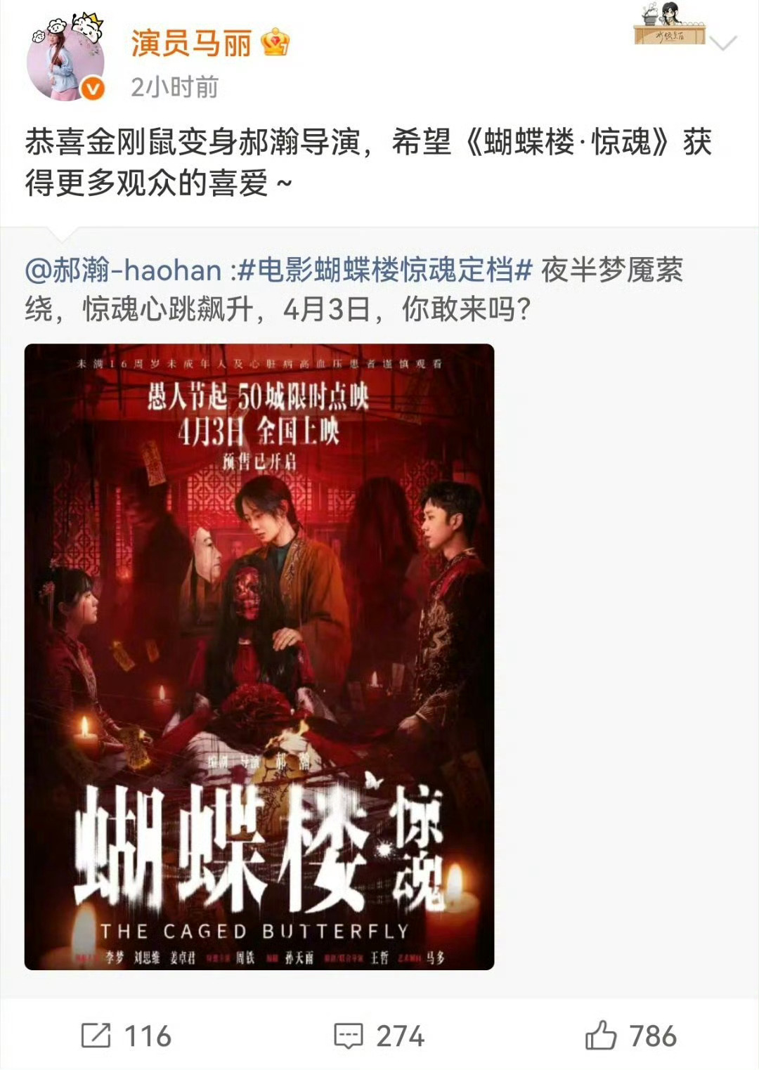 沈腾马丽为蝴蝶楼惊魂打call蝴蝶楼最强喜剧人应援《蝴蝶楼·惊魂》排面拉满!沈腾、马丽领衔一众喜剧人集体打call,从金刚鼠转型导演的郝瀚新作也太让人期待了。全员一边被吓到一边疯狂应援,喜剧人跨界拍惊悚片,好奇感直接爆棚!