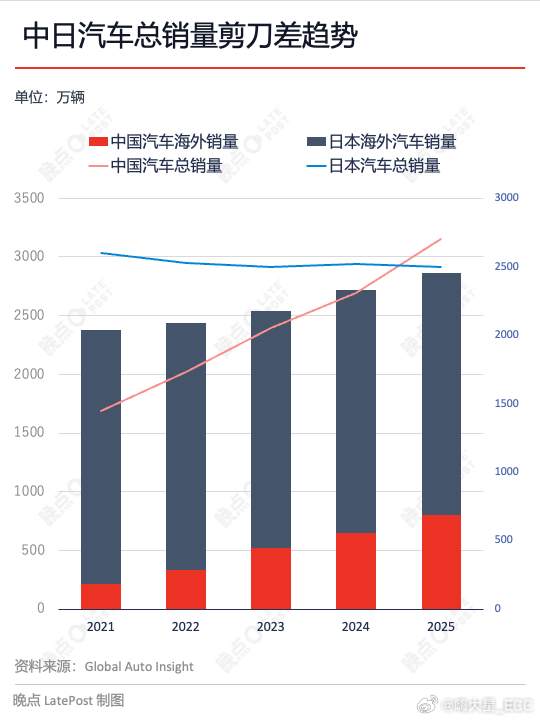 2025 年中国车企全球销量约 2700 万辆,首次在总量上超车日本。但剥离内需再看,真实的海外战场依然残酷——日系车海外销量 2060 万辆,中国车企只有 800 万辆。日系基本盘,稳得吓人。