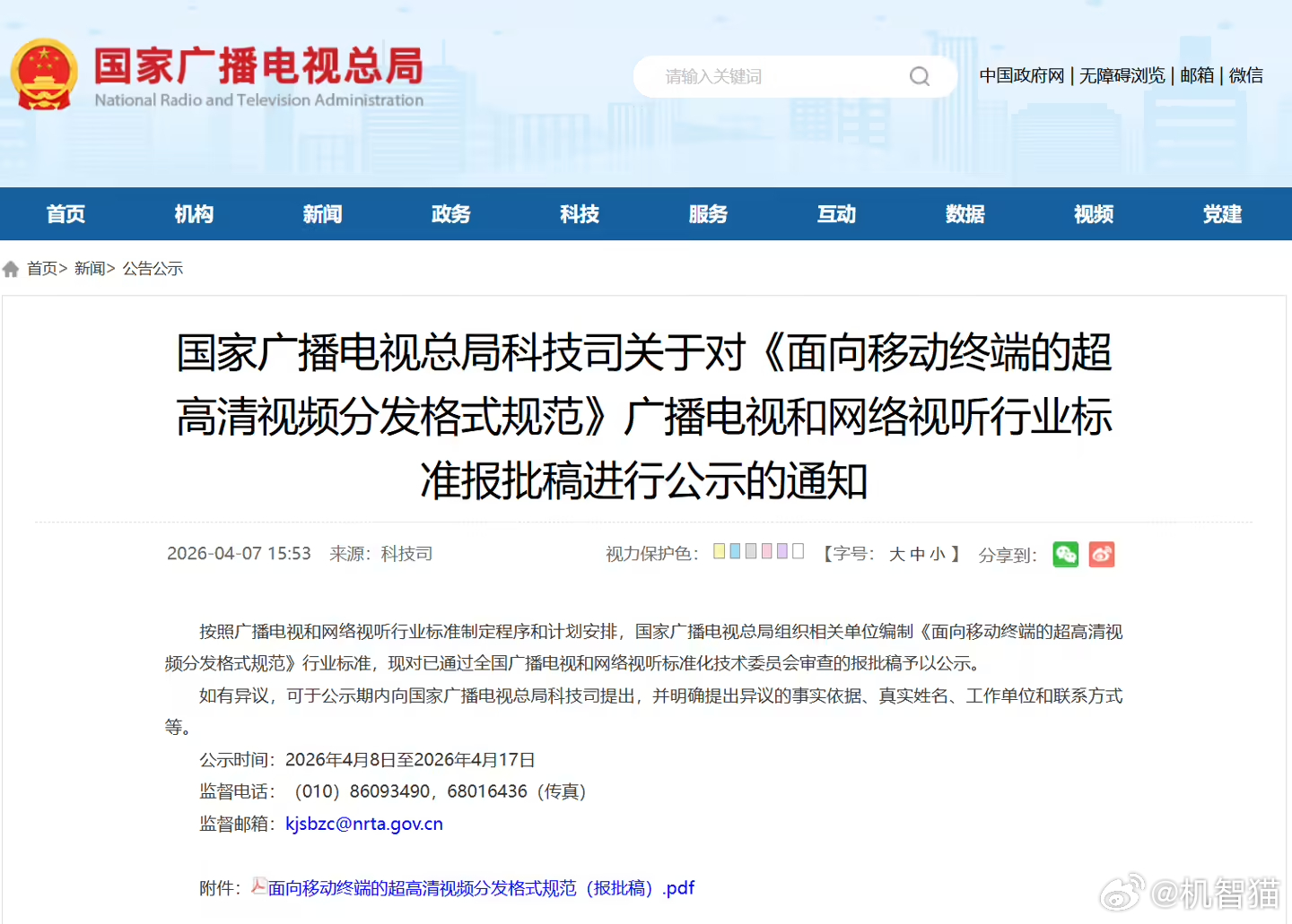 国家广播电视总局科技司今日发布关于对《面向移动终端的超高清视频分发格式规范》广播电视和网络视听行业标准报批稿进行公示的通知。