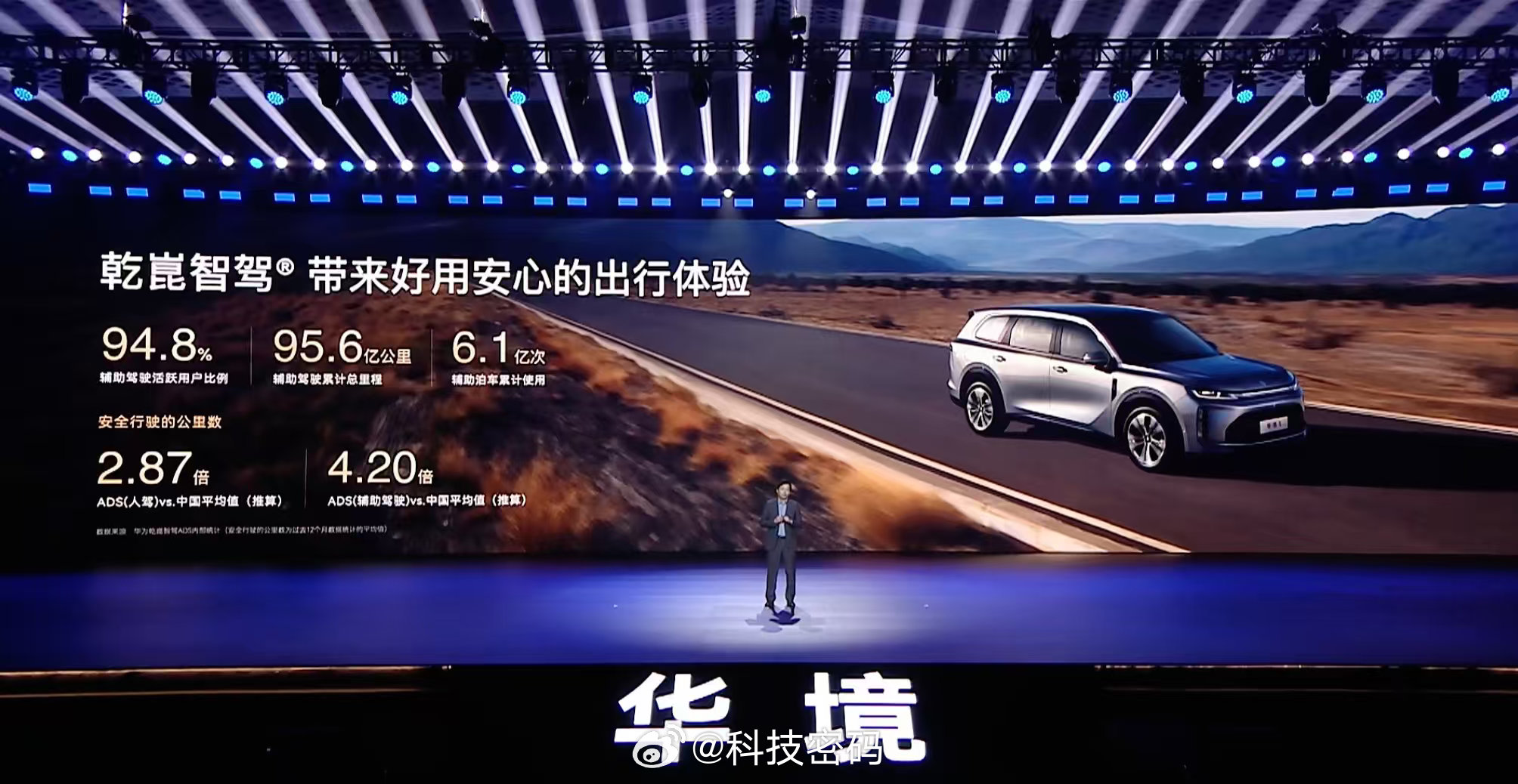 今晚这场发布会,华为乾崑的出行数据永远都值得单独拿出来说。根据4月最新华为乾崑出行报告显示,截止2026年3月31日,华为乾崑智驾累计辅助驾驶里程达95.6亿公里,活跃用户占比94.8%,辅助泊车累计使用6.1亿次!ADS人驾模式下,每发生一次严重碰撞前的安全行驶里程,是中国人驾安全里程平均值的2.87倍;辅助驾驶模式下,更是达到4.2倍。华为乾崑用公开透明的硬核数据,证明乾崑智驾是真正好用、用户爱用的辅助驾驶,安心出行,还得看华为乾崑!华境S全系标配华为乾崑华境S全维安全王中王4月7日华境S全球首发华为乾崑大六座华境S开启预订