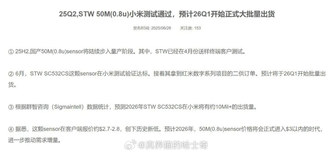 国产供应链的崛起是好事儿,所有国产厂商都收益,但是我估计后面一定有人说思特威是其它企业扶持起来的国产供应链。