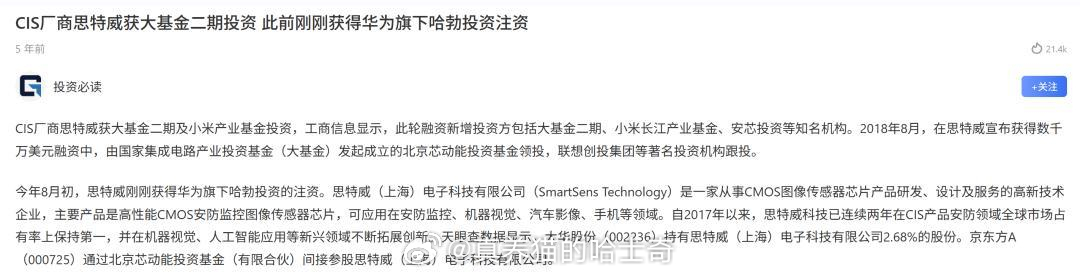 思特威真算是华子一手扶起来的,给钱又给订单,之前华为投资了这家公司,旗舰机上的芯片也是在它家定制的,不然根本没几个人知道这家公司,它以前是做安防的CIS的。后来小米也投资了它,去年就传出了小米也要用思特威的芯片。