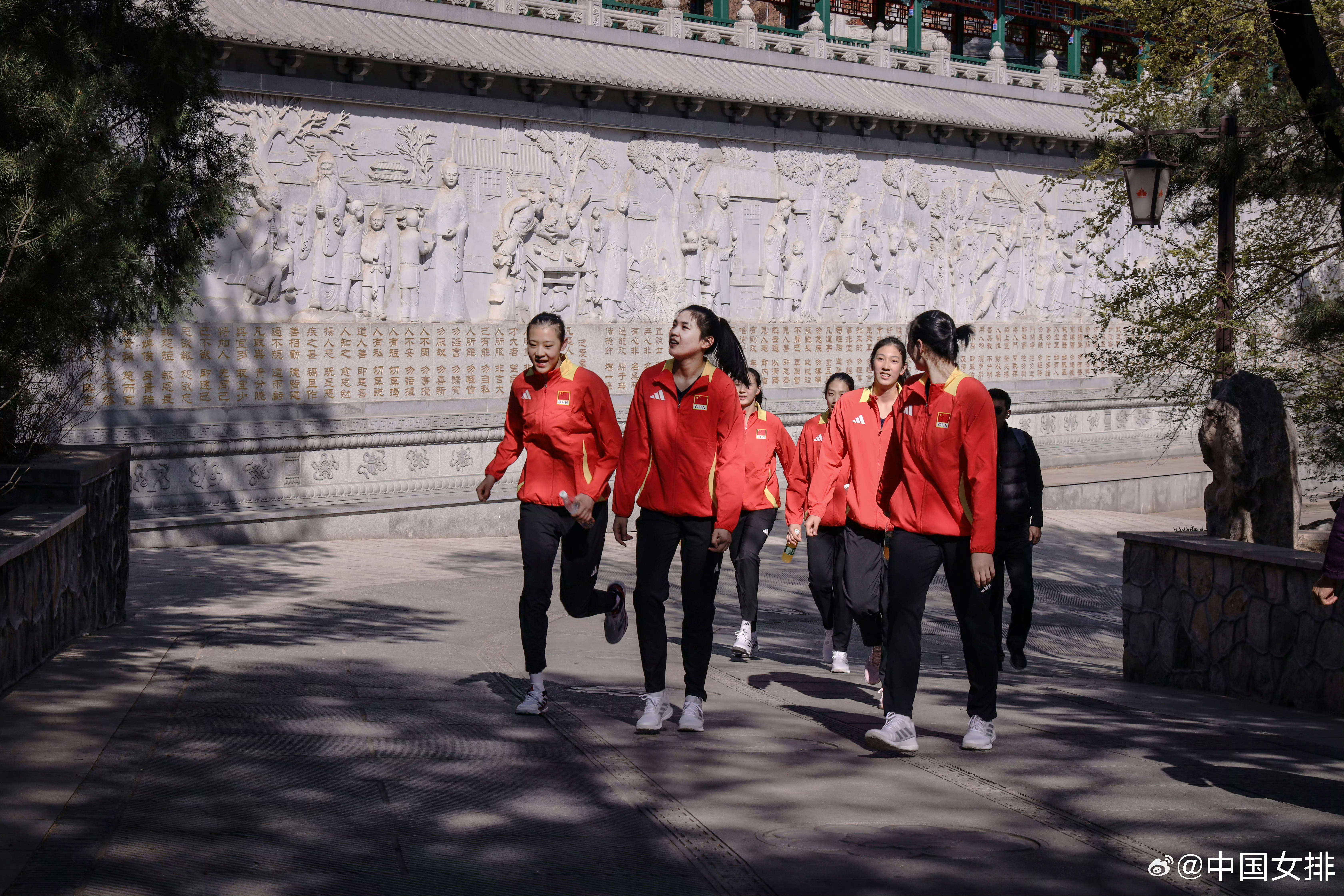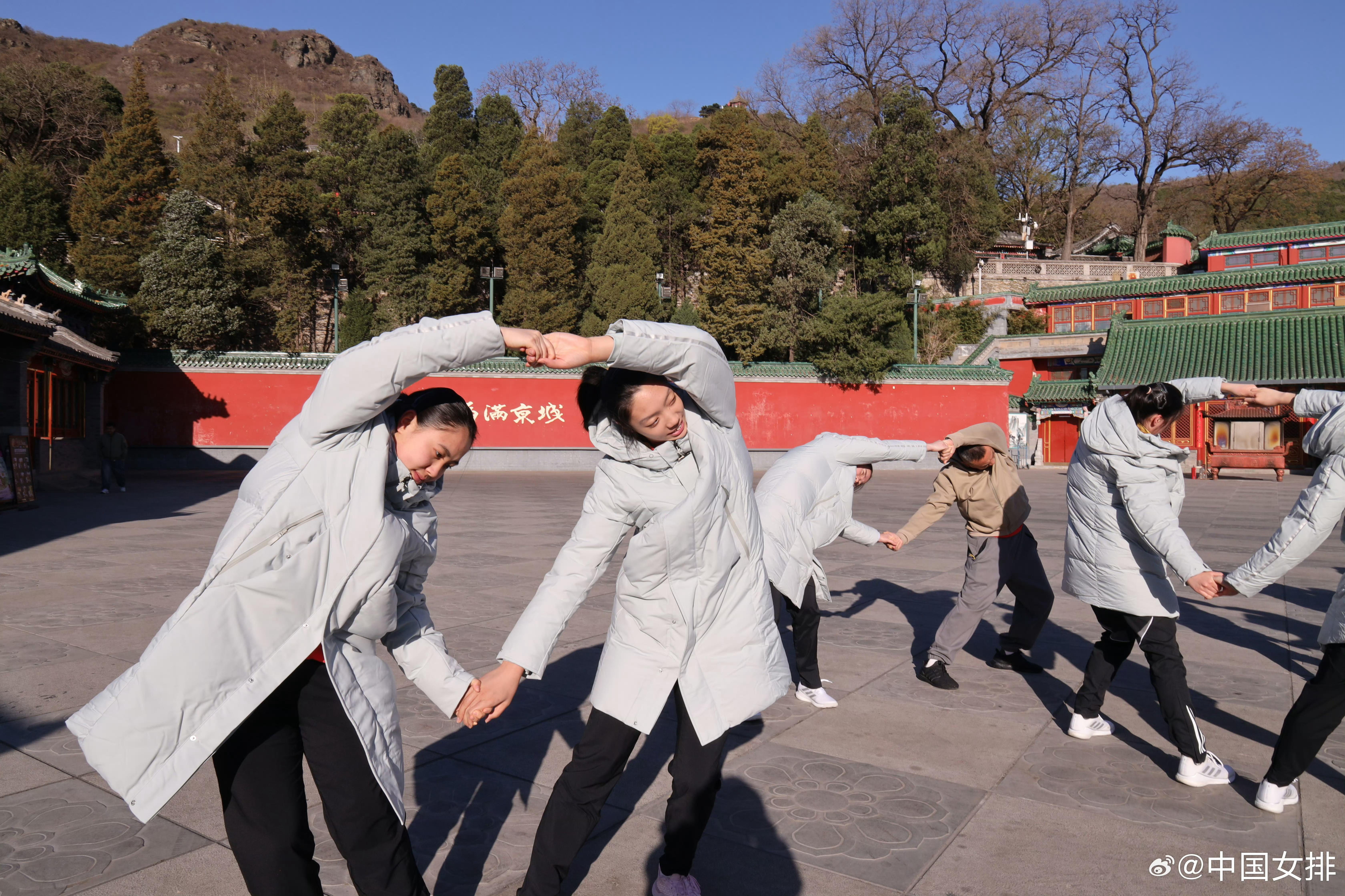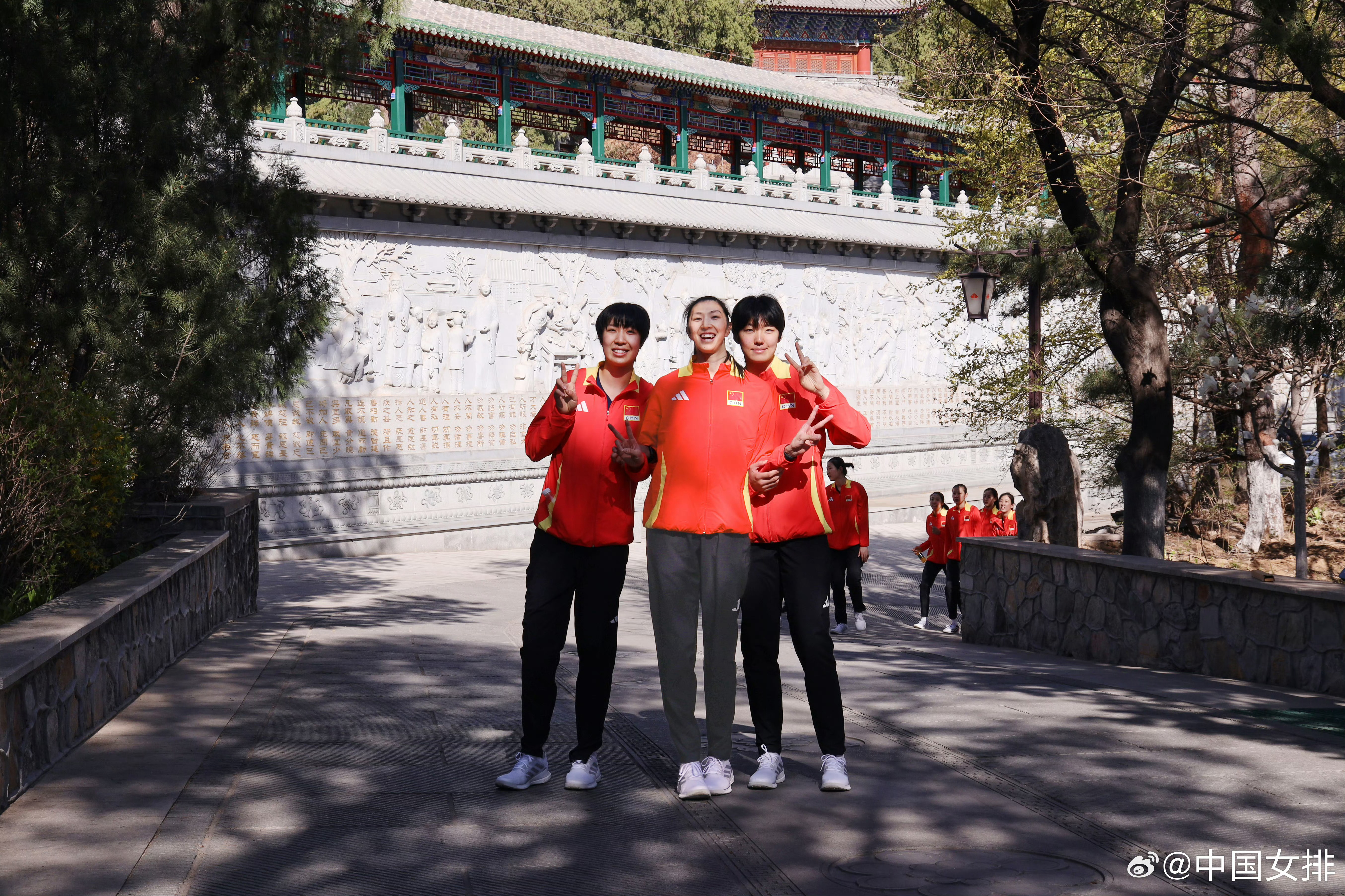 4月7日上午,2026年中国女排首批集训名单中的15名运动员在北京西山八大处公园