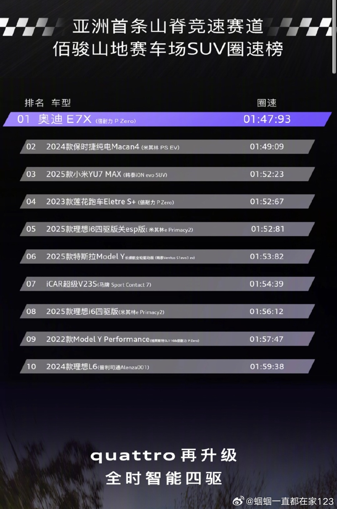 奥迪登顶亚洲山脊赛道最速SUV如何才能证明自己车型操控性好?那就是跑各种赛道。如何证明自己的SUV操控性好?那就是跑山。德系车一直以来都是以扎实的底盘和优秀的操控性能为核心基因。保时捷taycan gt在号称“中国版纽博格林”的佰骏上,用1分40依旧捍卫着自己的王者地位。同为德系的奥迪自然也是其中最好的代表之一。1分47的圈速力压保时捷Macan拿下最速SUV。所以...的YU7啥时候也去跑一跑试试看呢大v聊车