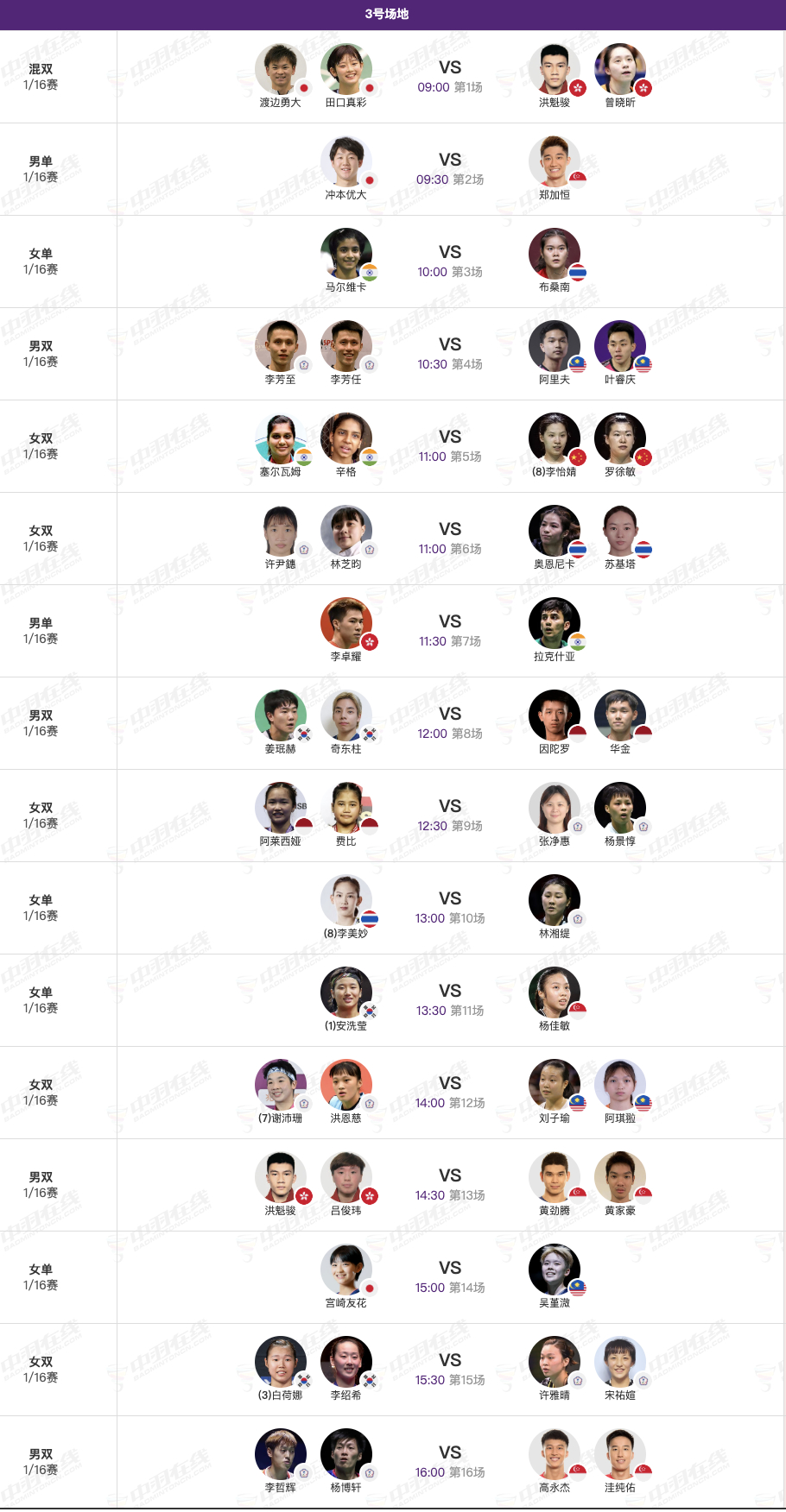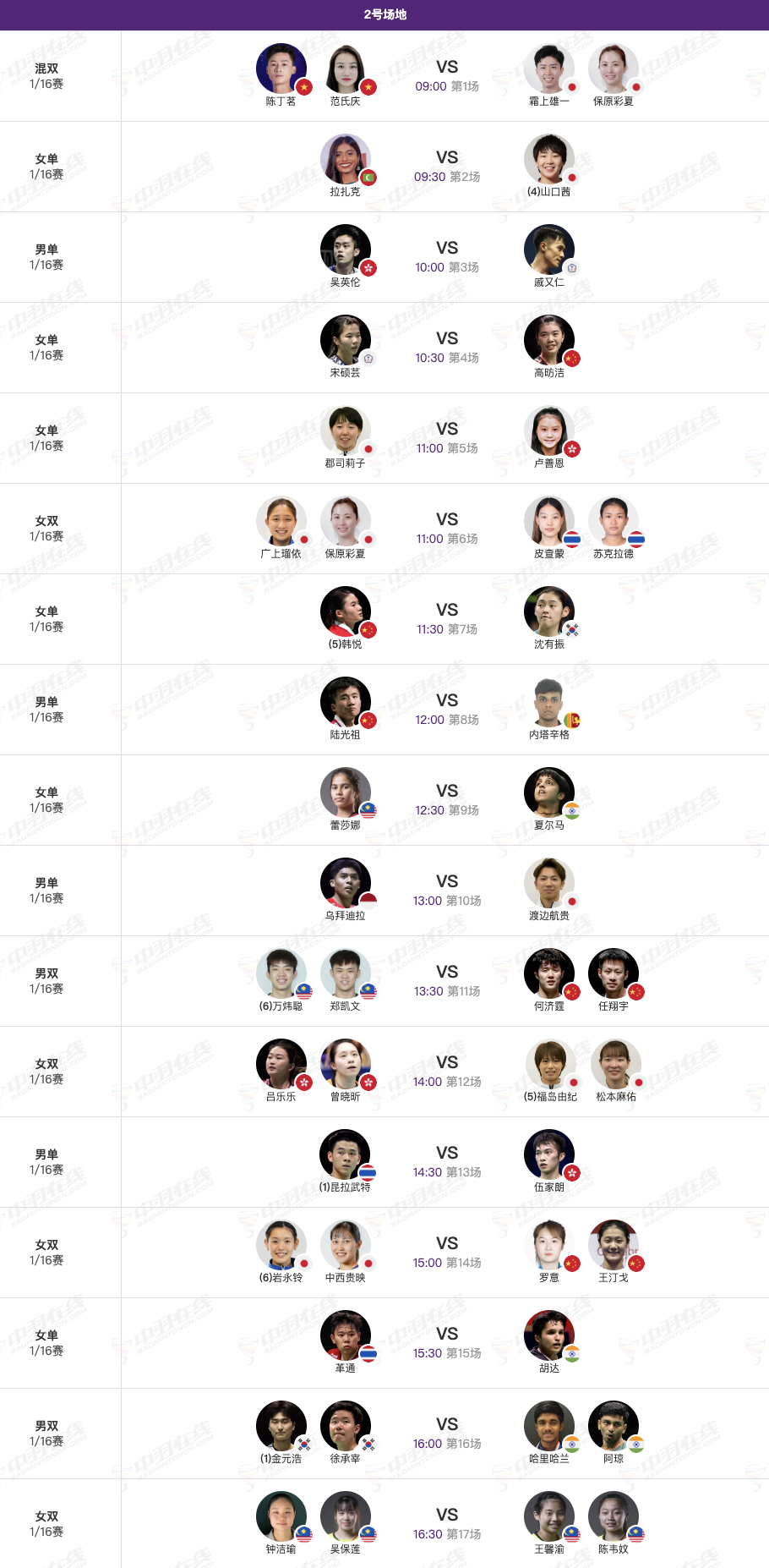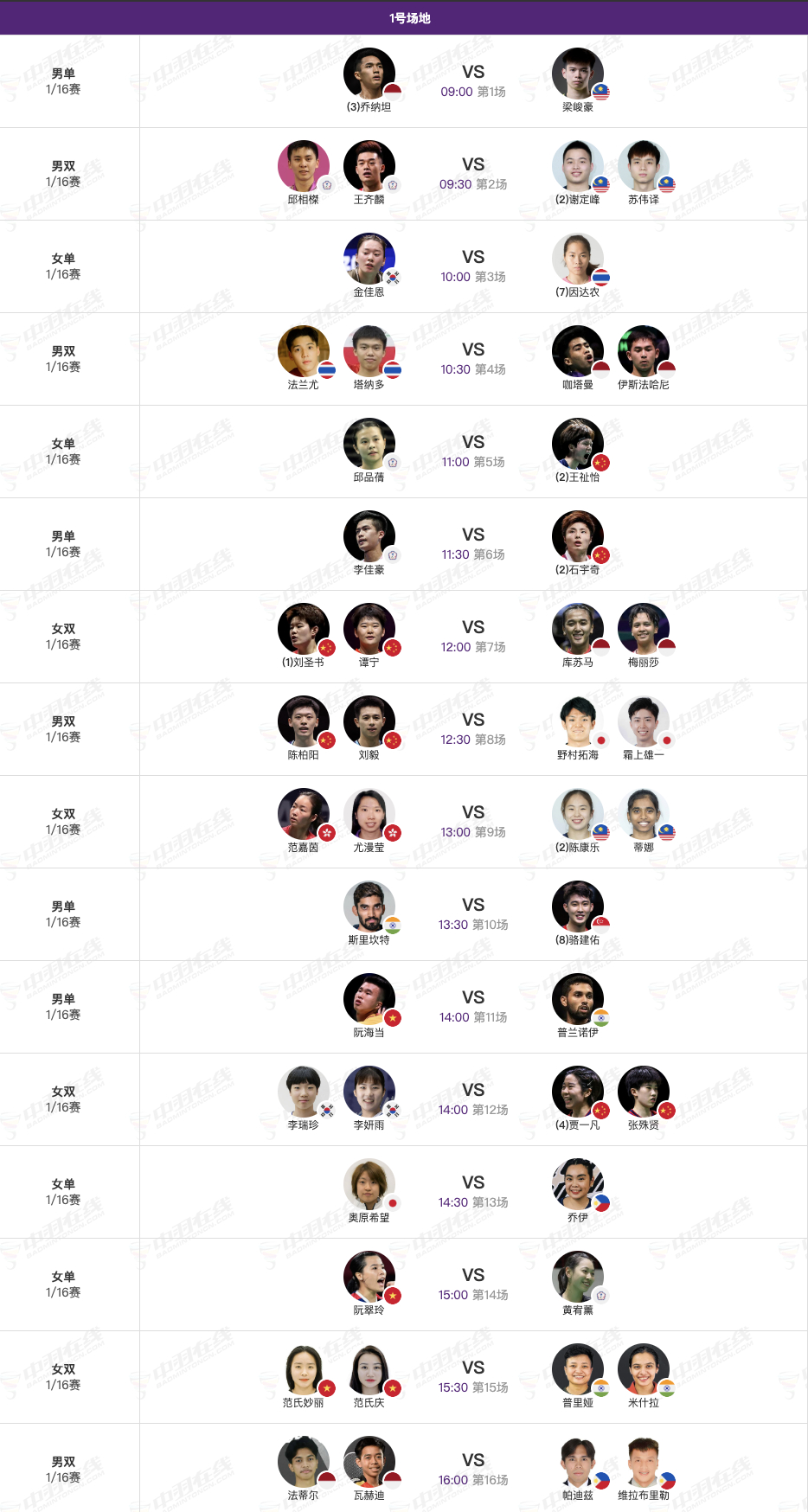 【1号场地】5、王祉怡🇨🇳 vs 邱品蒨(2-0)6、石宇奇🇨🇳 vs 李佳豪(2-0)7、刘圣书/谭宁🇨🇳 vs 🇮🇩库苏马/梅丽莎(1-0)8、陈柏阳/刘毅🇨🇳 vs 🇯🇵野村拓海/霜上雄一(1-0)12、贾一凡/张殊贤🇨🇳 vs 🇰🇷李妍雨/李瑞珍