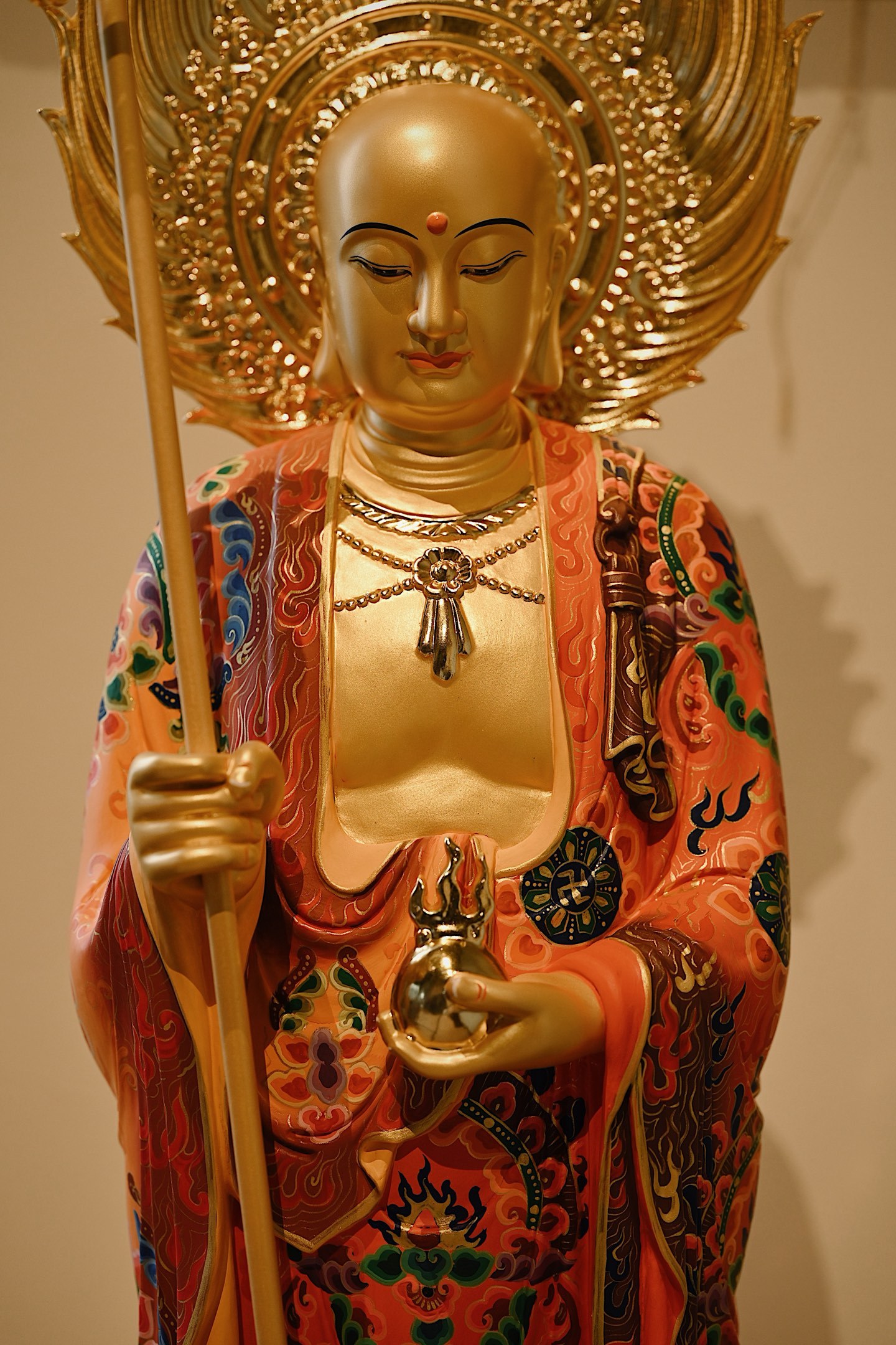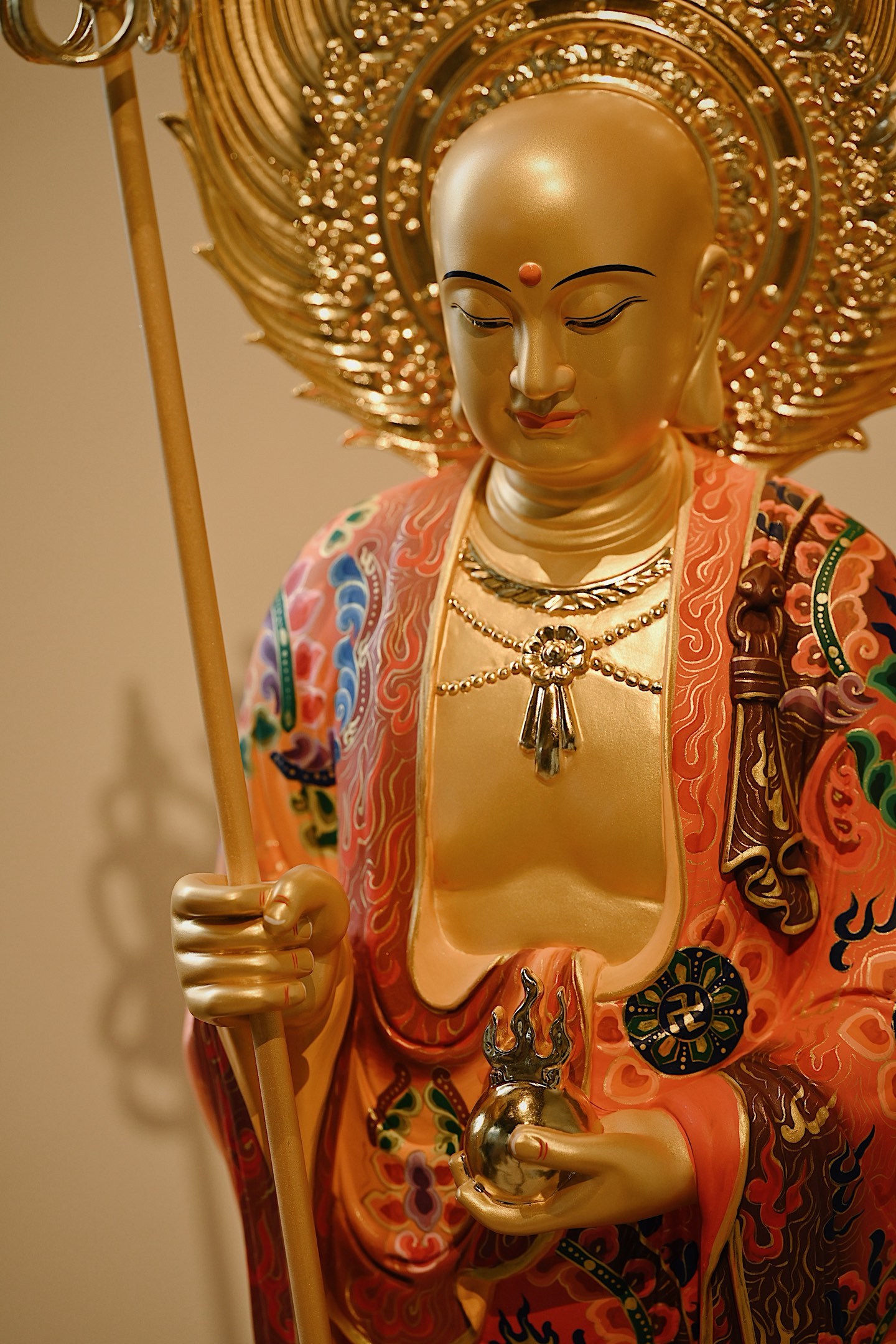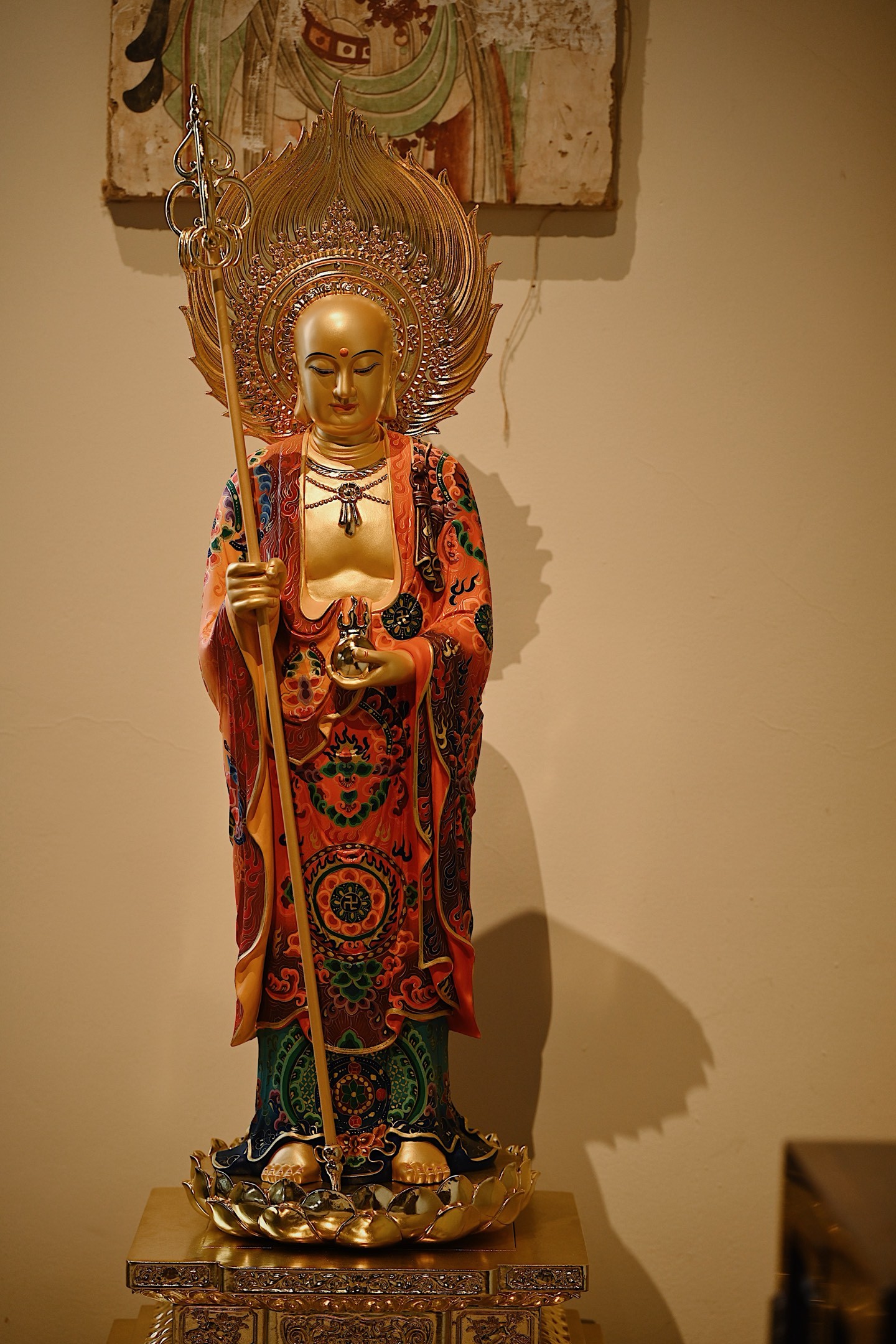 菩萨法相庄严慈悲,手持锡杖、宝珠立于莲台之上,通体鎏金,金泽璀璨;法衣满工彩绘,纹样繁复精美,色彩华丽,背光火焰如佛光,遍照十方,整体端庄威严。