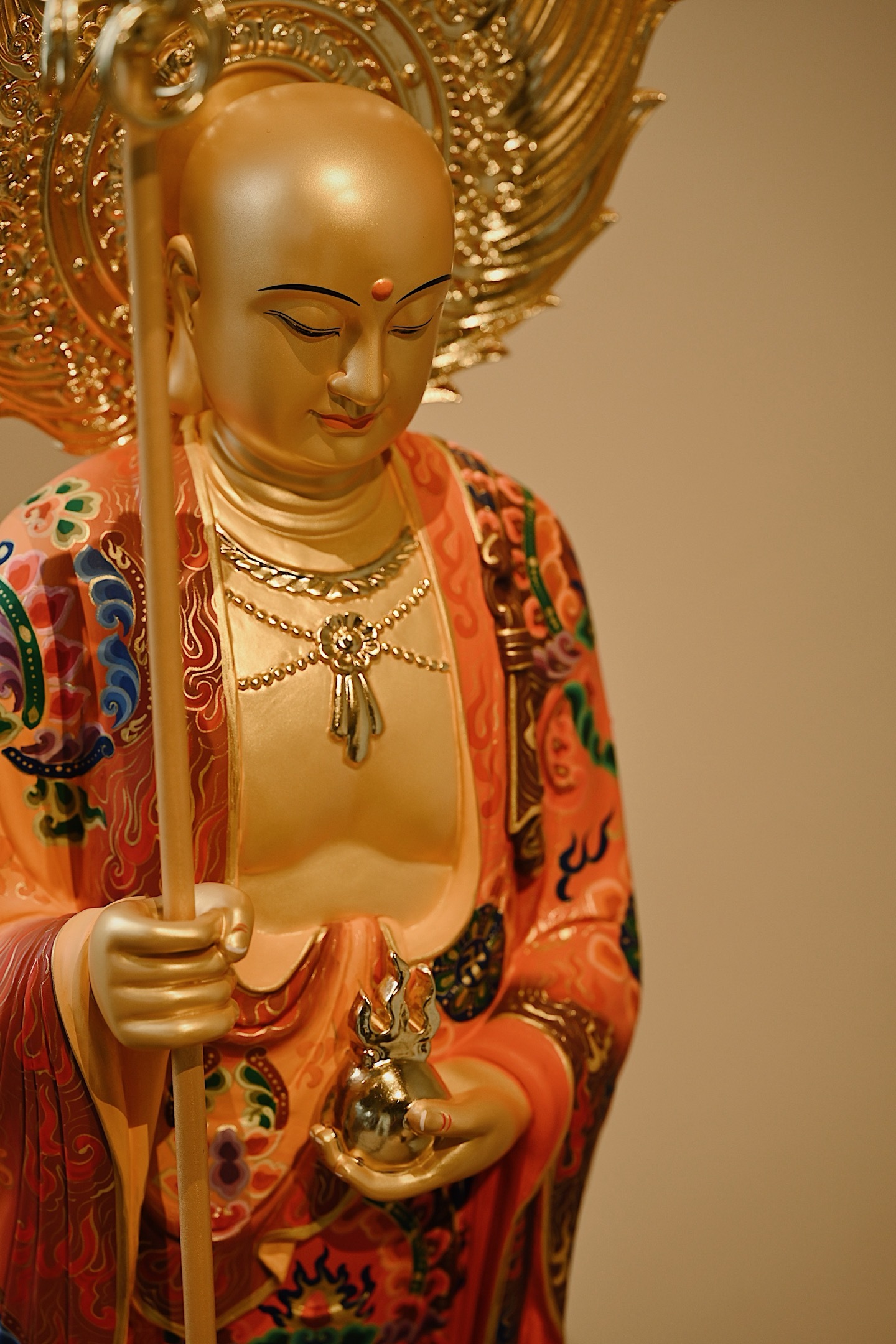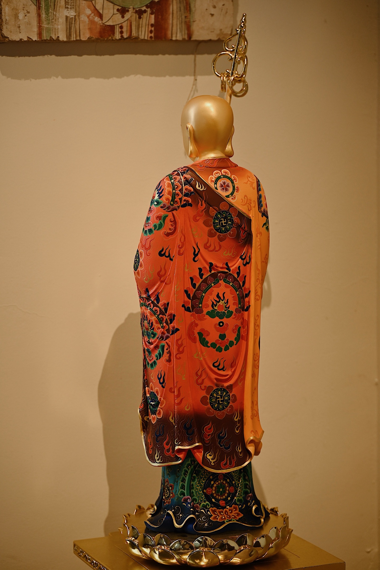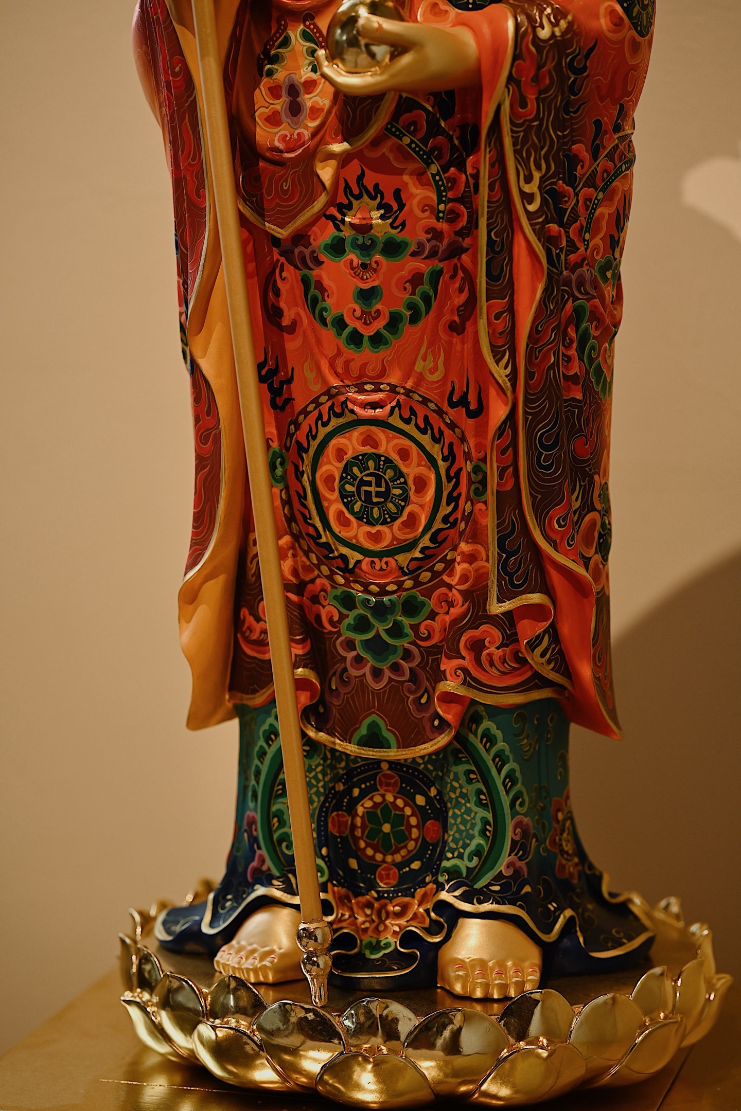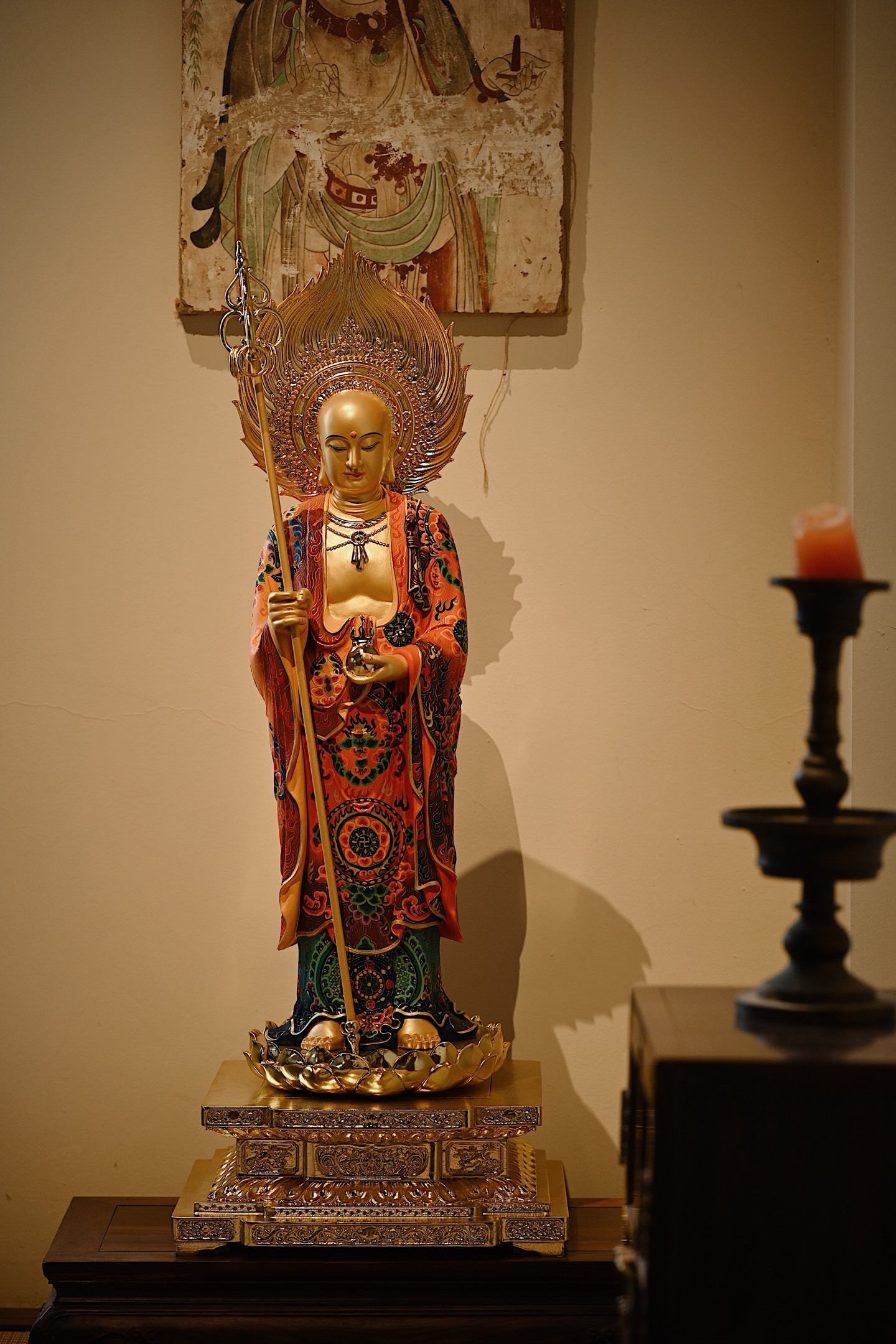 菩萨法相庄严慈悲,手持锡杖、宝珠立于莲台之上,通体鎏金,金泽璀璨;法衣满工彩绘,纹样繁复精美,色彩华丽,背光火焰如佛光,遍照十方,整体端庄威严。